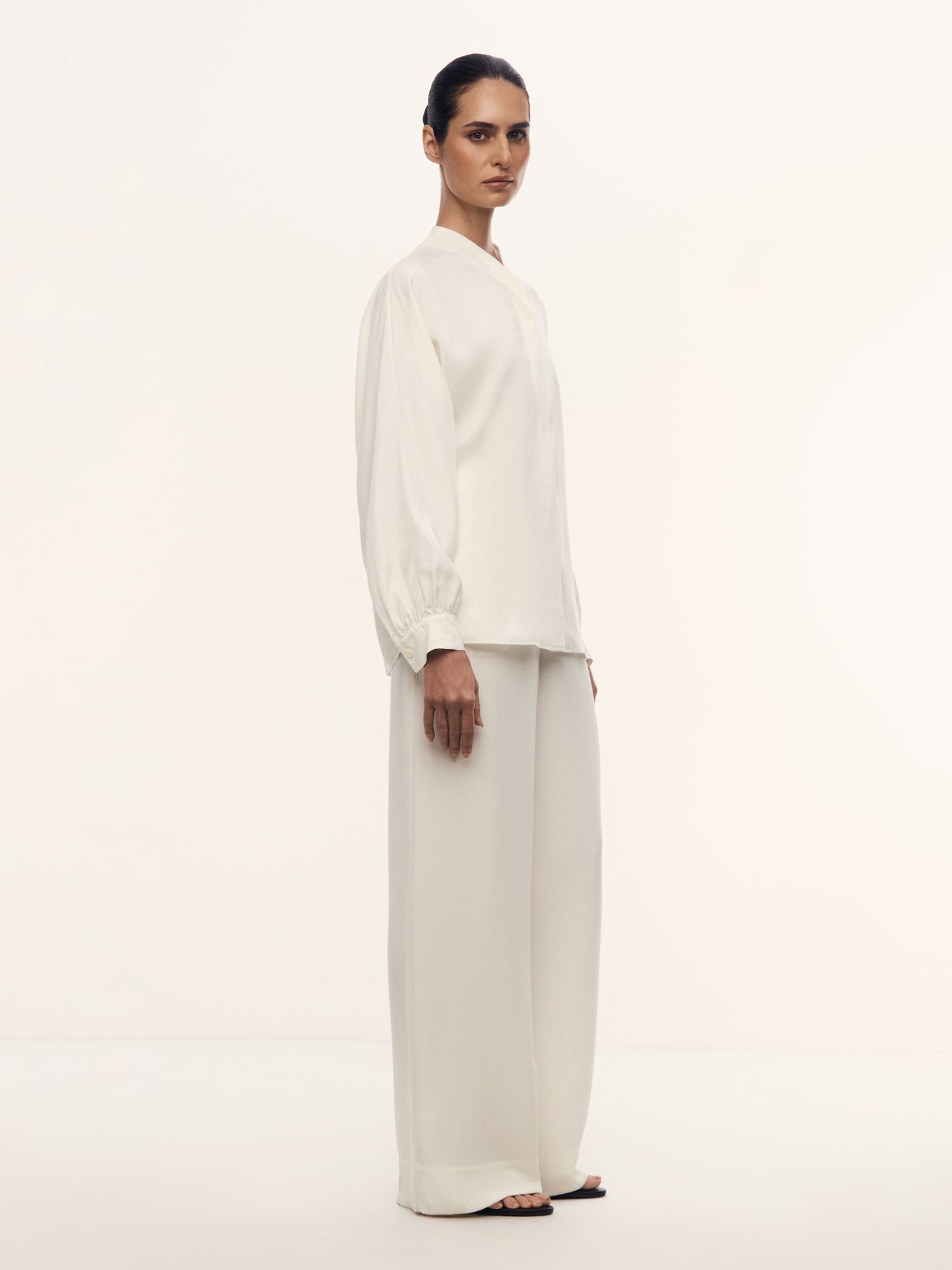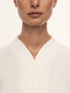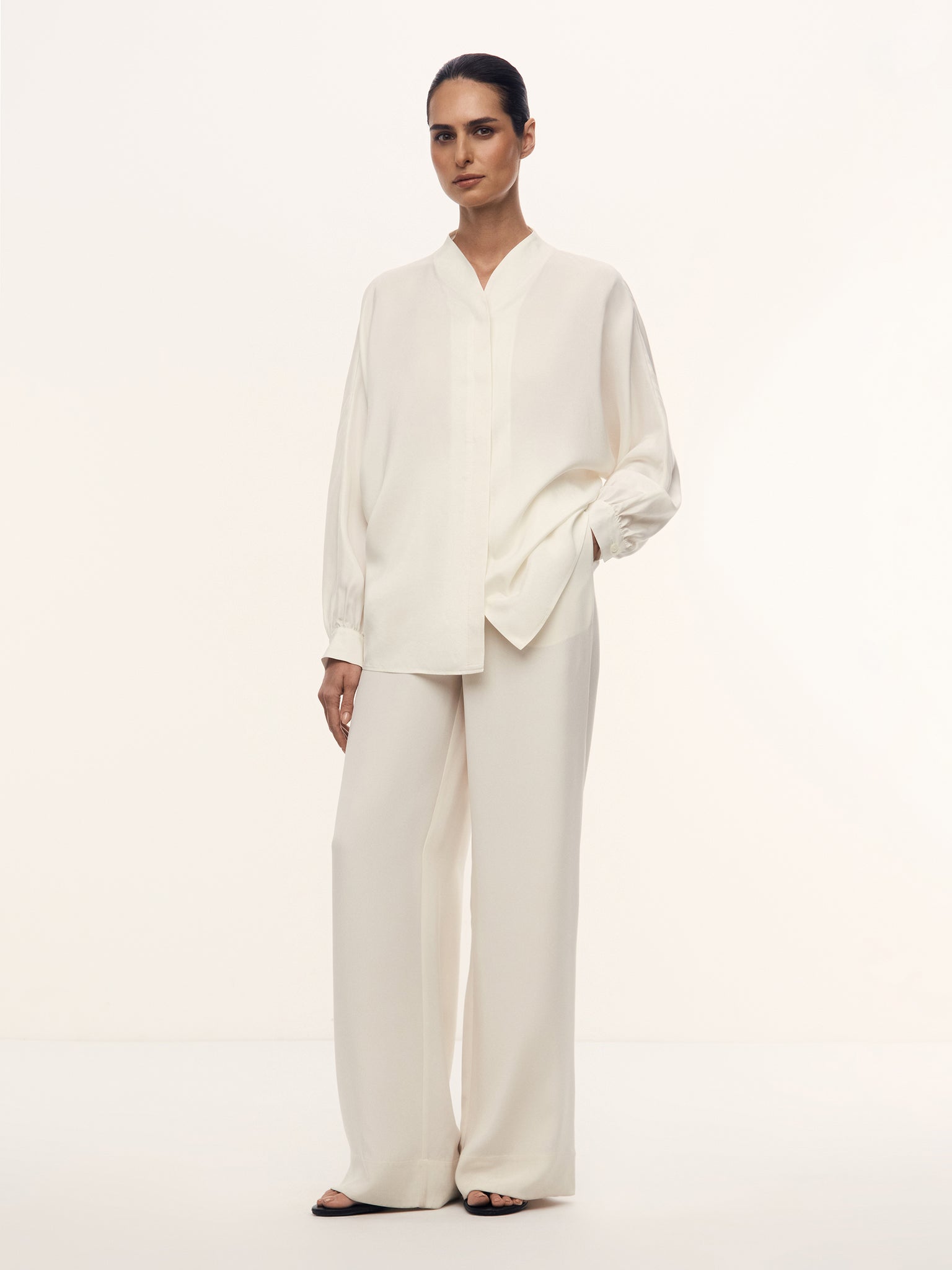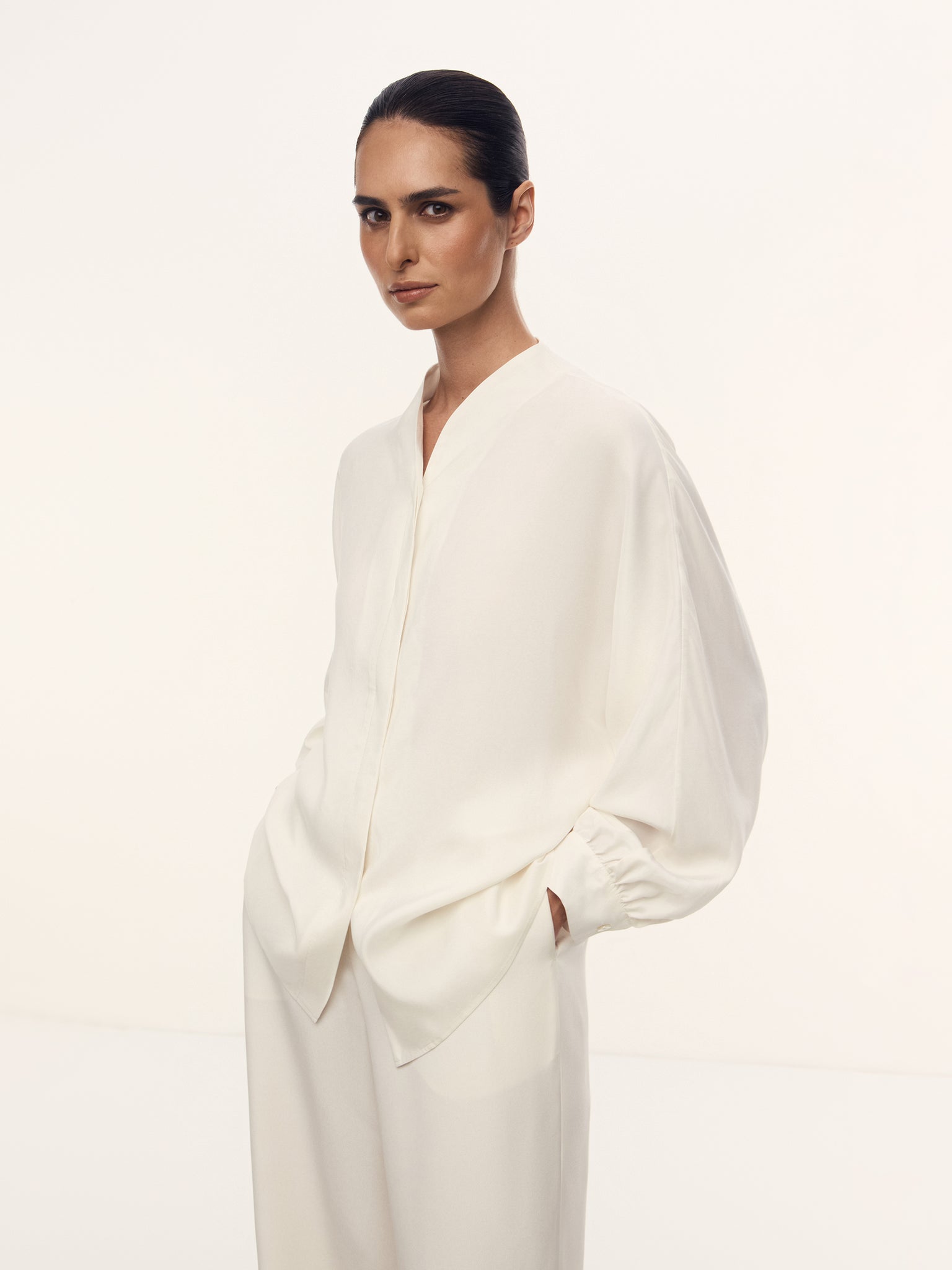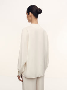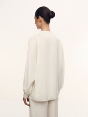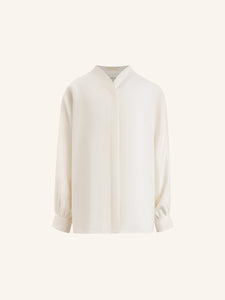 صُنعت هذه البلوزة بنسبة 100% من الحرير بوزن 16 موميه وتأتي بقوام مغسول غير لامع وعذب. صُممت بدون جيوب وبأكمام مستوحاة من نمط القفطان. وتأتي بقصة مريحة منسدلة فوق الجسم. تأتي بأزرار من عرق اللؤلؤ وتتميز بطابع احتفالي ومريح، لتتماشى مع جميع الإطلالات المميزة واليومية.