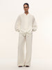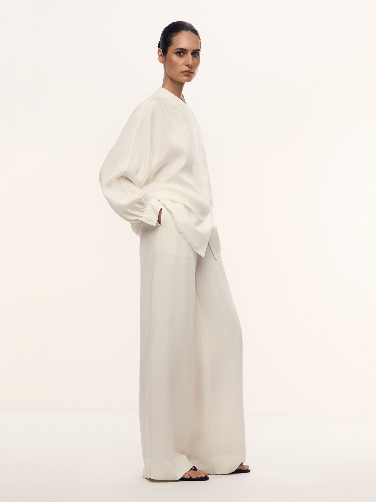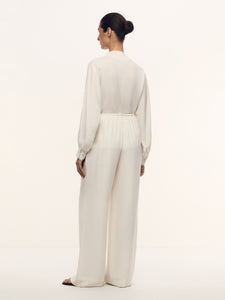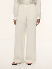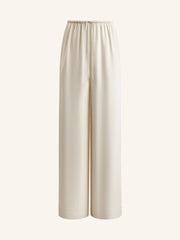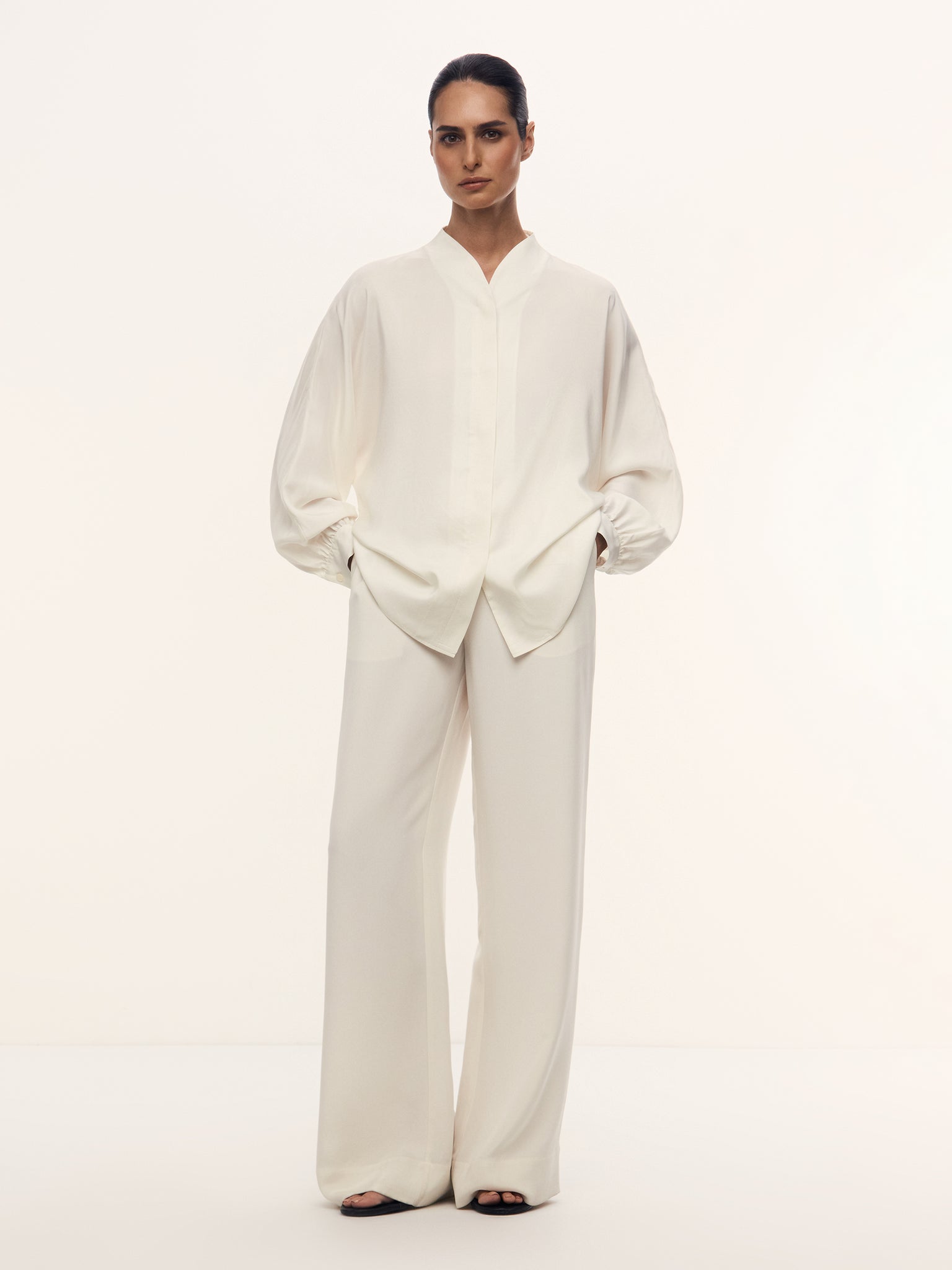 صُنع هذا البنطال بنسبة 100% حرير ويأتي من الحرير بوزن 30 موميه، ويتميز بقوام مغسول غير لامع. صُمم بقصة مستقيمة عند الساقين وطول يلامس الأرض ويأتي بجيوب جانبية وحزام خصر مطاطي مزود برباط شد. يتميز بأطراف عريضة محددة الشكل. يمكن تنسيقه مع البلوزة الحريرية المطابقة من المجموعة.