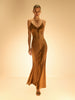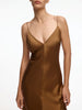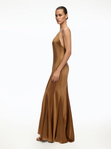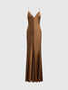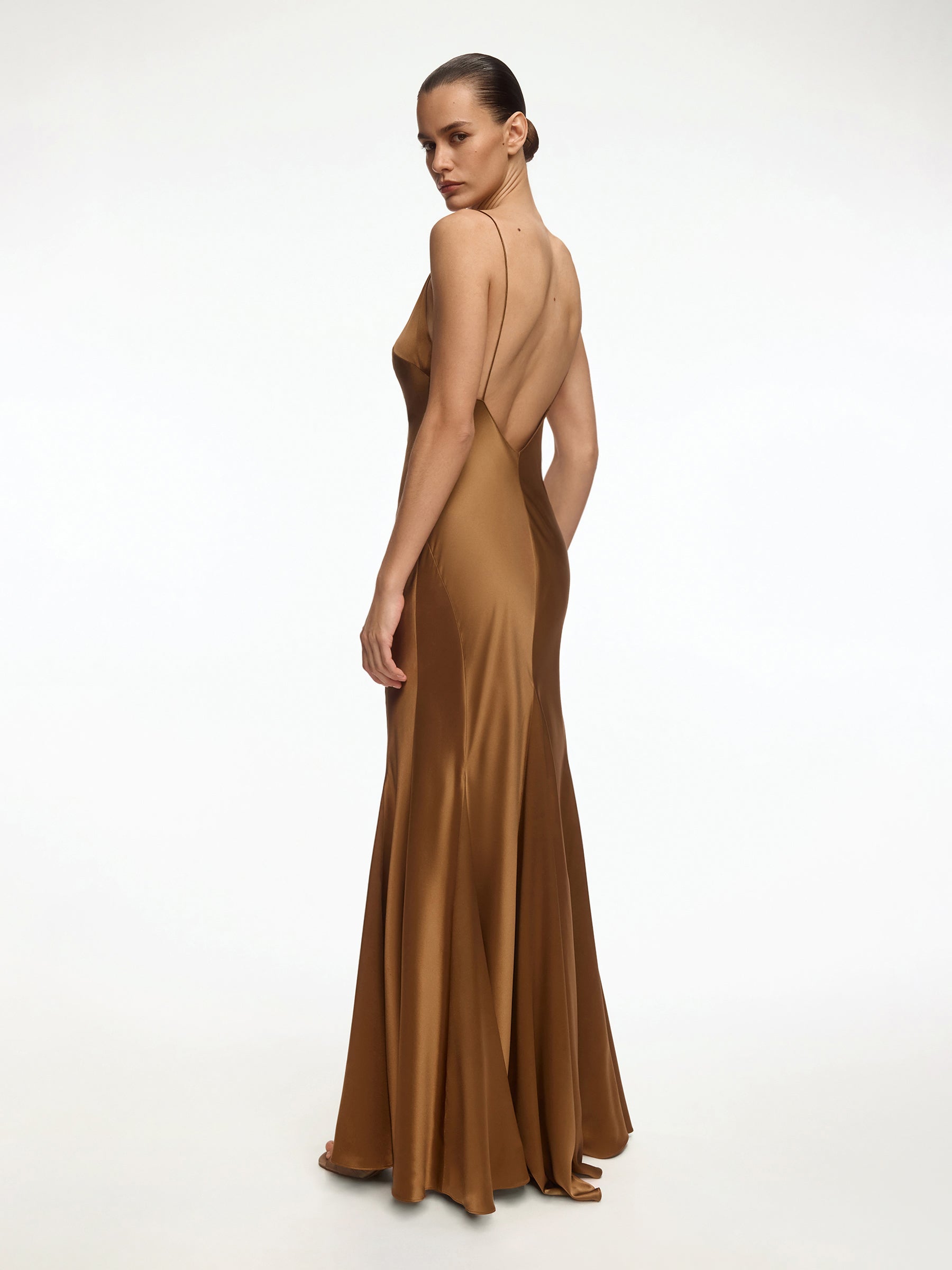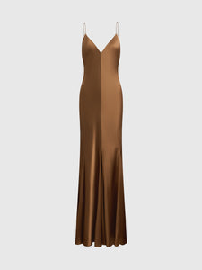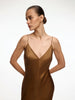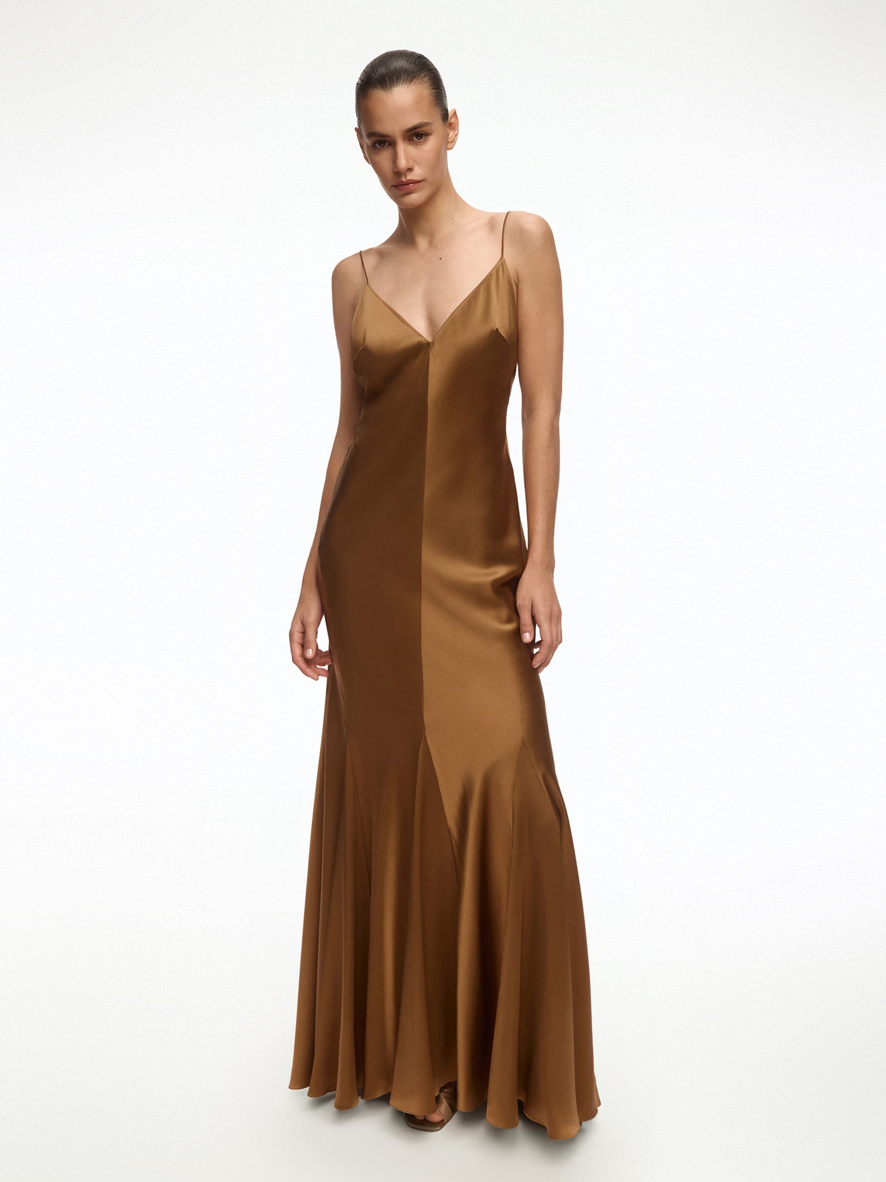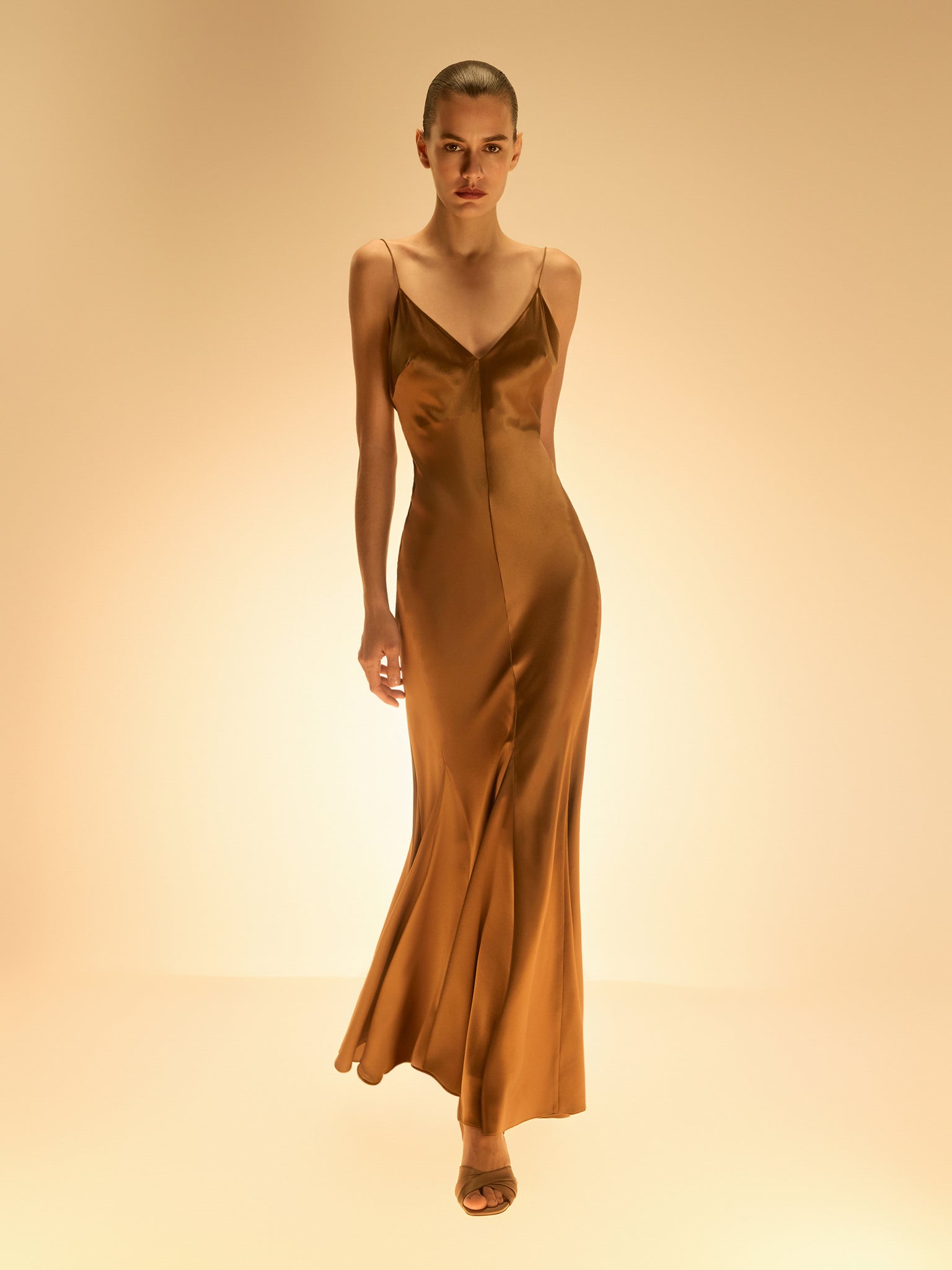 صُنع هذا الفستان بنسبة 100% من حرير ميلبري بقصة 22 موميه، ويتميز بقوام خفيف الوزن ولامع بشكل طبيعي. يأتي بتنورة مائلة للانسدال بكل روعة فوق الأرداف. يُغلق بسحاب جانبي وسحاب مخفي عند الخلف والياقة. يتميز بتنورة متعددة طبقات الأقمشة لقوام انسيابي وأنثوي بامتياز.
