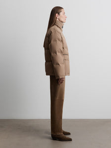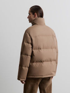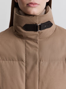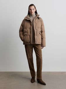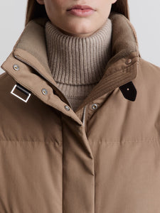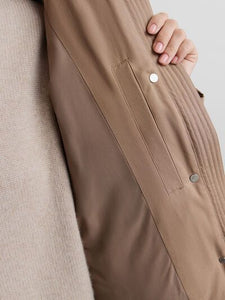 - Rounded silhouette with a high collar, merino wool cuffs, and fleece-lined pockets for extra comfort
