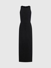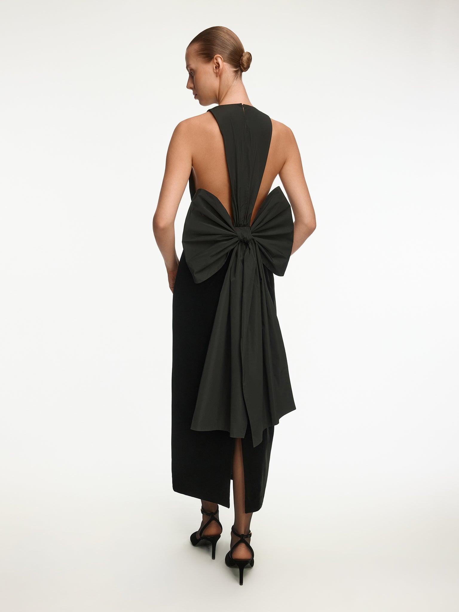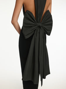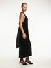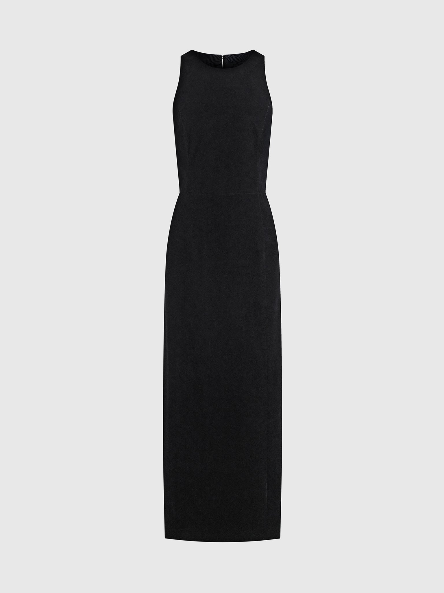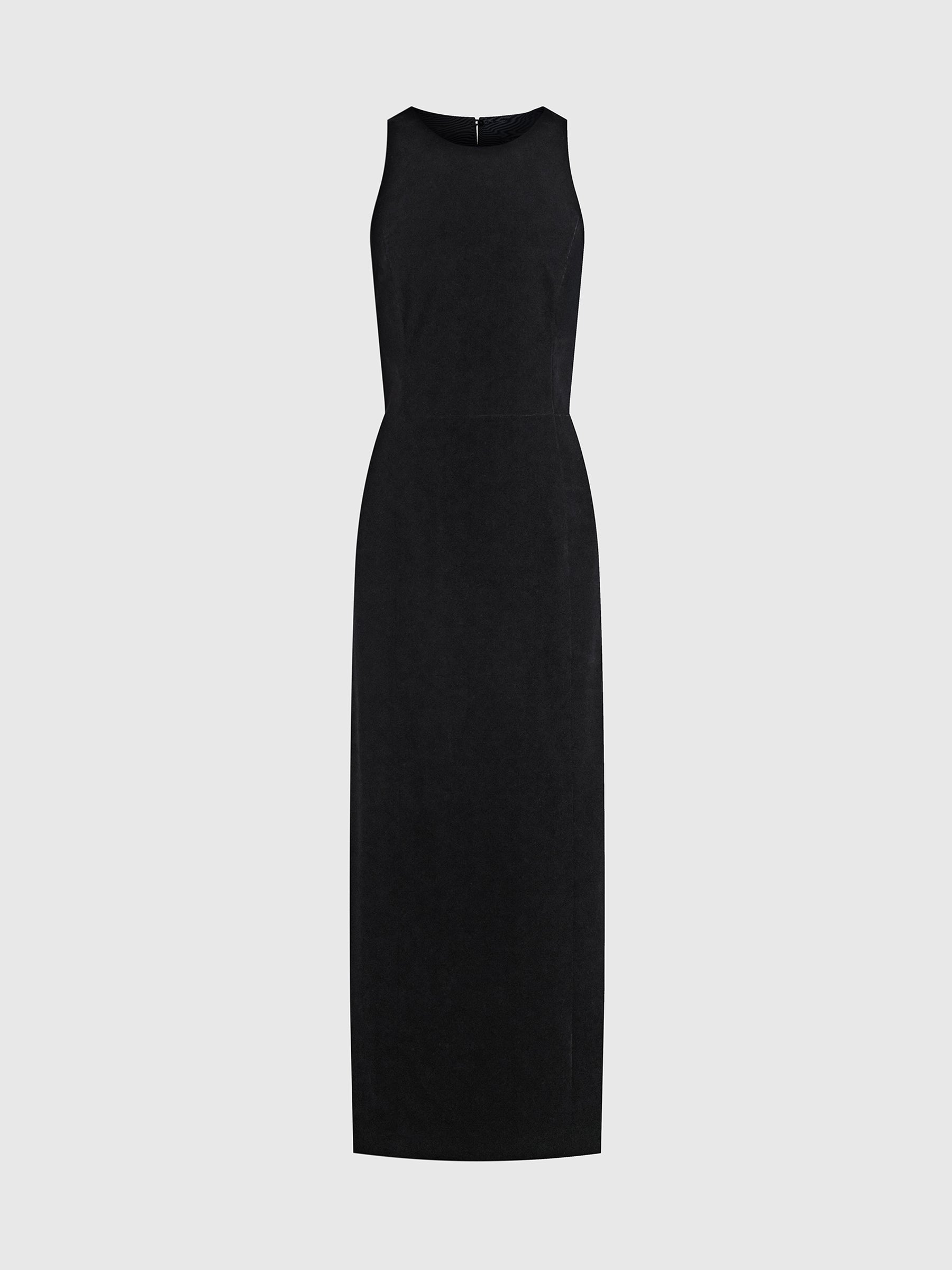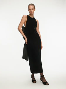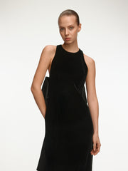 صُنع هذا الفستان المخملي في مصنع أجيارا في اليابان للمخمل وهو المصنع المورد نفسه لكل من علامات أرماني وكوم دي جارسون وبرادا. صُنع من المخمل وقماش كوبرو الناعم وجيد التهوية والانسيابي ويأتي بتقنية وبر متينة لا تفقد قوامها مع الوقت. يتميز بتفاصيل جلدية بارزة عند الياقة والأكمام الداخلية لقوام متباين وبارز. يأتي بربطة بارزة من قماش التفتا لطابع مينيمالي، كما يأتي ببطانة رقيقة وجيدة التهوية من متعدد الفيسكوز للتنعم بالراحة والخفة المطلقة.