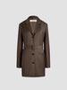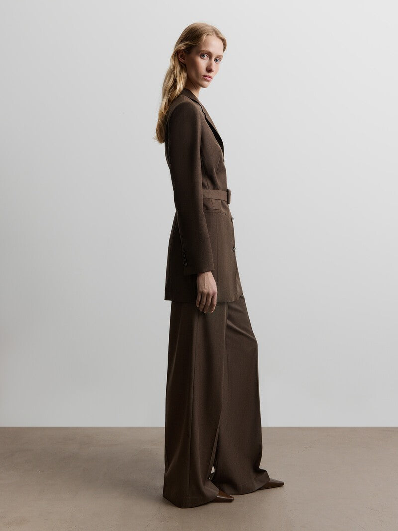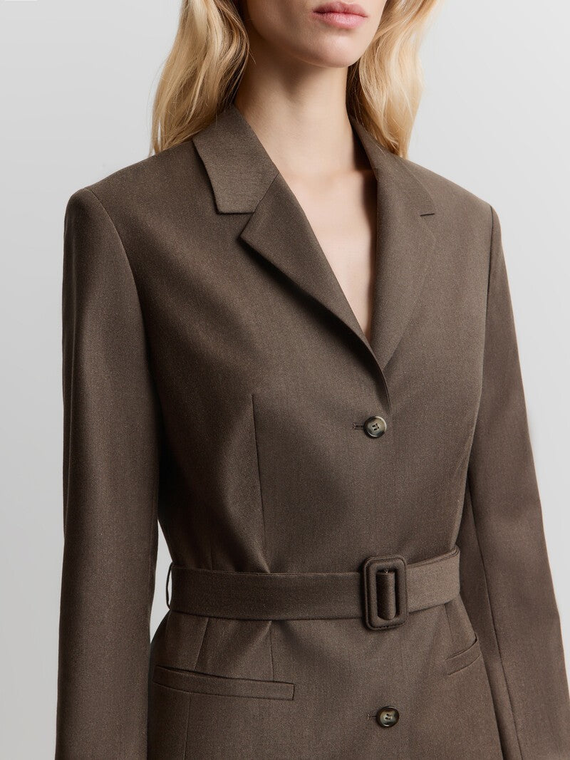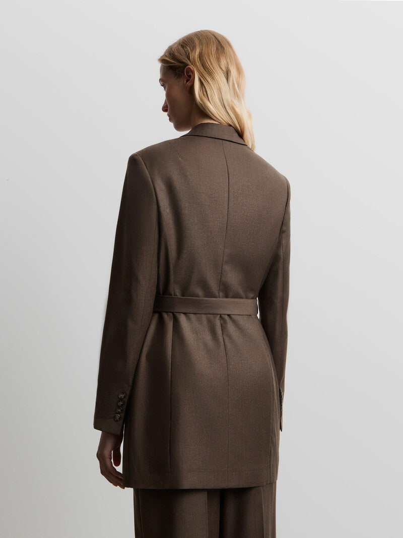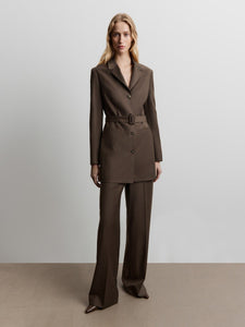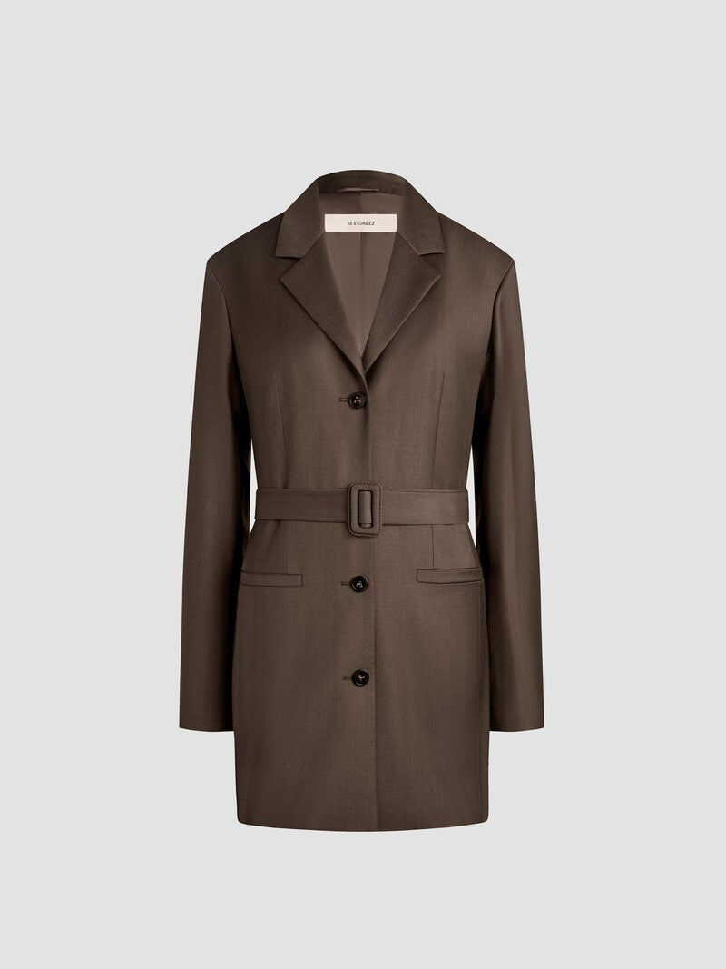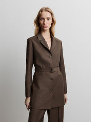 صُمم هذا البليزر الرسمي بتصميم طويل ويتميز بقصة ناعمة ومحددة الشكل ويأتي بدرزات محددة وحزام متناغم اللون لتحديد مقاس الخصر. صُنع من الصوف الناعم ويأتي ببطانة جزئية للحفاظ على التهوية والراحة طيلة المواسم. يمكن تنسيقه مع البنطال المطابق من المجموعة أو مع فستان قصير وبنطال لغينغز.