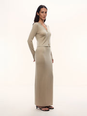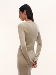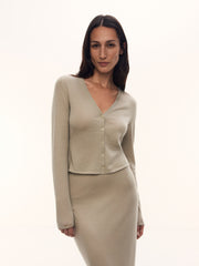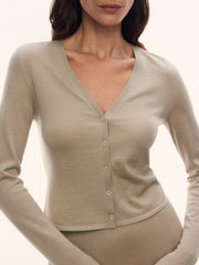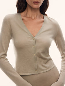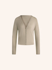 حُبك هذا الكارديغان من صوف المارينو الناعم والحرير الطبيعي الذي ينسدل بشكل رائع ويلفت الأنظار. يأتي بقصة مريحة وجيدة التهوية، ما يسهل تنسيقه فوق البلوزة أو بمفرده. يُغلق بأزرار من عرق اللؤلؤ.