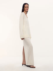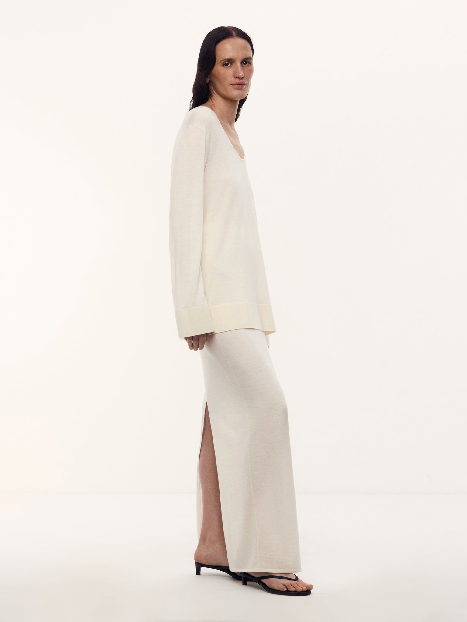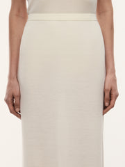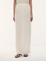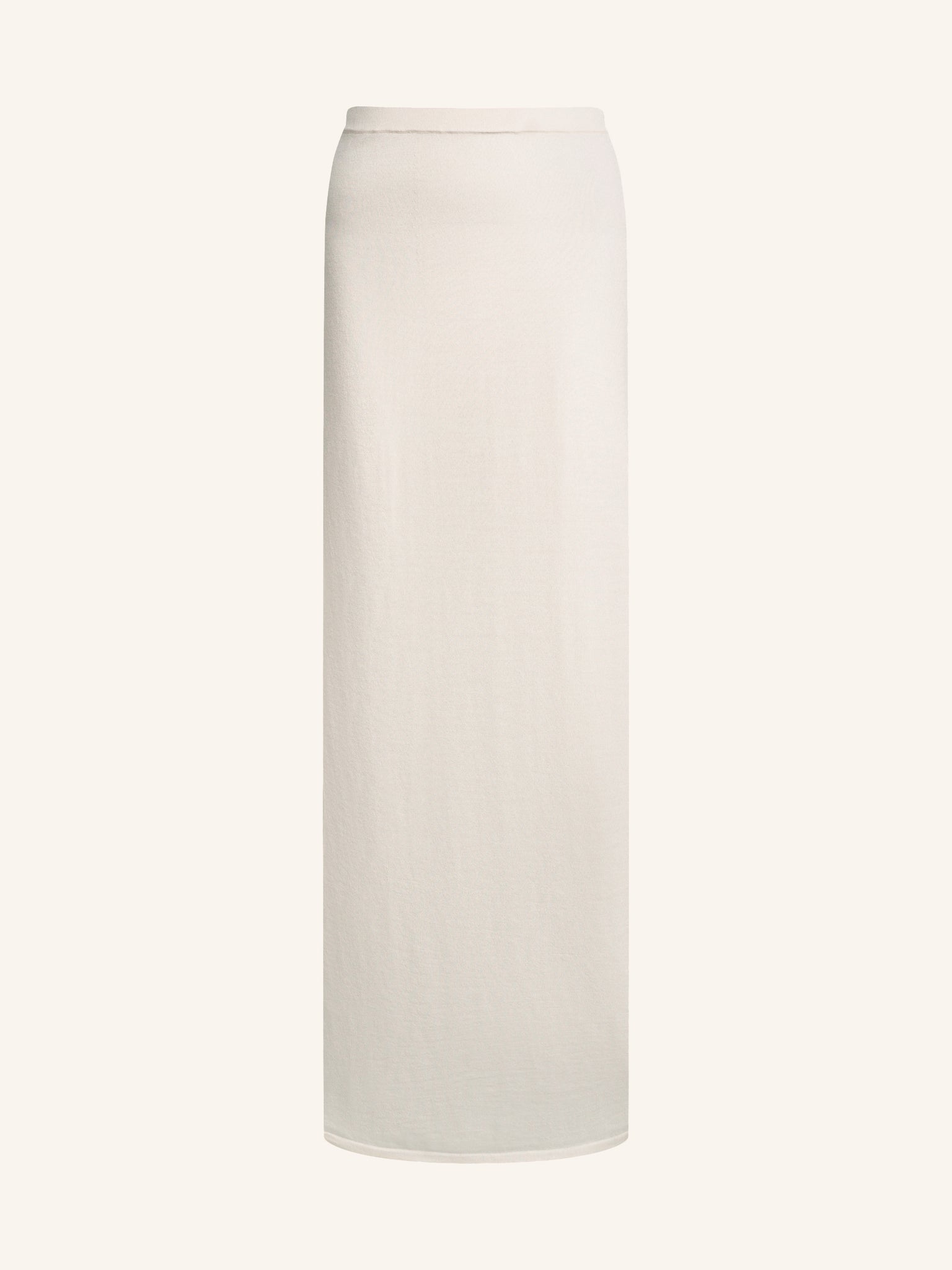 حُبكت هذه التنورة من صوف المارينو الناعم والحرير الطبيعي الذي ينسدل بشكل رائع ويلفت الأنظار. تأتي بتصميم طويل وبدون جيوب لإبراز قوام الأرداف بشكل أطول. تأتي بفتحة لسهولة الحركة وحزام خصر مطاطي لمقاس مريح ملفت للأنظار. تأتي بتصميم شبه شفاف وتتماشى مع الملابس الداخلية المحايدة.