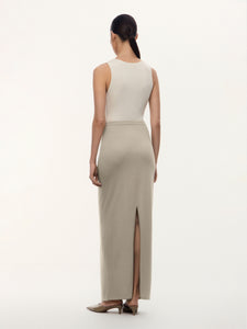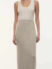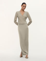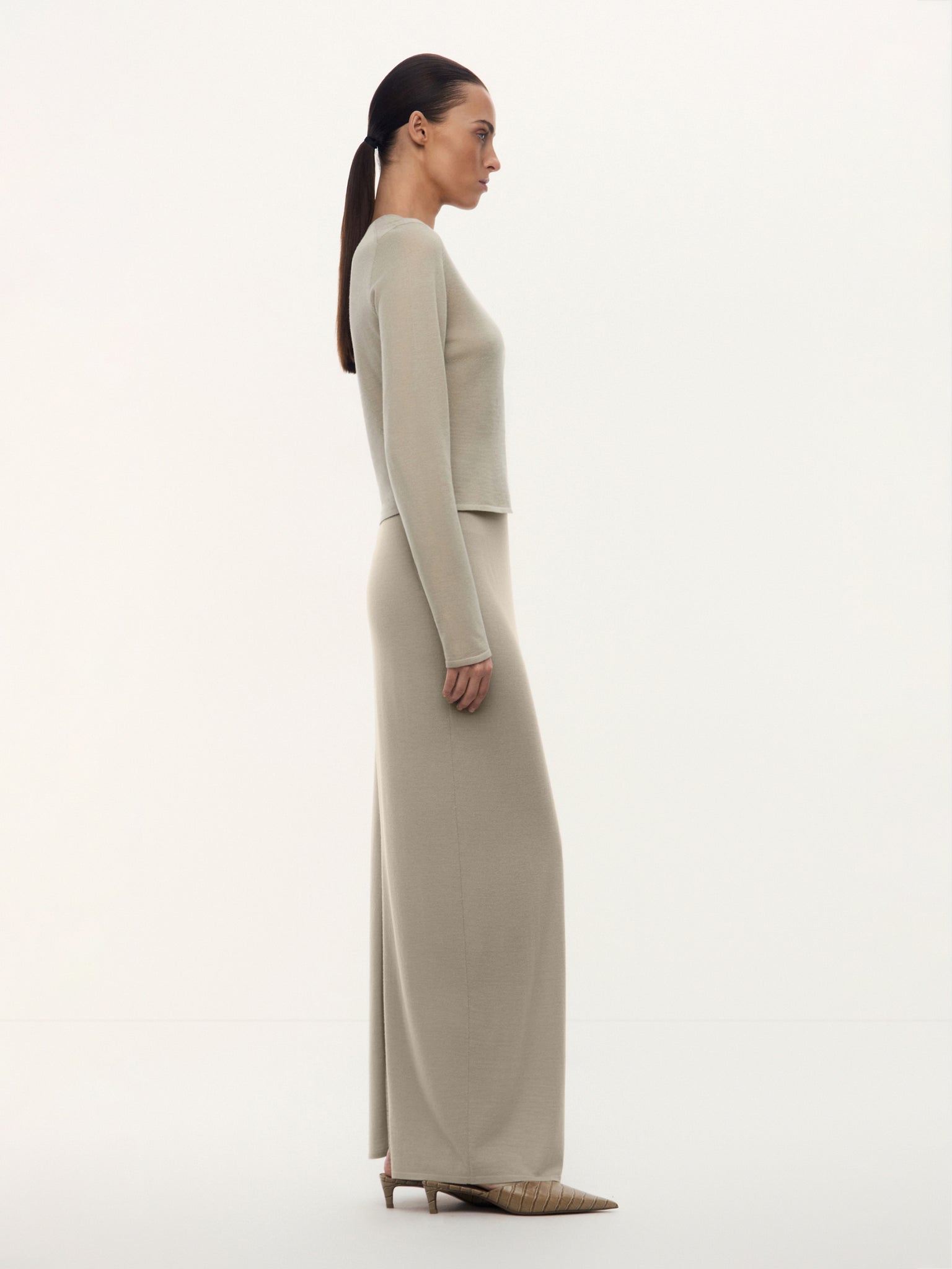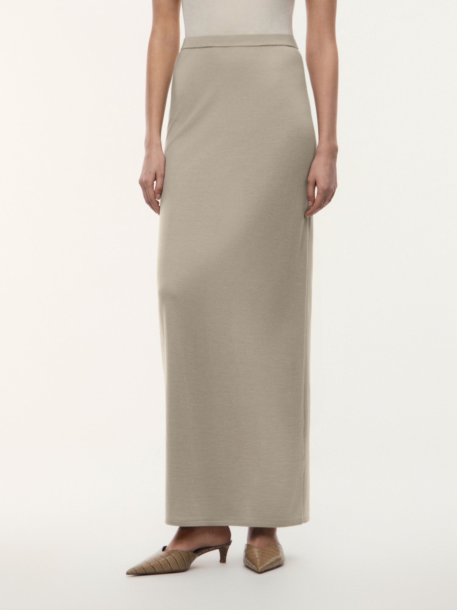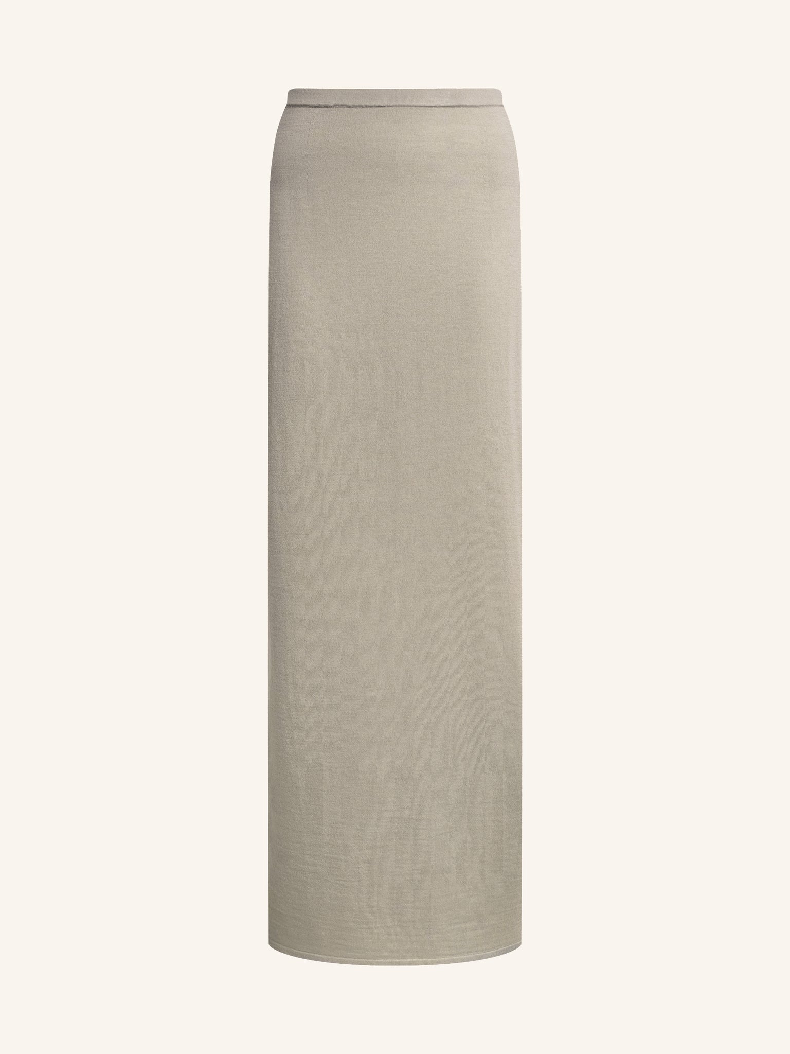 حُبكت هذه التنورة من صوف المارينو الناعم والحرير الطبيعي الذي ينسدل بشكل رائع ويلفت الأنظار. تأتي بتصميم طويل وبدون جيوب لإبراز قوام الأرداف بشكل أطول. تأتي بفتحة لسهولة الحركة وحزام خصر مطاطي لمقاس مريح ملفت للأنظار.