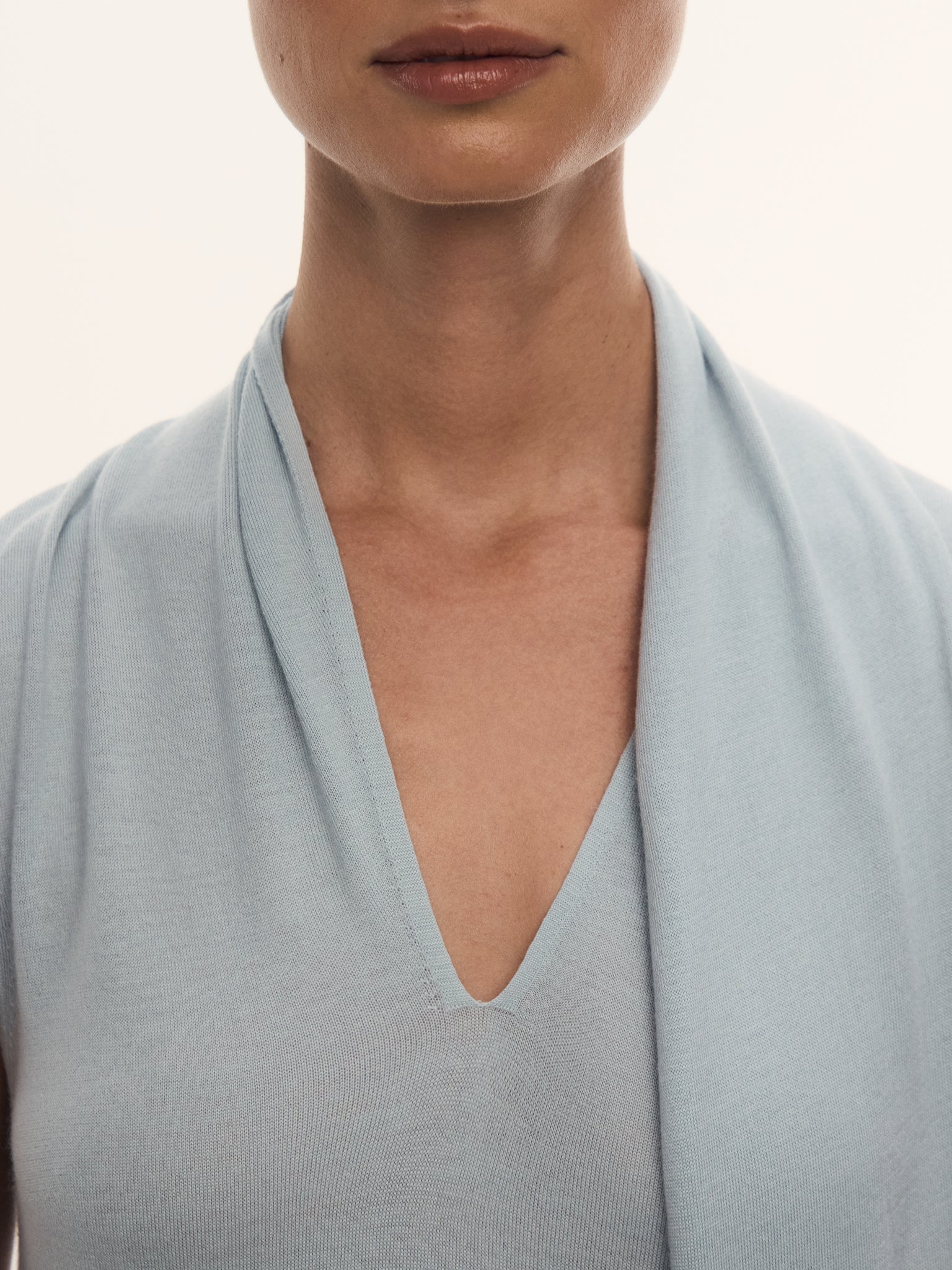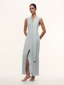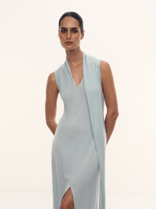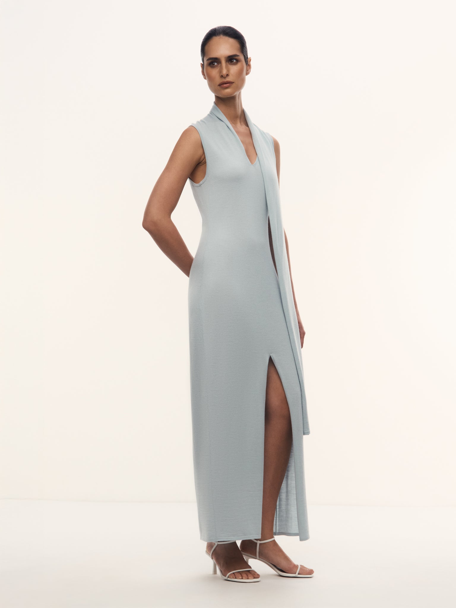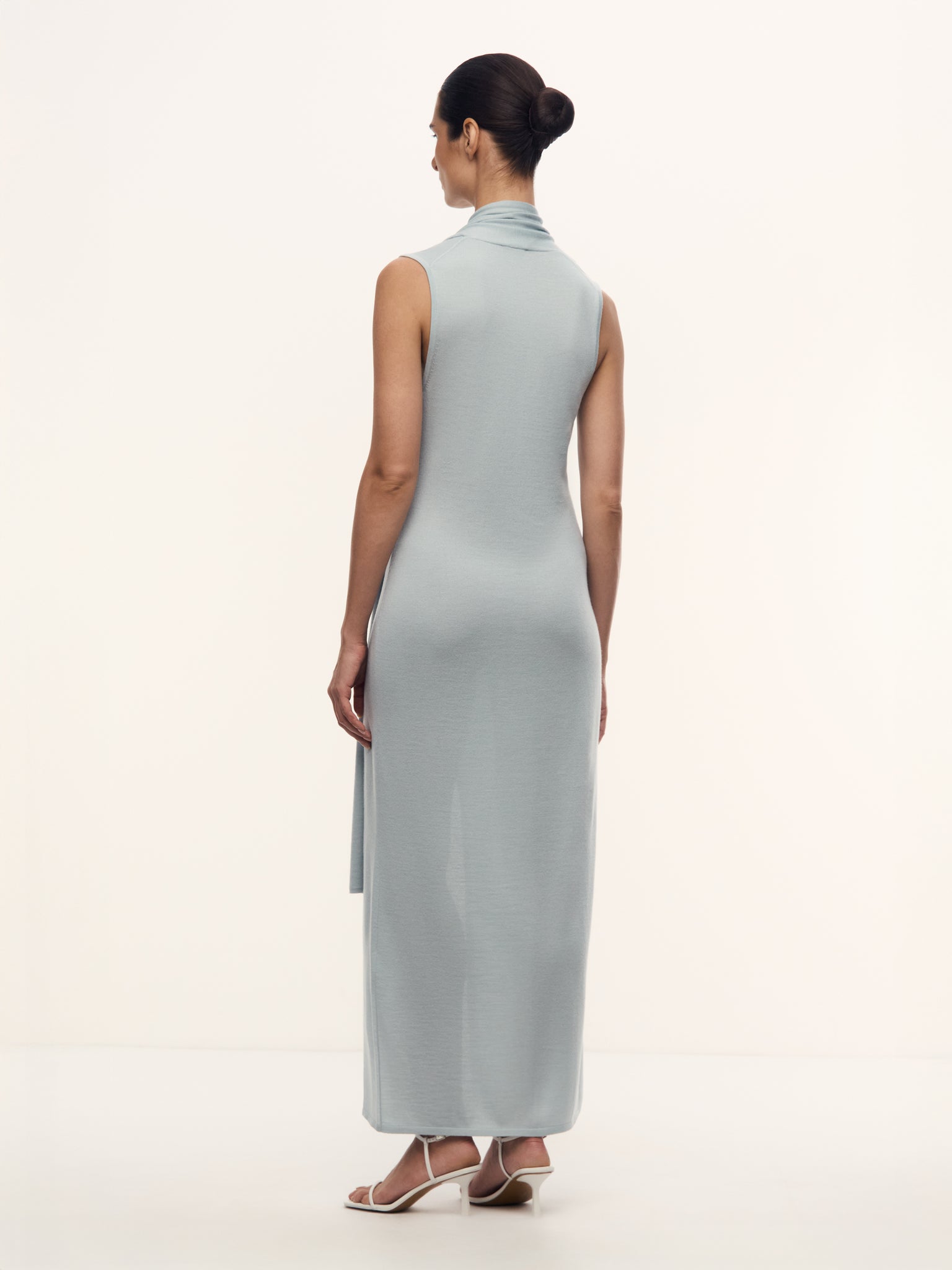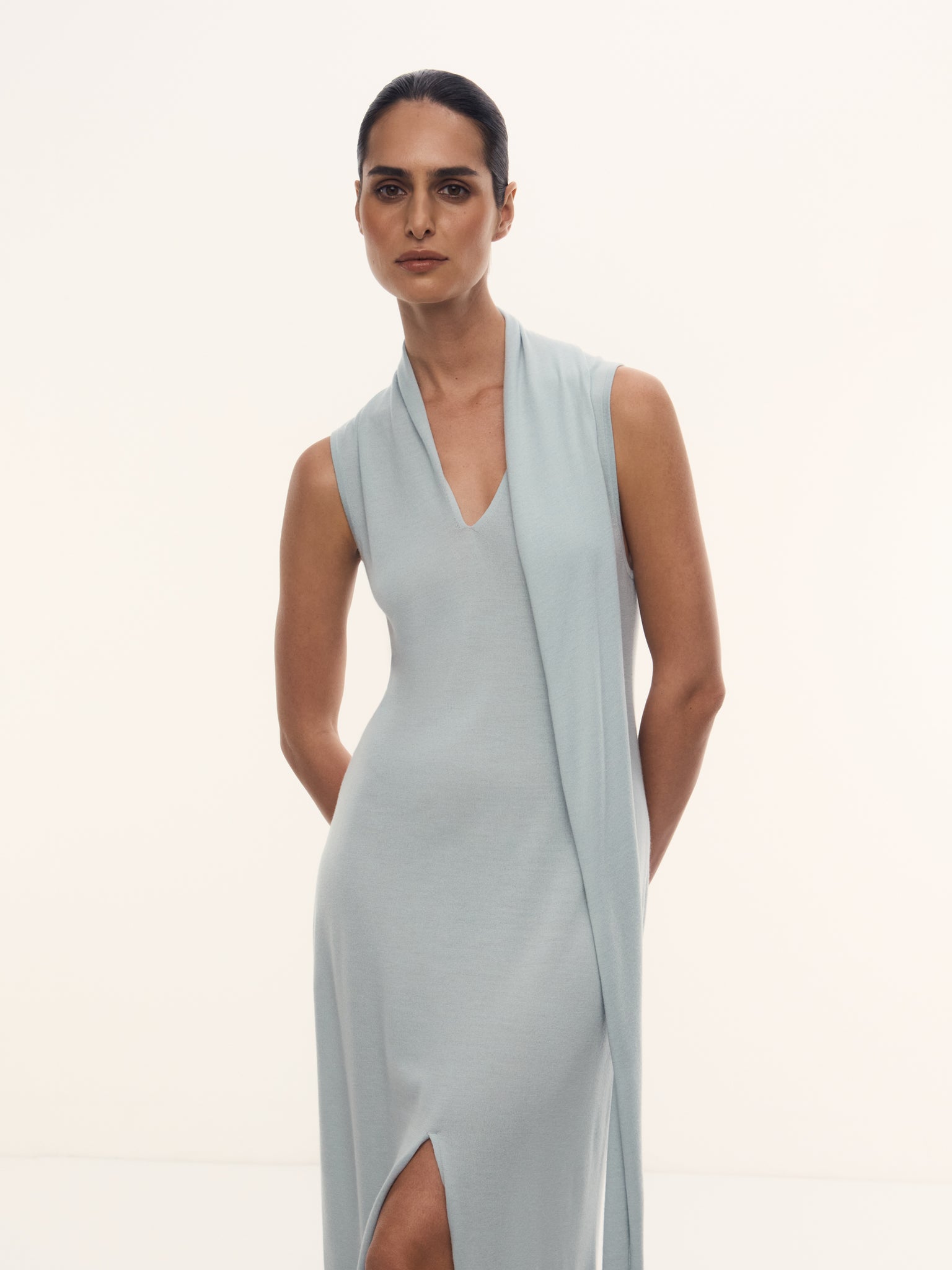 حُبك هذا الفستان من صوف المارينو الأسترالي والحرير خفيف الوزن والانسيابي ويأتي بلمسة عذبة شبه شفافة ليعانق منحنيات الجسم بكل روعة. يتميز بوشاح رقيق طويل يمكن تنسيقه بأكثر من طريقة.