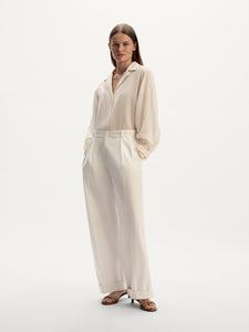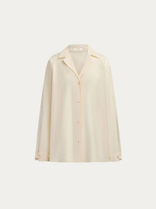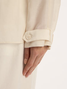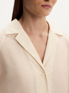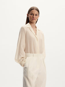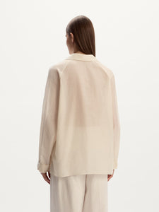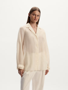An airy silhouette for the warm months, this shirt is crafted from a breathable, semi-sheer cotton-silk blend with a subtle sheen. Designed in a relaxed fit, it features soft shoulders and wide sleeves, secured with tabs for a more defined shape. Tuck it into trousers or a skirt to highlight the waist.