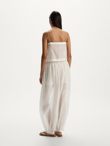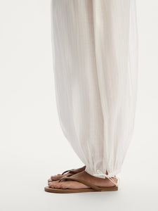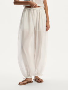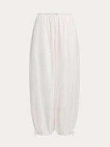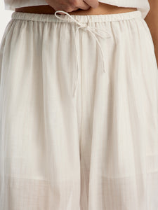 يُعتبر هذا البنطال خيارًا مثاليًا للأيام الحارة ويتميز بتصميم منفوش وجيوب جانبية وحزام خصر مطاطي وحواف مزودة برباط شد. صُنع من مزيج شبه شفاف من القطن والحرير ويأتي ببطانة من شورت قطني لتعزيز التغطية. يمكن تنسيقه مع البلوزة المطابقة من المجموعة.