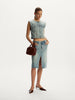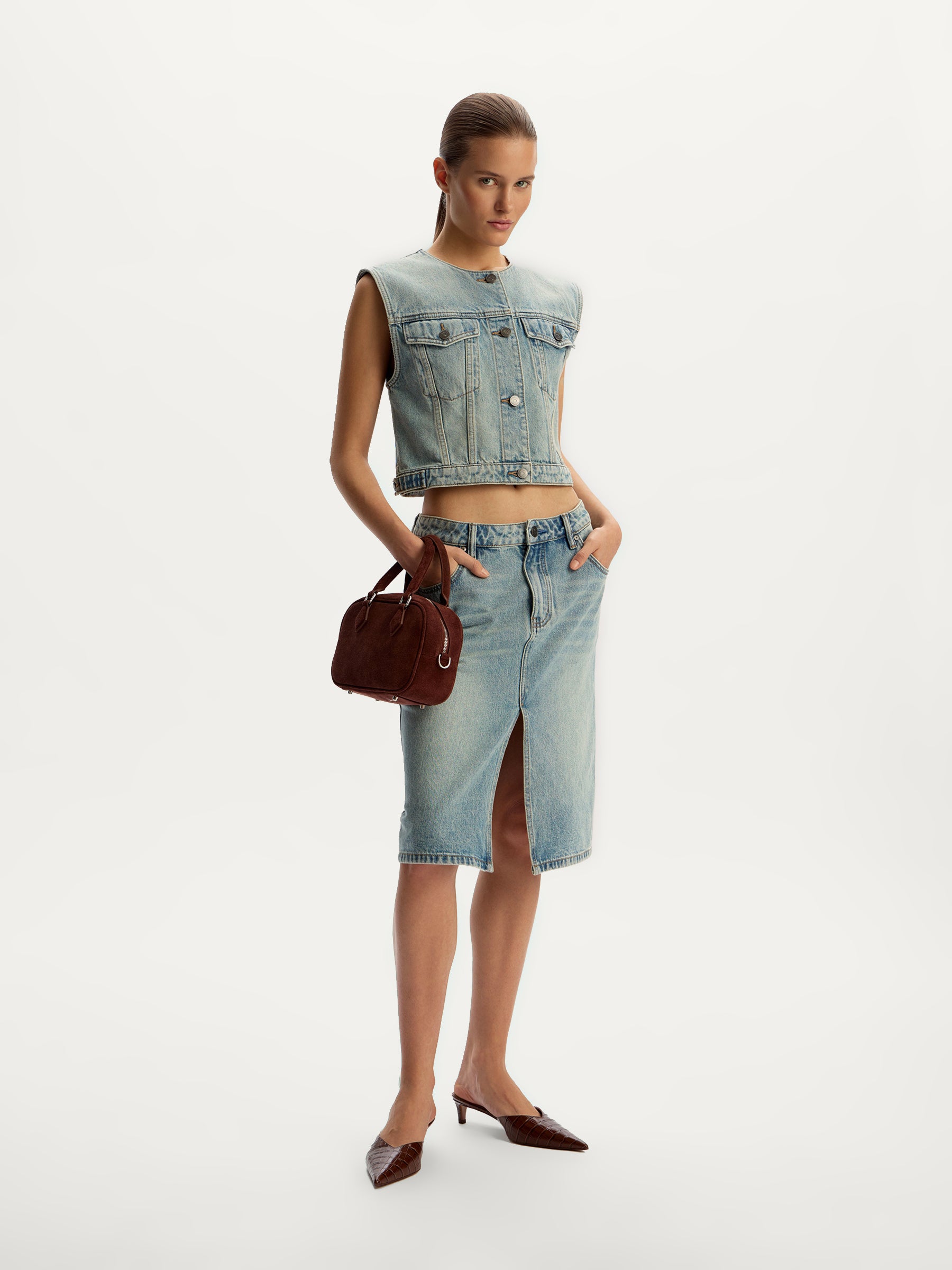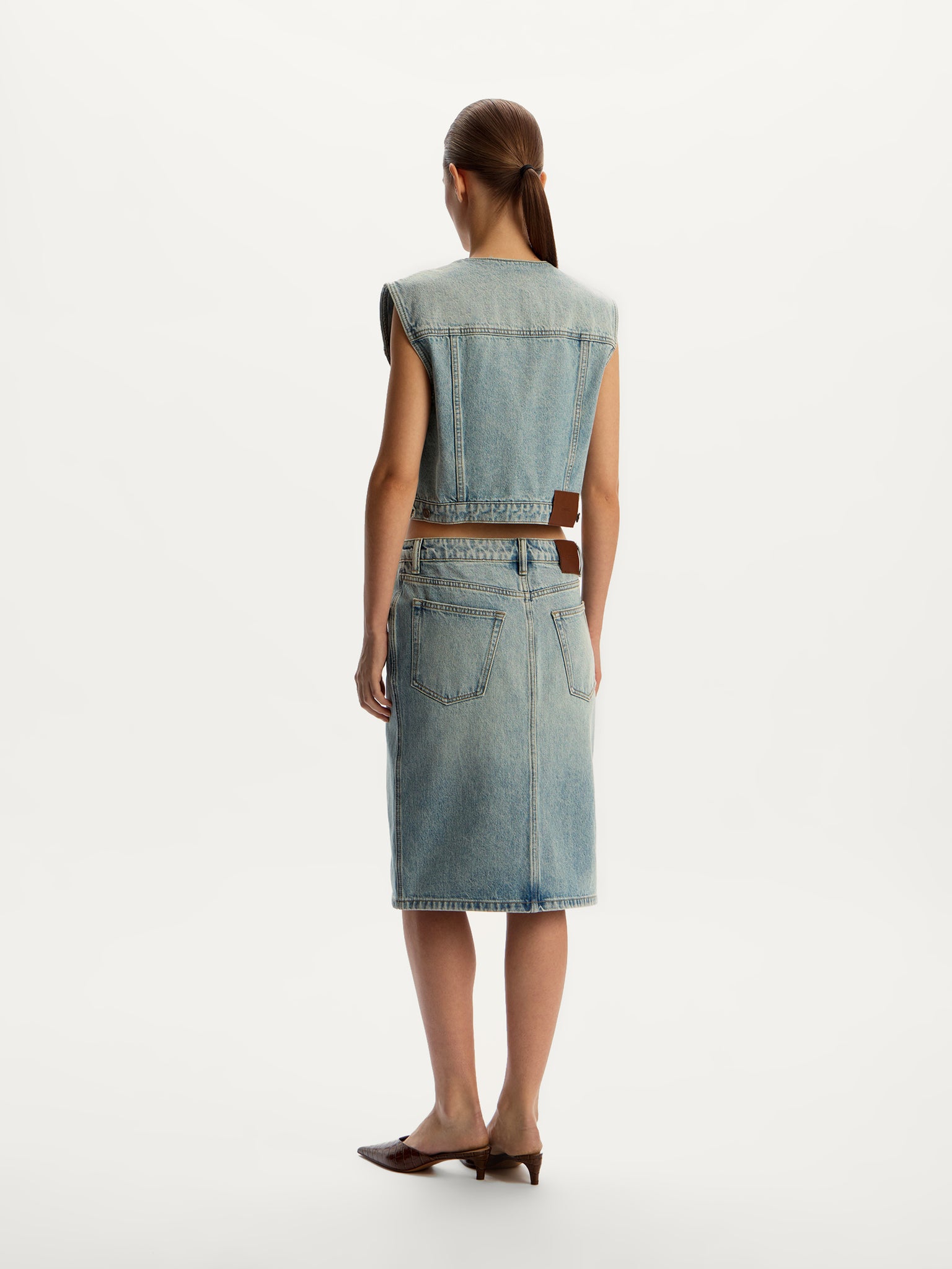 تتميز هذه التنورة الدنيم بطابع كلاسيكي لا يحده زمن وتأتي بطول يلامس الركبة لسهولة التنسيق وتتميز بخصر متوسط الارتفاع وفتحة أمامية لسهولة الحركة. صُنعت من الدنيم بوزن 13.5 أونصة وتتميز بنسيج تويل بارز لتحافظ على شكلها المحدد وتكتسب صبغتها المعتقة الكلاسيكية مع الوقت. يمكن تنسيقها مع القميص المطابق لدى 12STOREEZ لإطلالة متكاملة.