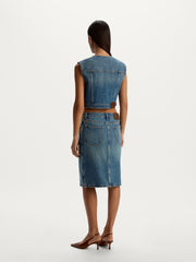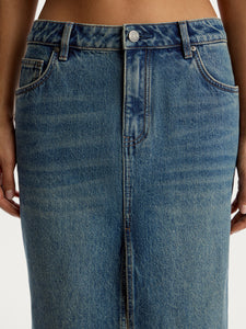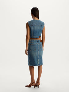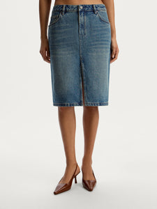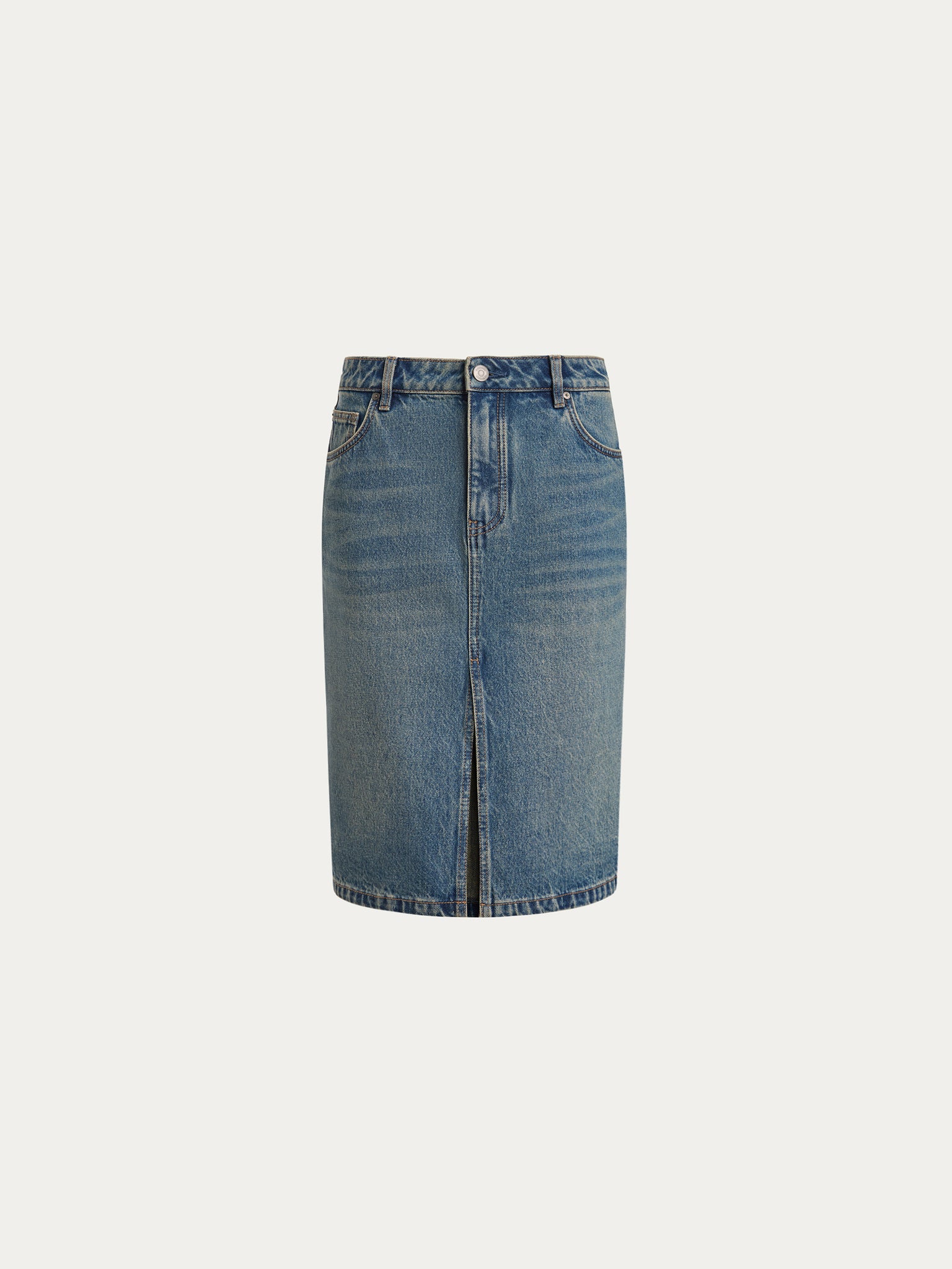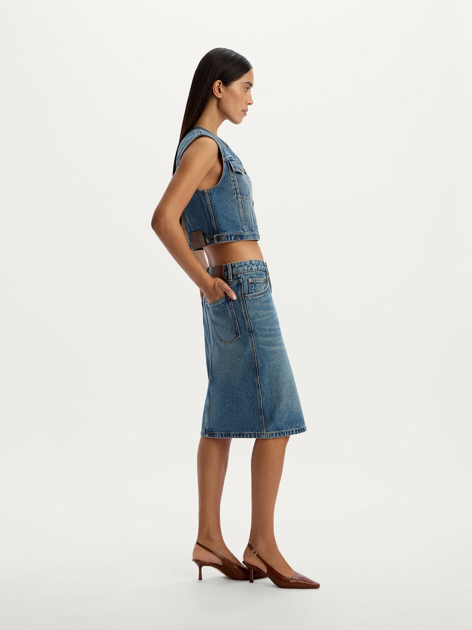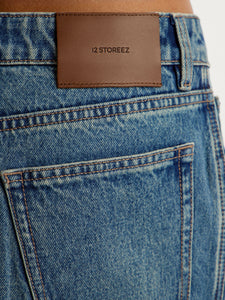 تتميز هذه التنورة الدنيم بطابع كلاسيكي لا يحده زمن وتأتي بطول يلامس الركبة لسهولة التنسيق وتتميز بخصر متوسط الارتفاع وفتحة أمامية لسهولة الحركة. صُنعت من الدنيم بوزن 13.5 أونصة وتتميز بنسيج تويل بارز لتحافظ على شكلها المحدد وتكتسب صبغتها المعتقة الكلاسيكية مع الوقت. يمكن تنسيقها مع القميص المطابق لدى 12STOREEZ لإطلالة متكاملة.