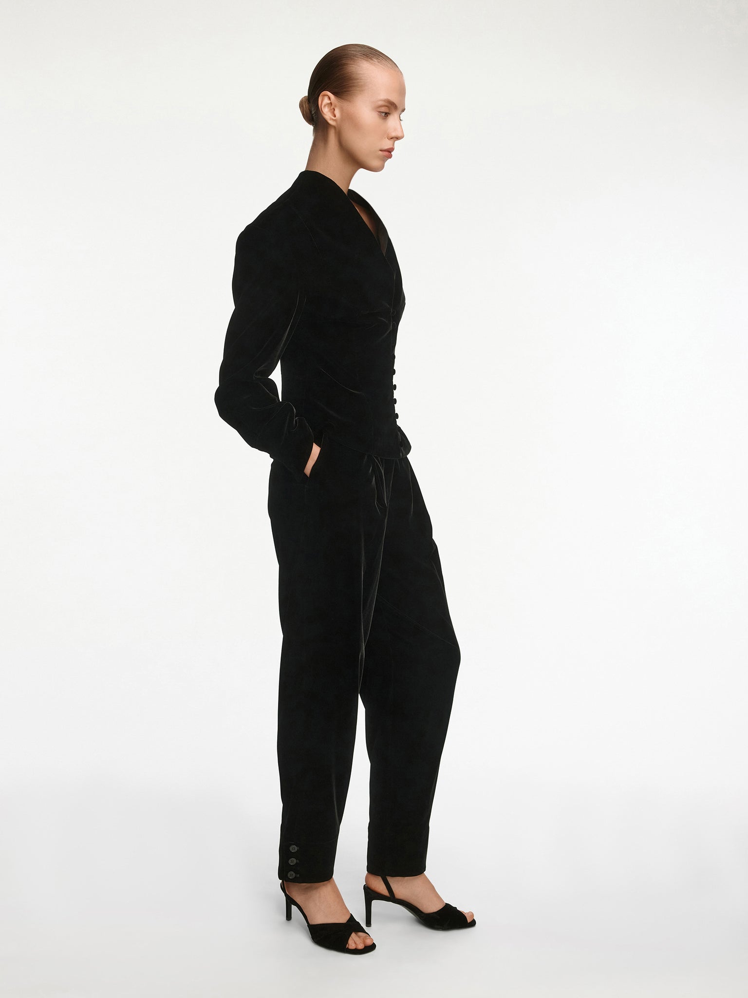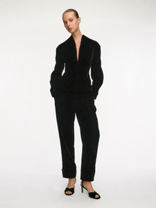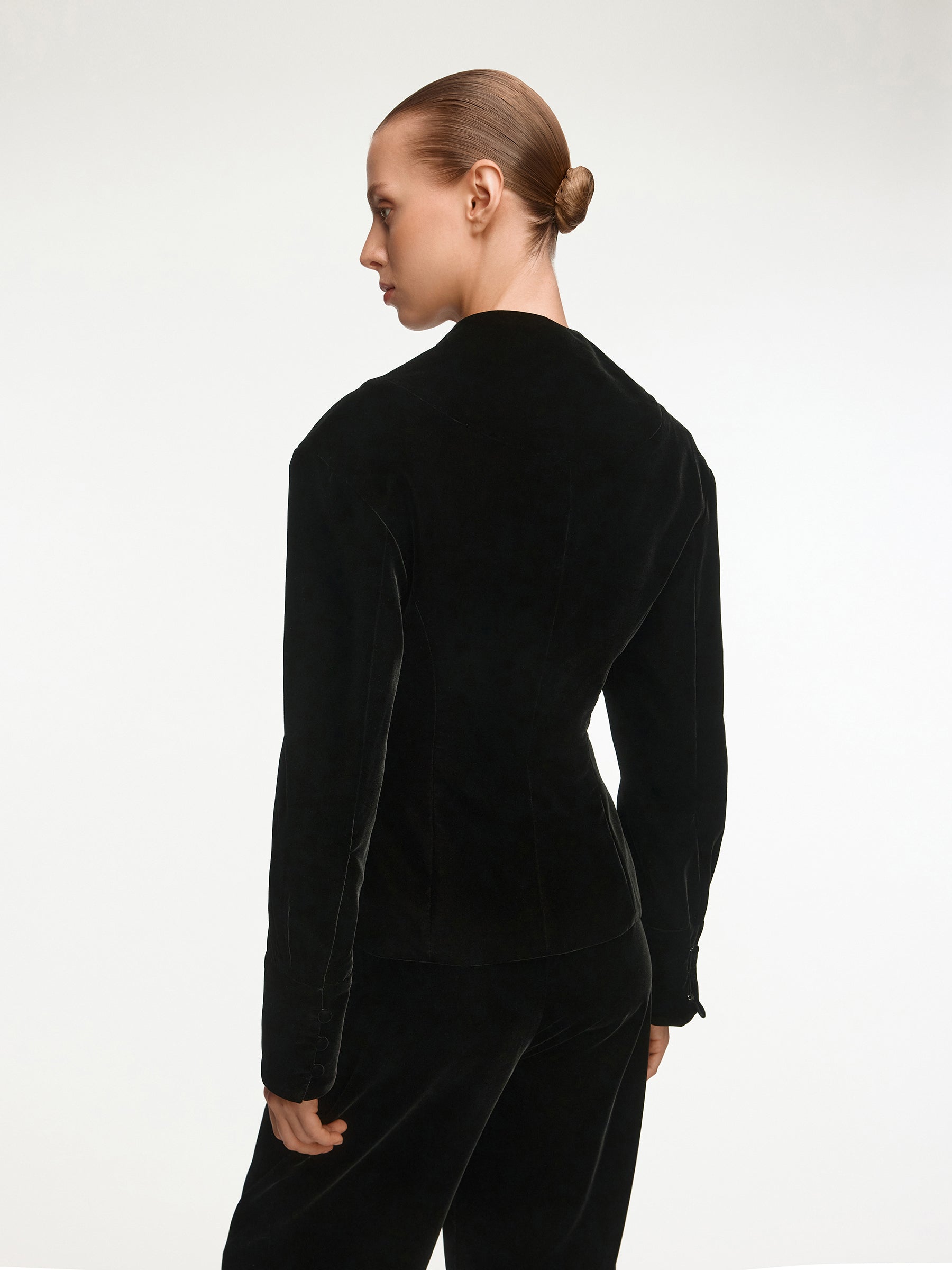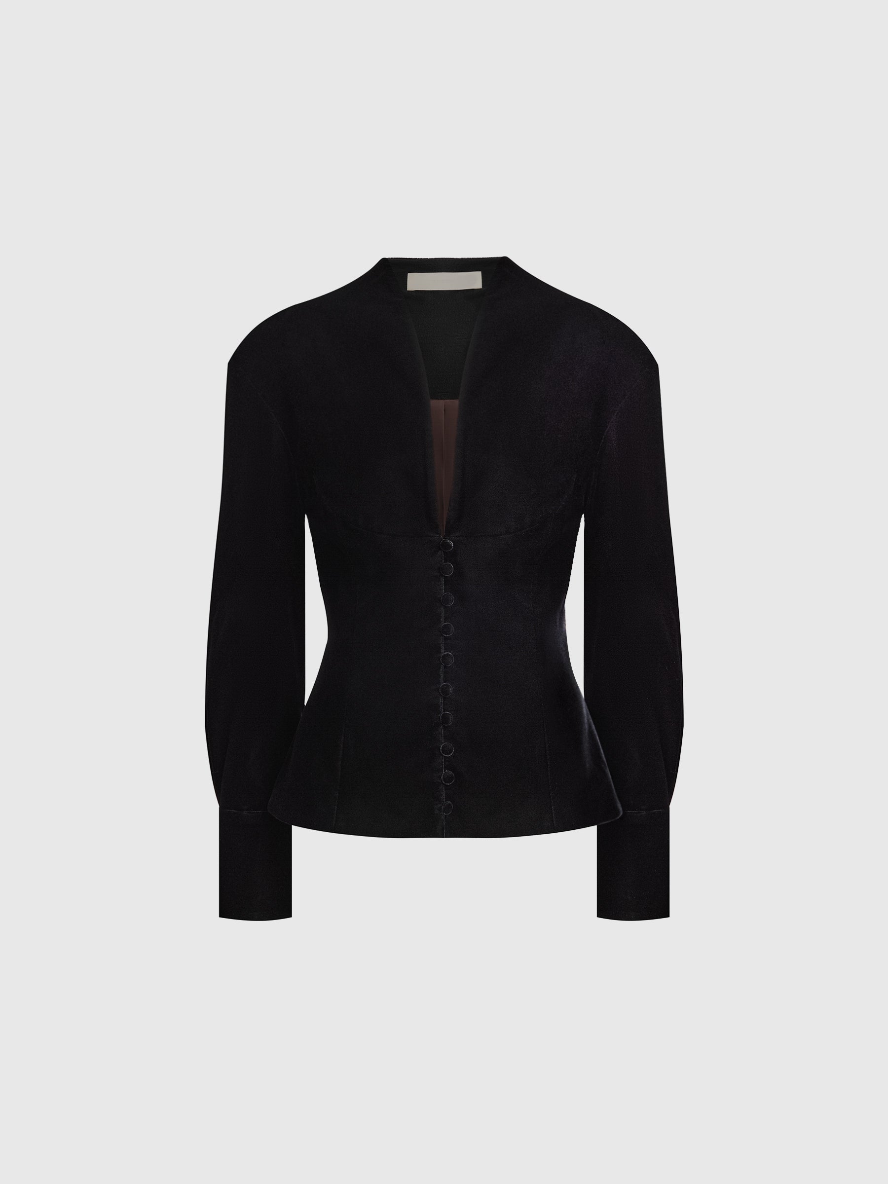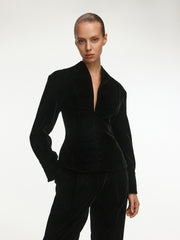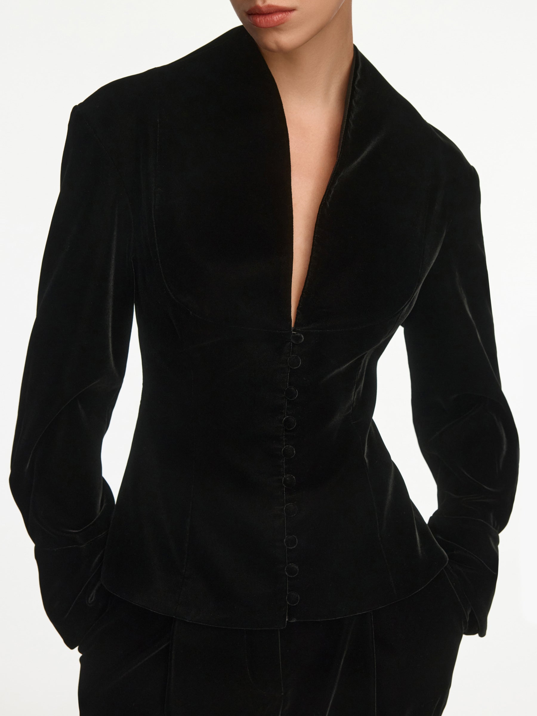 صُنع هذا الجاكيت المخملي في مصنع أجيارا في اليابان للمخمل وهو المصنع المورد نفسه لكل من علامات أرماني وكوم دي جارسون وبرادا. صُنع من المخمل وقماش كوبرو الناعم وجيد التهوية والانسيابي ويأتي بتقنية وبر متينة لا تفقد قوامها مع الوقت. يتميز بقصة كورسيه وأكمام كبيرة فضفاضة وبشكل ساعة رملية تنحت الجسم. يأتي ببطانة من قماش كوبرو ناعم وتفاصيل جلدية عند الياقة وأساور الأكمام.