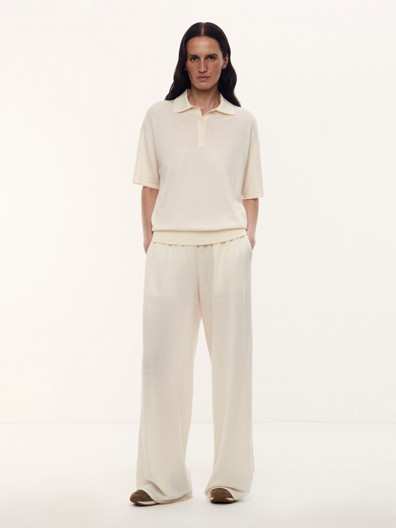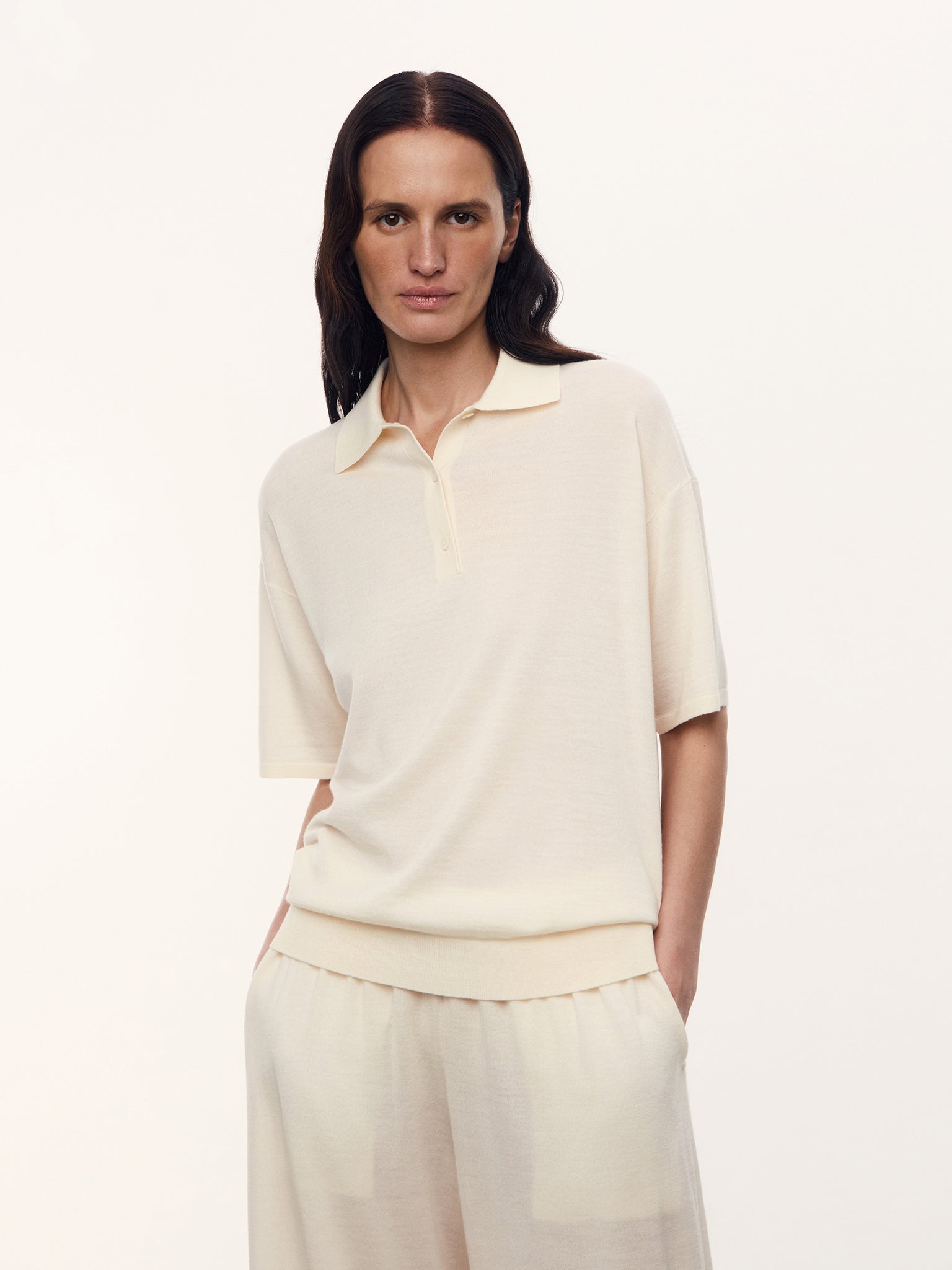 صُنعت هذه الكنزة من مزيج صوف المارينو والكشمير من خيوط غزل شهيرة لدى العملاء لتحافظ على قوامها الخفيف والزغب والعذب. تأتي بلون سهل التنسيق بأكثر من طريقة وقصة كلاسيكية تتماشى مع جميع الإطلالات. تُغلق بأزرار من عرق اللؤلؤ.