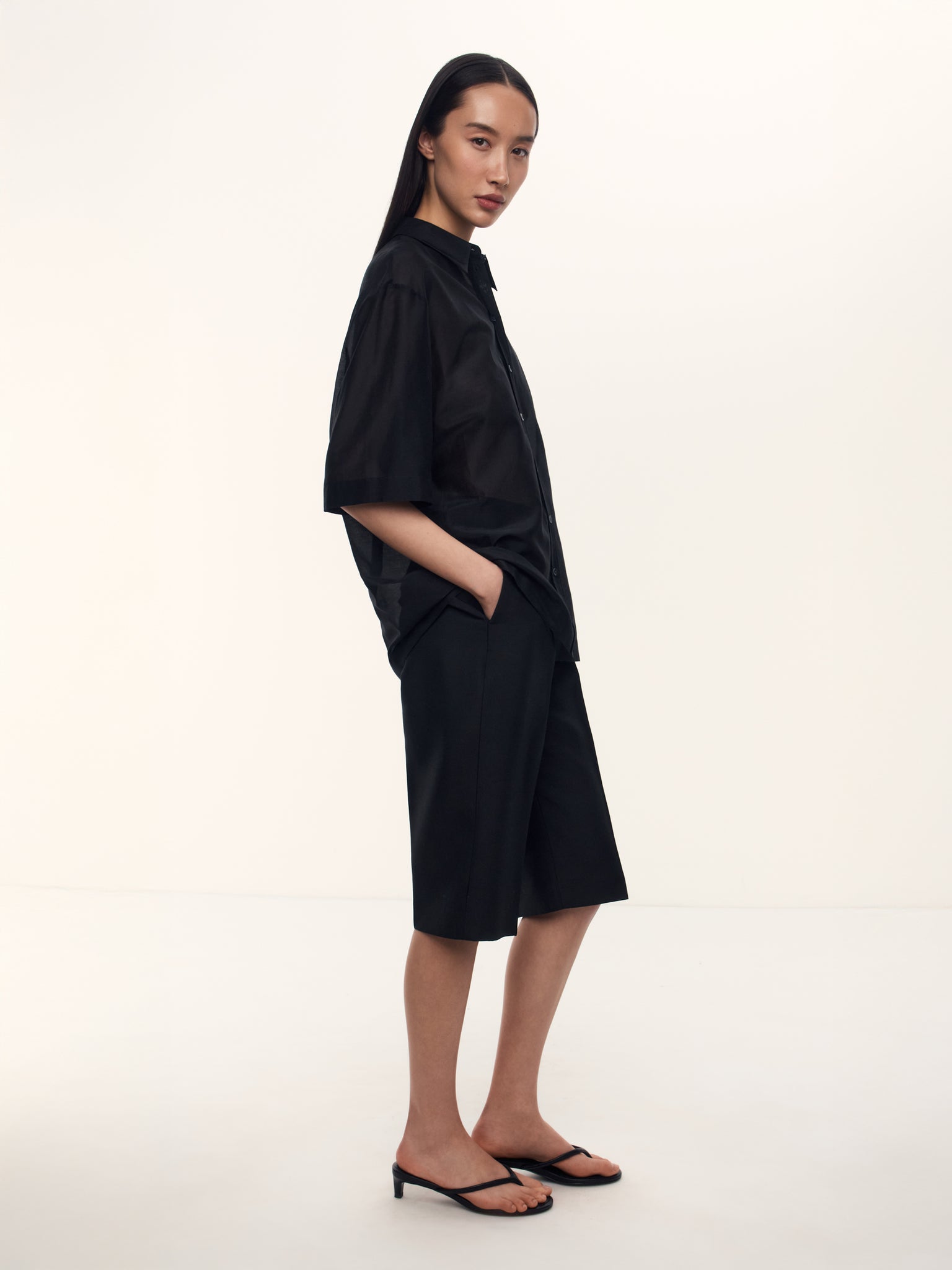 يُعتبر قطعة خفيفة للغاية وهو مصنوع من مزيج من القطن والحرير ويتميز بلمسة شبه شفافة. يتميز بطابع مصقول وأنيق طيلة اليوم ويأتي بحواف محددة الشكل وأكمام واسعة. يسهل تنسيقه بأكثر من طريقة مع جميع القطع في خزانة الملابس وقد صُمم بطابع مينيمالي.