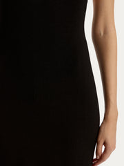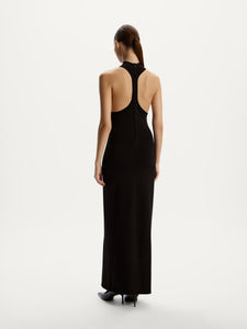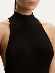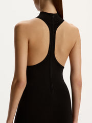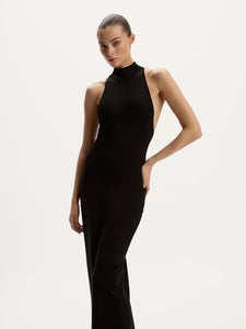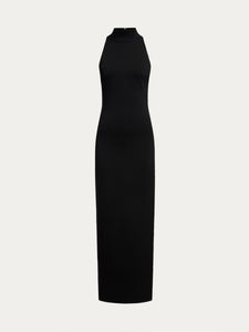 صُمم هذا الفستان بياقة هالتر الدائرية وهو محبوك بمزيج فيسكوز ولايوسيل مطاط وقد صُمم بقصة أنيقة وبياقة عالية وبظهر مكشوف يبرز جمال الكتفين. أما الحرير، فيضفي لمسة لامعة ناعمة ليتماشى مع مختلف المناسبات المميزة.