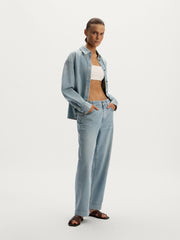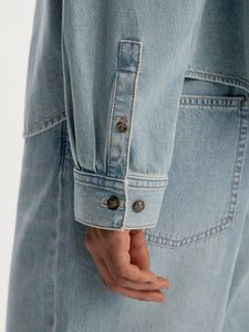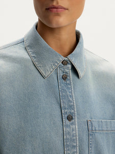 يُعتبر هذا القميص نسخة منعشة عن تصاميم الدنيم الكلاسيكية وهو مثالي للأيام الحارة وهو مصنوع من القطن بوزن 8 أونصة ويتميز بقوام خفيف وناعم. صُمم بقصة قصيرة مريحة لتنسيقه فوق التي شيرتات والبلوزات بدون أكمام أو حتى بمفرده لطابع مصقول. يأتي بلون أزرق فاتح معتق كلاسيكي ويتماشى مع جميع الإطلالات الصيفية المتألقة. يمكن تنسيقه مع بنطال الجينز المطابق من المجموعة.