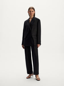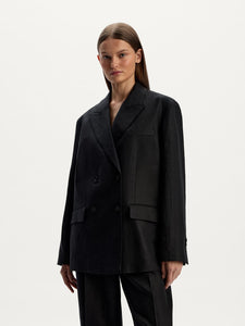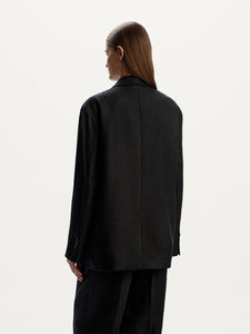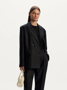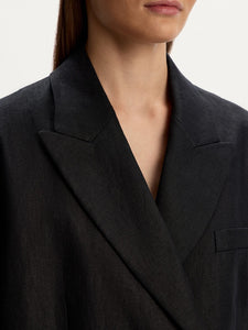 يُعتبر هذا البليزر قطعة مريحة للإطلالات الصيفية وهو مصنوع من الكتان الناعم والكثيف ويأتي بلون أسود يسهل تنسيقه بأكثر من طريقة. يتميز ببطانة جيدة التهوية من القطن والفيسكوز وبحواف متباينة لطابع مصقول. يمكن تنسيقه فوق الفساتين الصيفية أو مع بنطال مطابق من المجموعة.