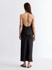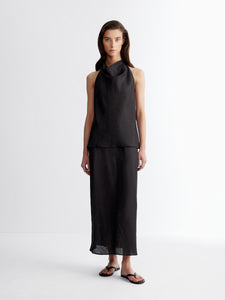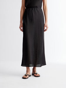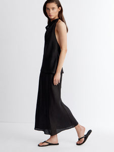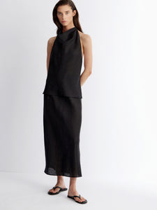 تُعتبر هذه التنورة الماكسي خيارًا أنيقًا للأيام الحارة وتأتي بتصميم غير متماثل وهي مصنوعة من الكتان وتتميز بقصة أنيقة تعانق منحنيات الجسم بكل روعة وتتميز بخصر مطاطي لتعزيز الدعم والراحة. تأتي بلون أسود يسهل تنسيقه بأكثر من طريقة، ما يجعلها قطعة رائعة لإطلالات العمل والعطلات على حد سواء. يمكن تنسيقها مع البلوزة المطابقة من المجموعة لإطلالة متكاملة.