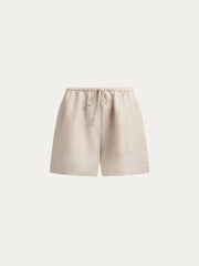 يُعتبر هذا الشورت الخيار الأمثل للأيام الحارة، إذ هو مصنوع من الكتان والميلانج وقد صُمم بقصة فضفاضة وحزام خصر مطاطي ومبطن بالقطن لتعزيز الراحة. يمكن تنسيقه مع قميص مطابق من المجموعة لإطلالة متكاملة.