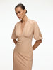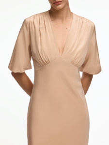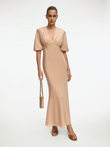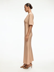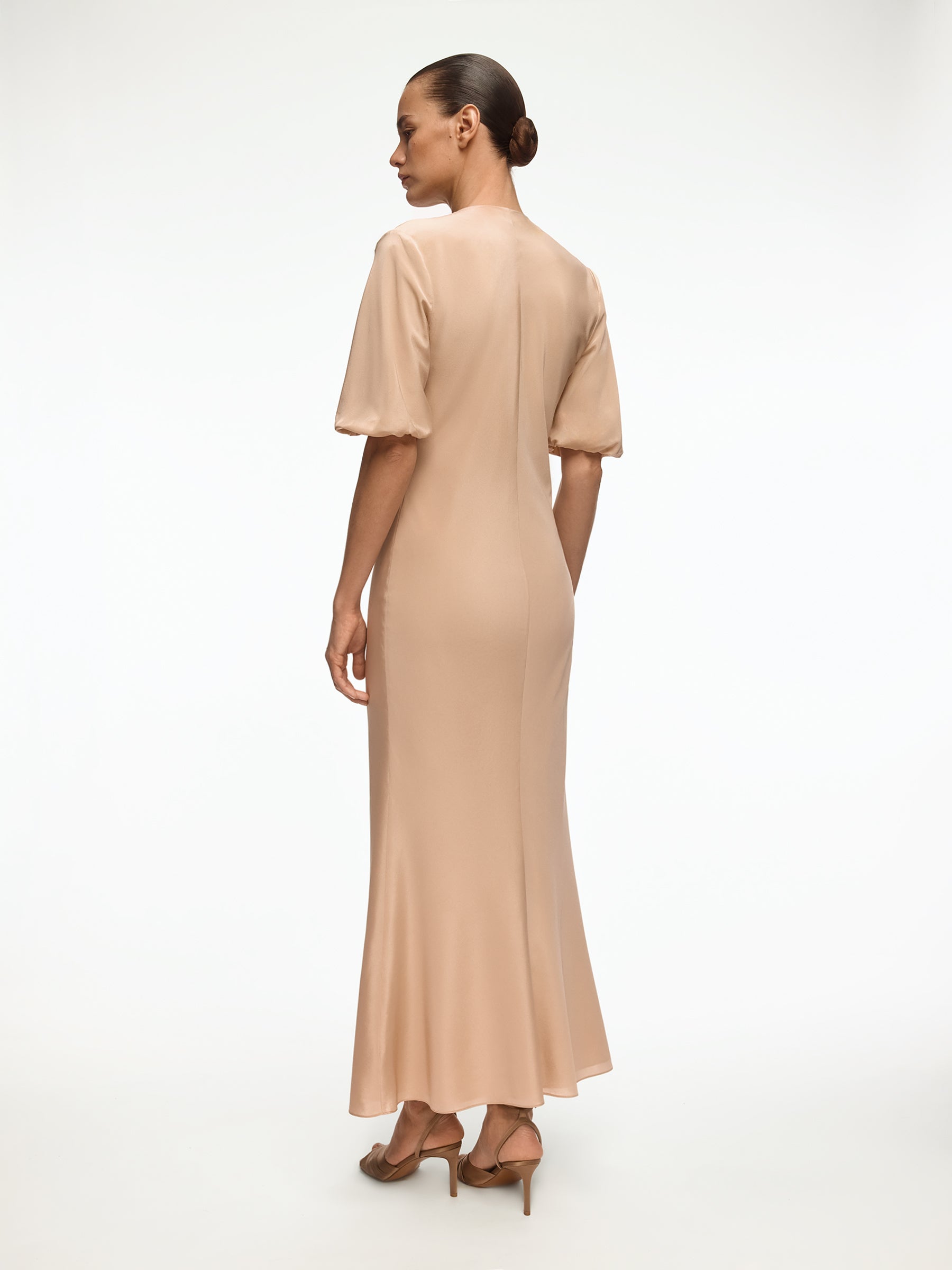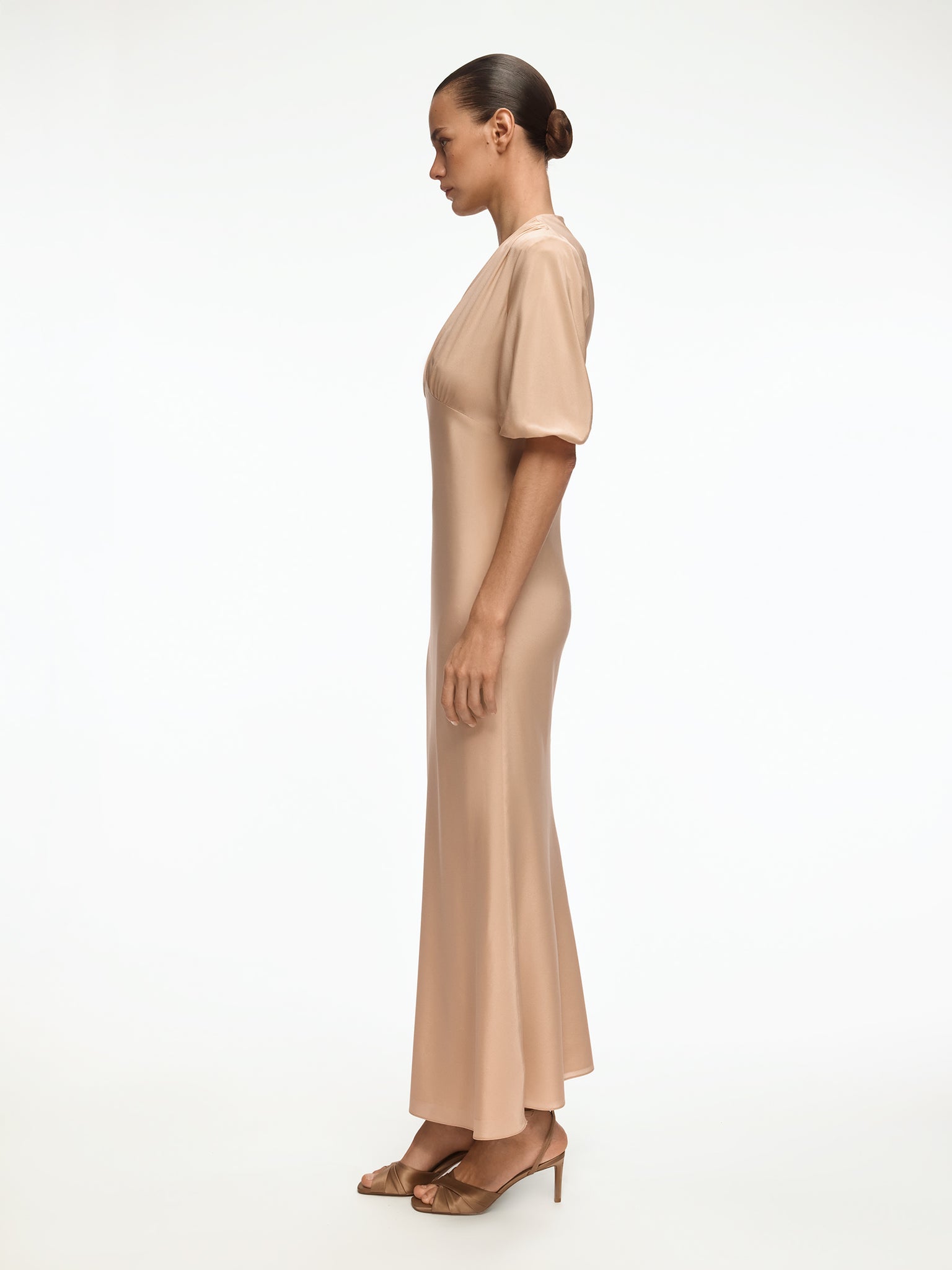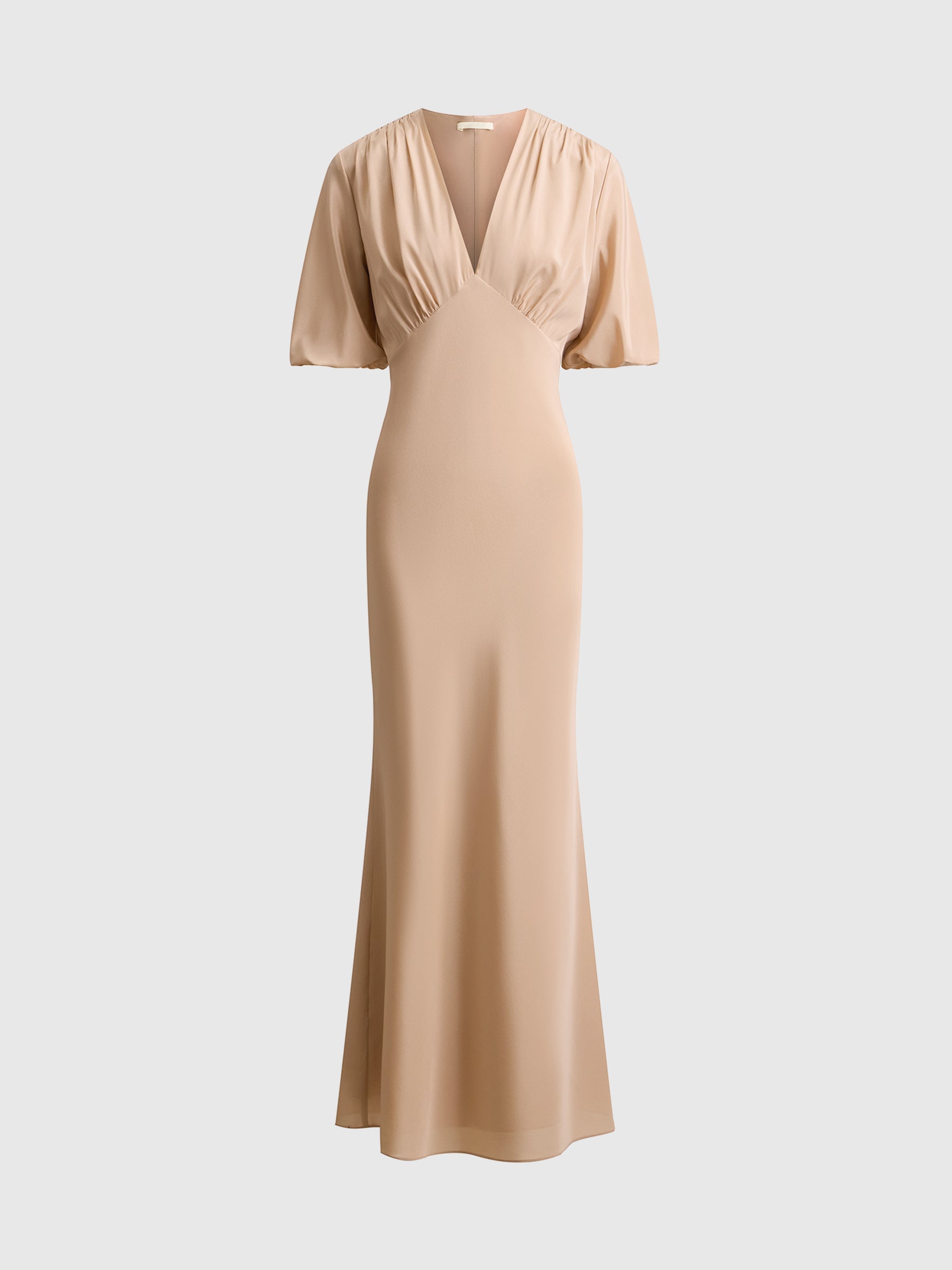 صُنع هذا الفستان من حرير ميلبري شيفون بقصة 16 موميه، ويأتي بلمسة إيلاستان لتعزيز المتانة ولقوام انسيابي متين بفضل لمسة الكريب المموجة. يأتي بقصة مائلة تنحت قوام الجسم بشكل رقيق. ويتميز ببطانة أكتاف خفيفة لتحديد المقاس المحدد، ويمكن إزالتها. كما يتميز ببطانة كاملة لتعزيز الراحة والانسيابية.