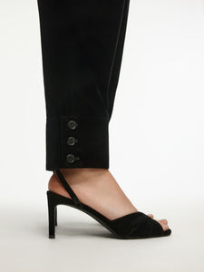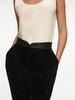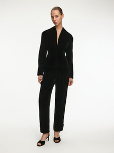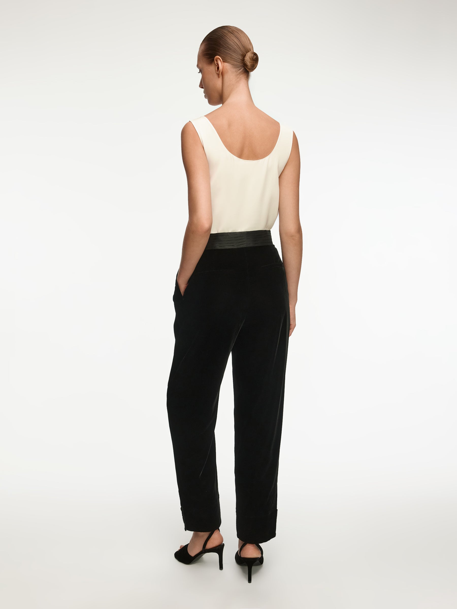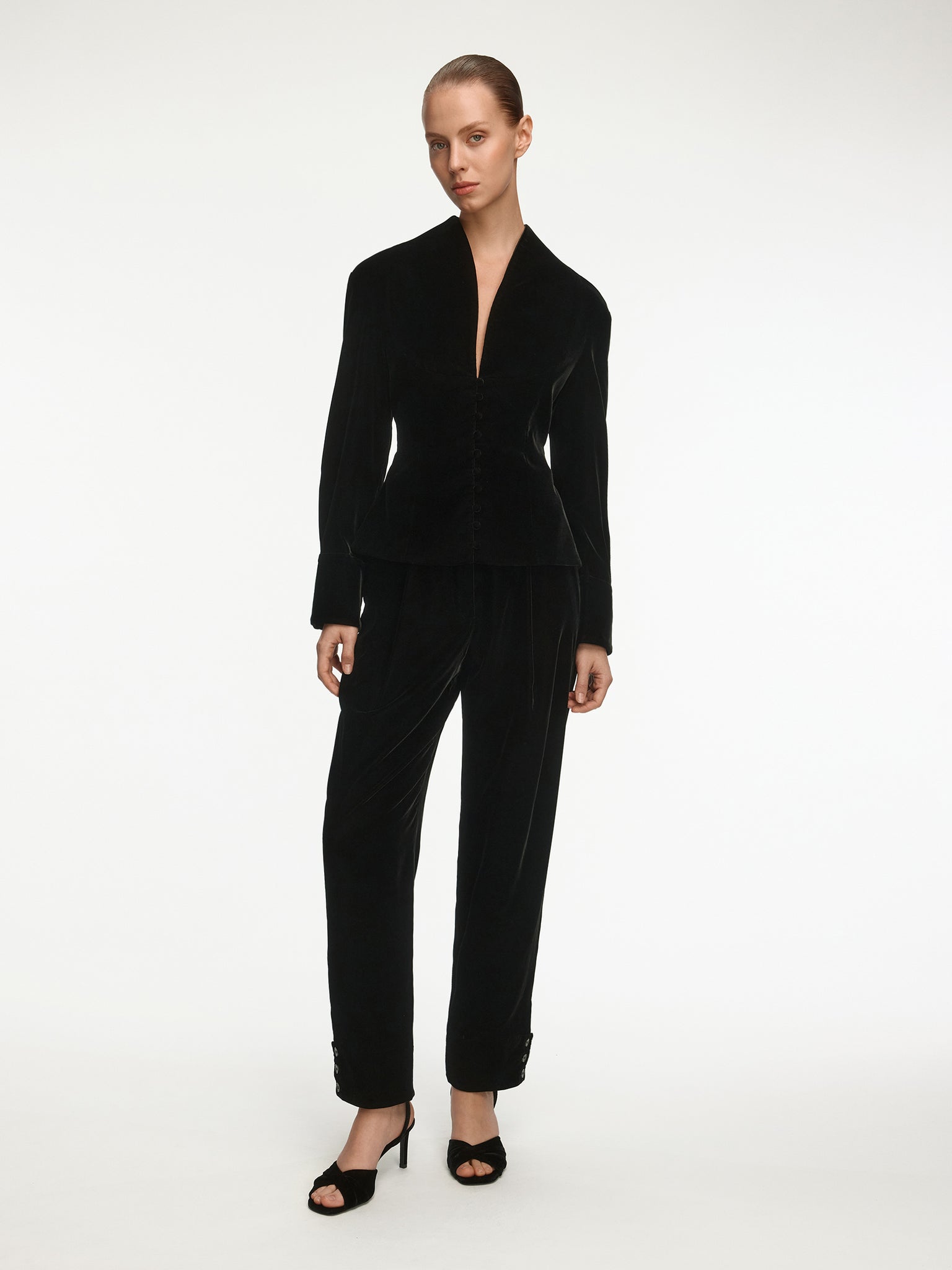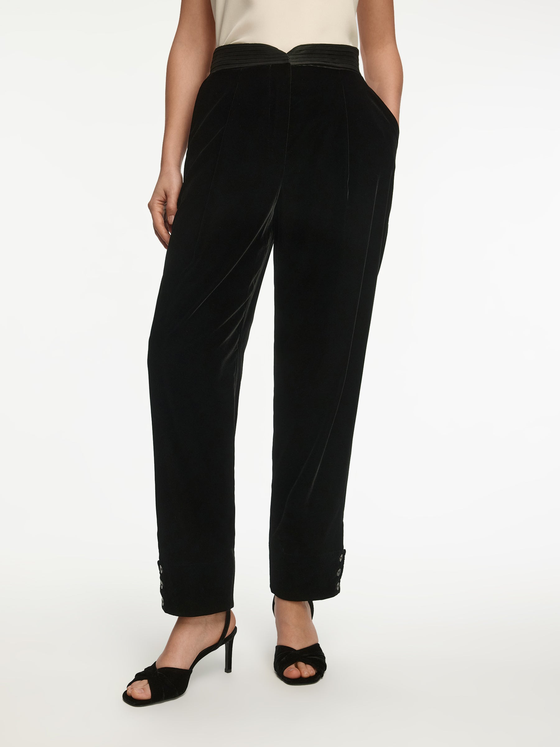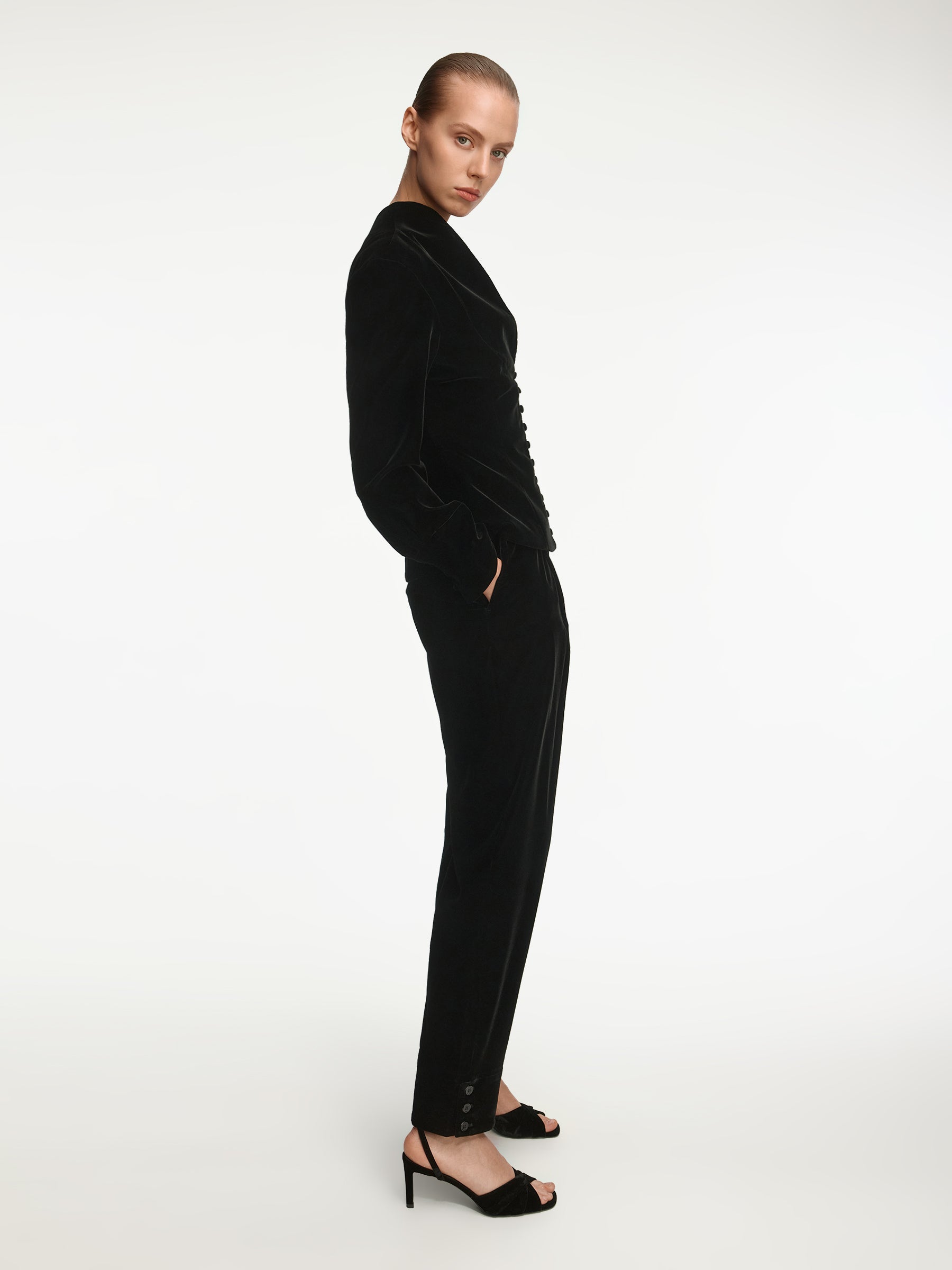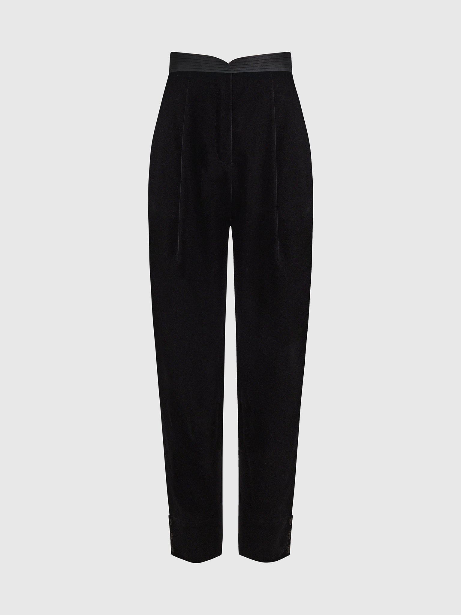 صُنع هذا البنطال المخملي في مصنع أجيارا في اليابان للمخمل وهو المصنع المورد نفسه لكل من علامات أرماني وكوم دي جارسون وبرادا. صُنع من المخمل وقماش كوبرو الناعم وجيد التهوية والانسيابي ويأتي بتقنية وبر متينة لا تفقد قوامها مع الوقت. يأتي بقصة مريحة عند الأرداف تضيق تدريجيًا عند الكاحل ويأتي برباط عريض حريري لتحديد الخصر. يأتي بأزرار عند الأطراف المطوية لإبراز الكاحل أو لإظهار البطانة الحريرية.