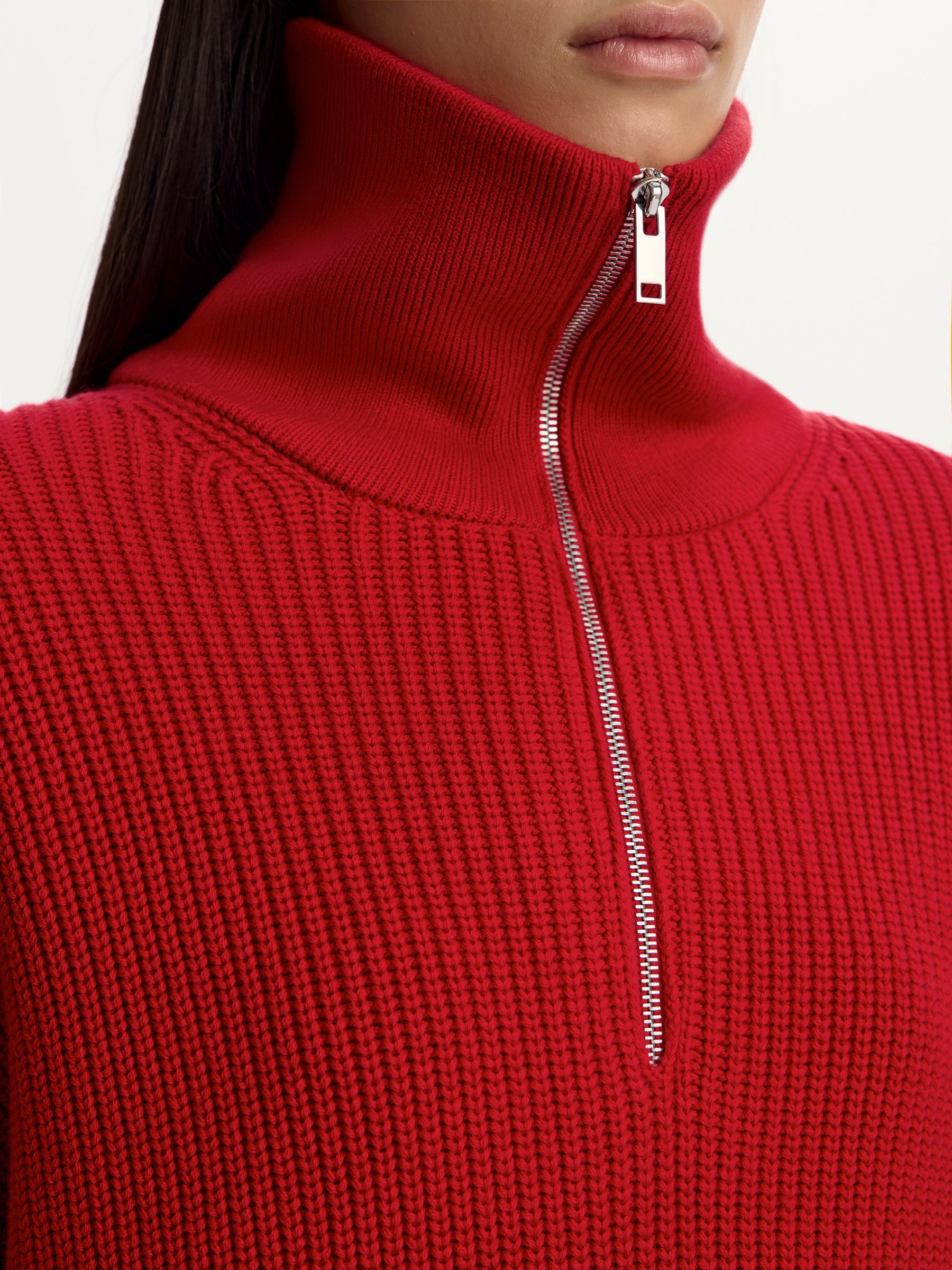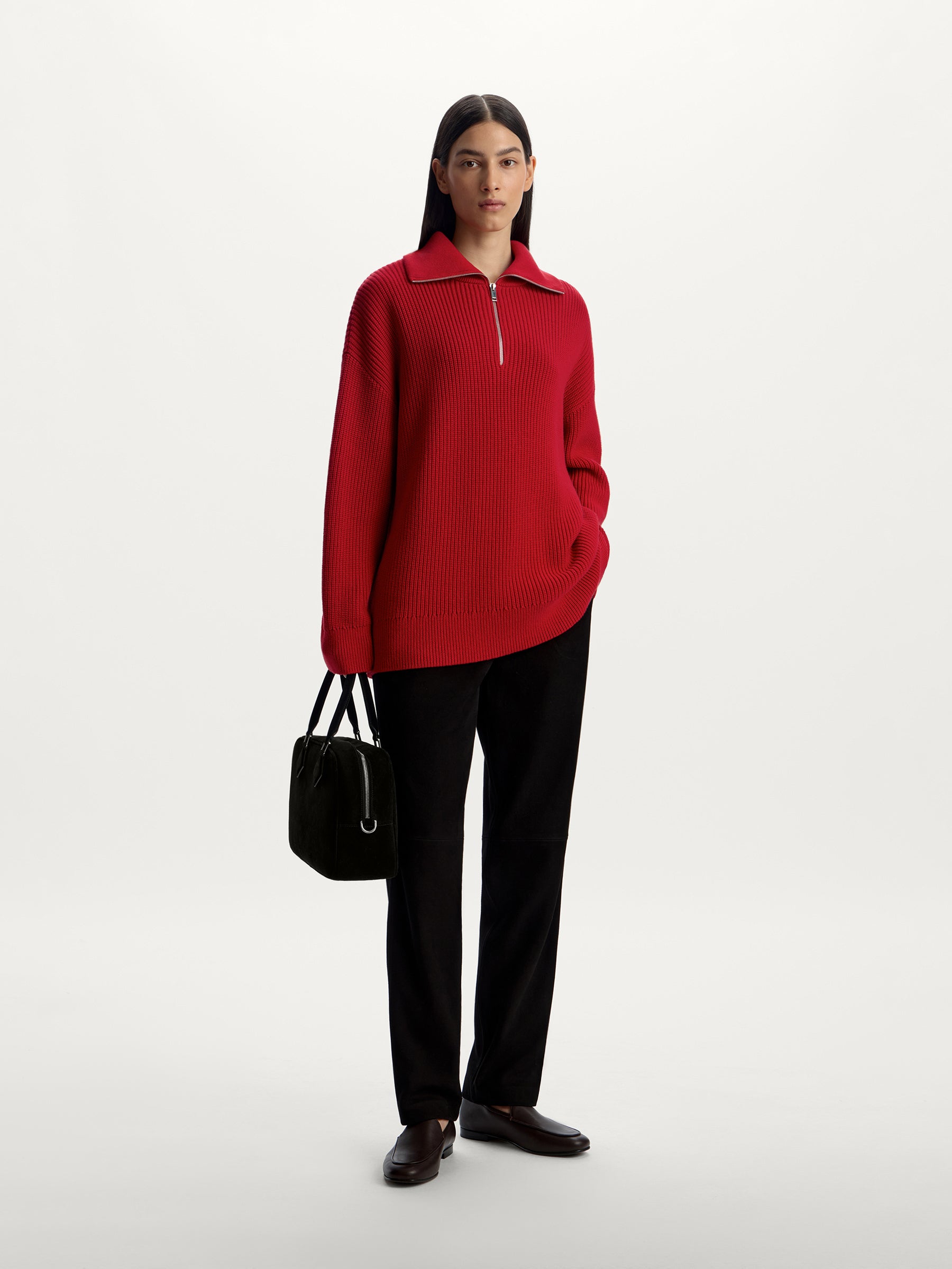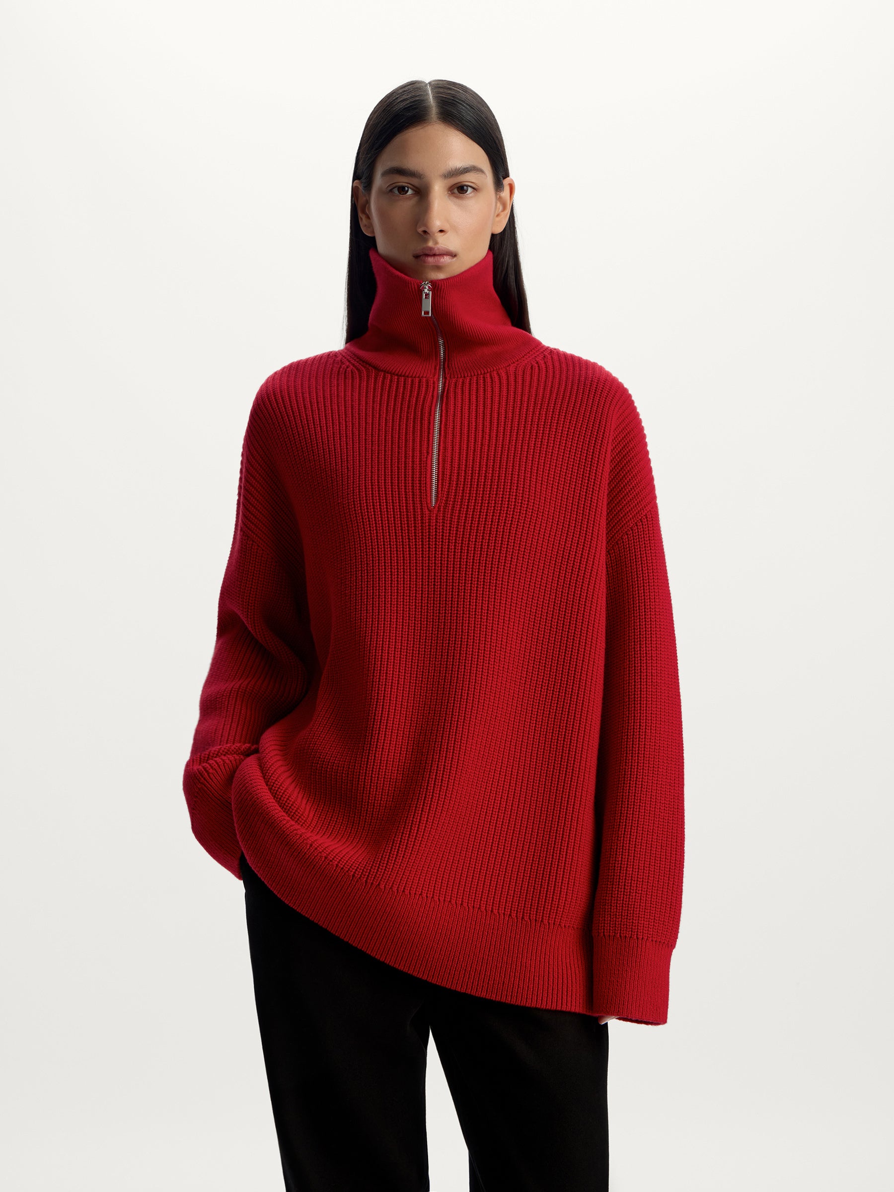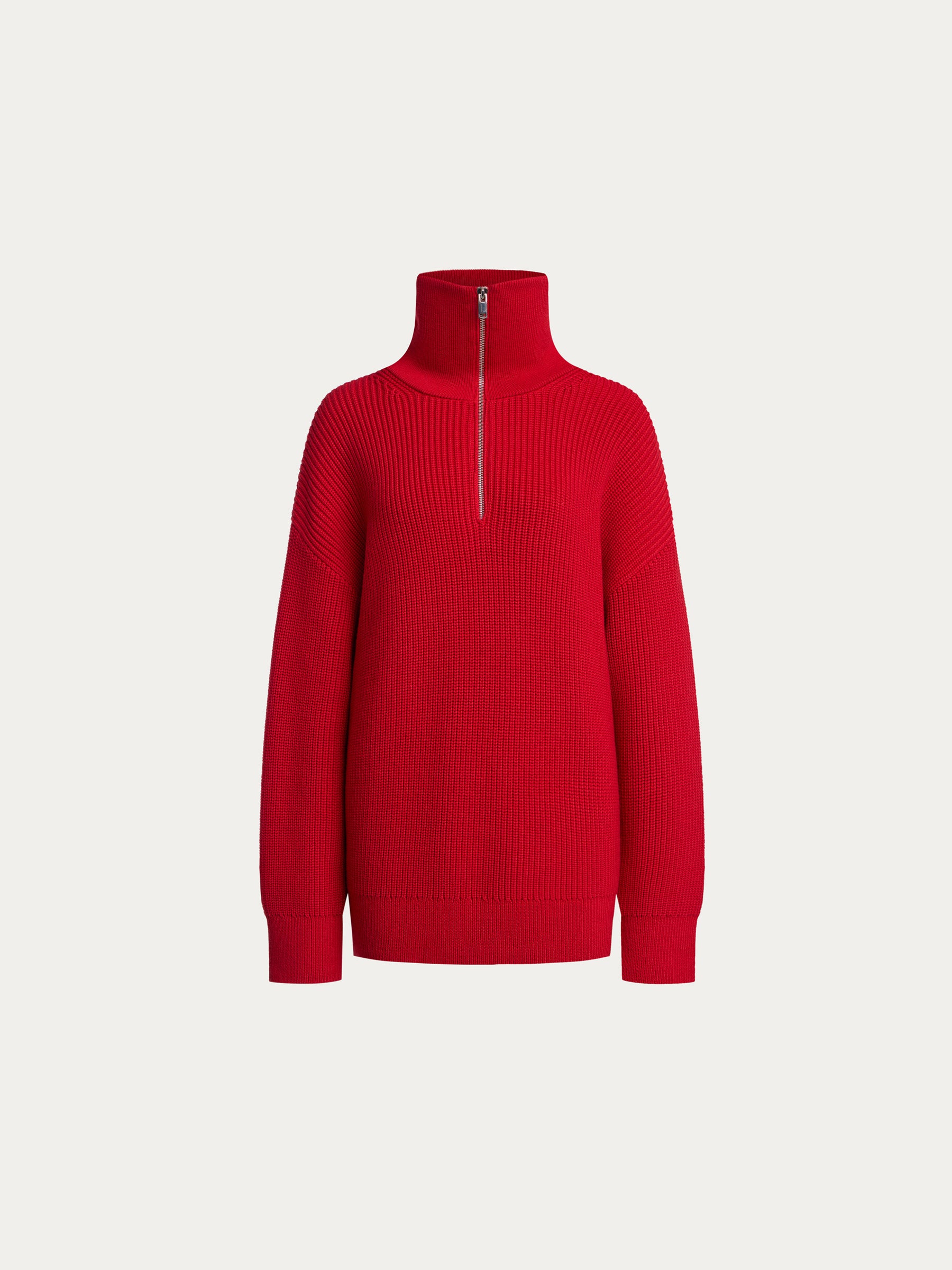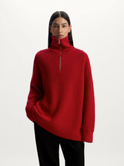 مستوحى من أزياء الرجال التقليدية، تم تصميم هذا الكنزة بقَصَّة سميكة تتميز بكتفين منخفضين ورقبة بسحاب. مصنوع من قطن كثيف وصوف ميرينو أسترالي، يمكن تنسيقه بشكل مثالي فوق التانك توب والتي شيرت.