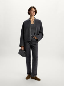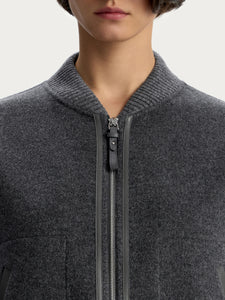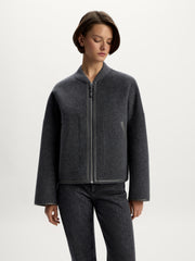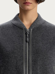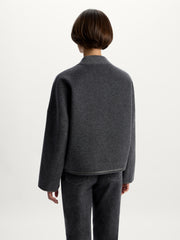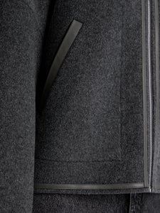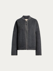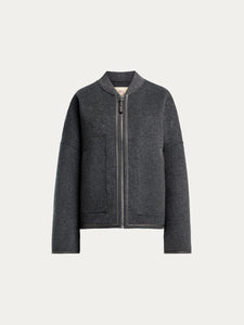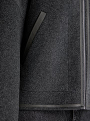 صُنع هذا الجاكيت من صوف المارينو ويأتي بحواف جلدية على طول السحاب والجيوب وقد صُمم بقصة قصيرة وواسعة وأكتاف متدلية وأكمام واسعة. يتميز بقوام ناعم ومتين ودافئ ويأتي بجانب مزدوج للمسة أنيقة وتصميم غير مبطن، ولإطلالة رائعة من الداخل والخارج.