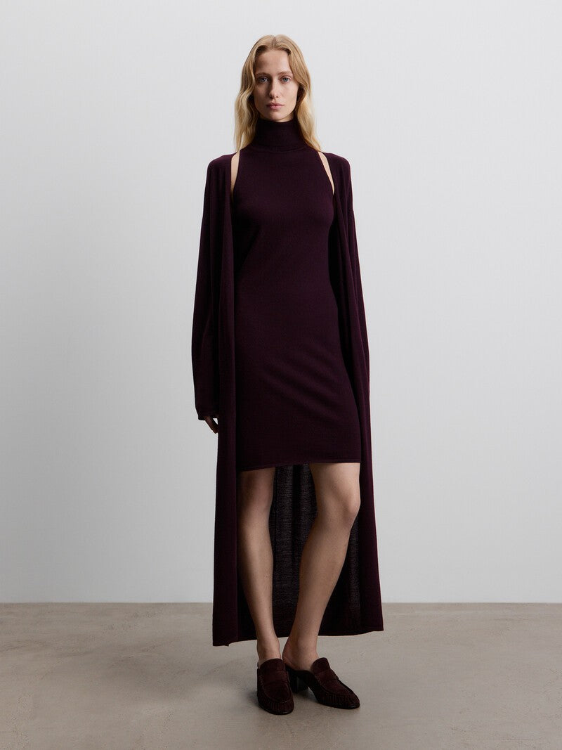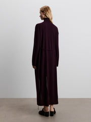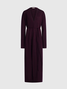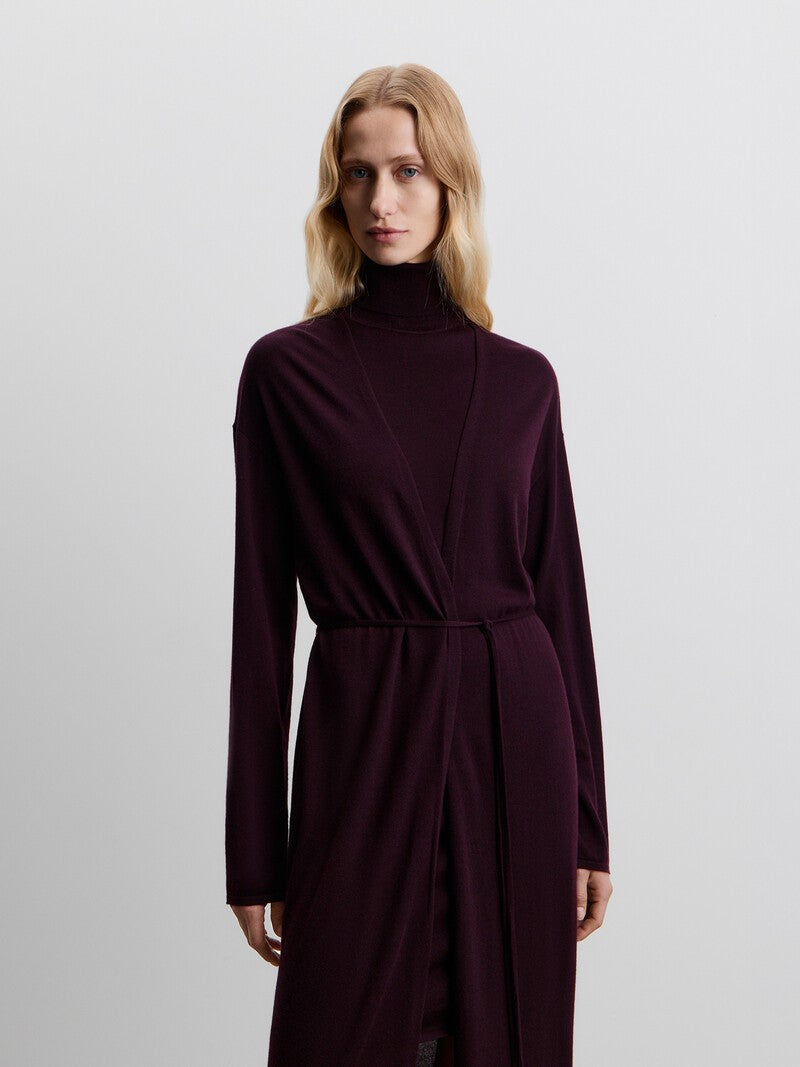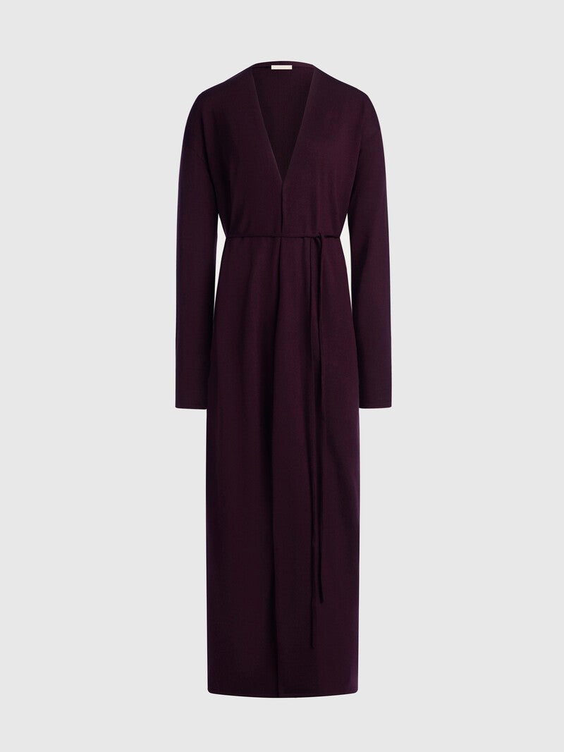 يُعتبر هذا الكارديغان قطعة مرحية للأمسيات الصيفية ويأتي بتصميم طويل ويتميز بحزام أنيق لتحديد الخصر. صُنع من مزيج فاخر من صوف المارينو والحرير الناعم بلمسة لامعة.