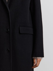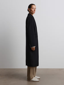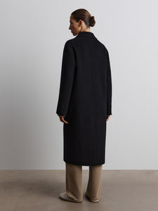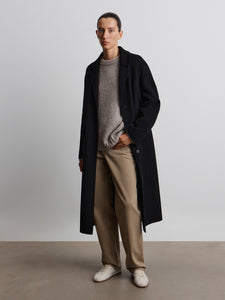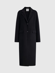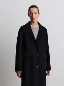 A timeless coat in a single-breasted silhouette with a lapel collar, crafted in a versatile black shade. Made using a double-face technique from merino wool, it’s lining-free, offering the same soft texture inside and out.