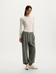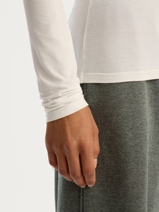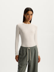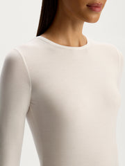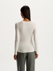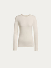 تُعتبر هذه البلوزة طويلة الأكمام قطعة أساسية يسهل تنسيقها بأكثر من طريقة وهي مصنوعة من مزيج الحرير والمودال والإيلاستان المطاطي والناعم وجيد التهوية وقد صُممت بقصة ضيقة وياقة دائرية كلاسيكية وتصميم ضيق عند الأكمام لسهولة وضعها أسفل البنطال أو التنانير. يمكن تنسيقها مع ملابس داخلية غير مدروزة لإطلالة متألقة.