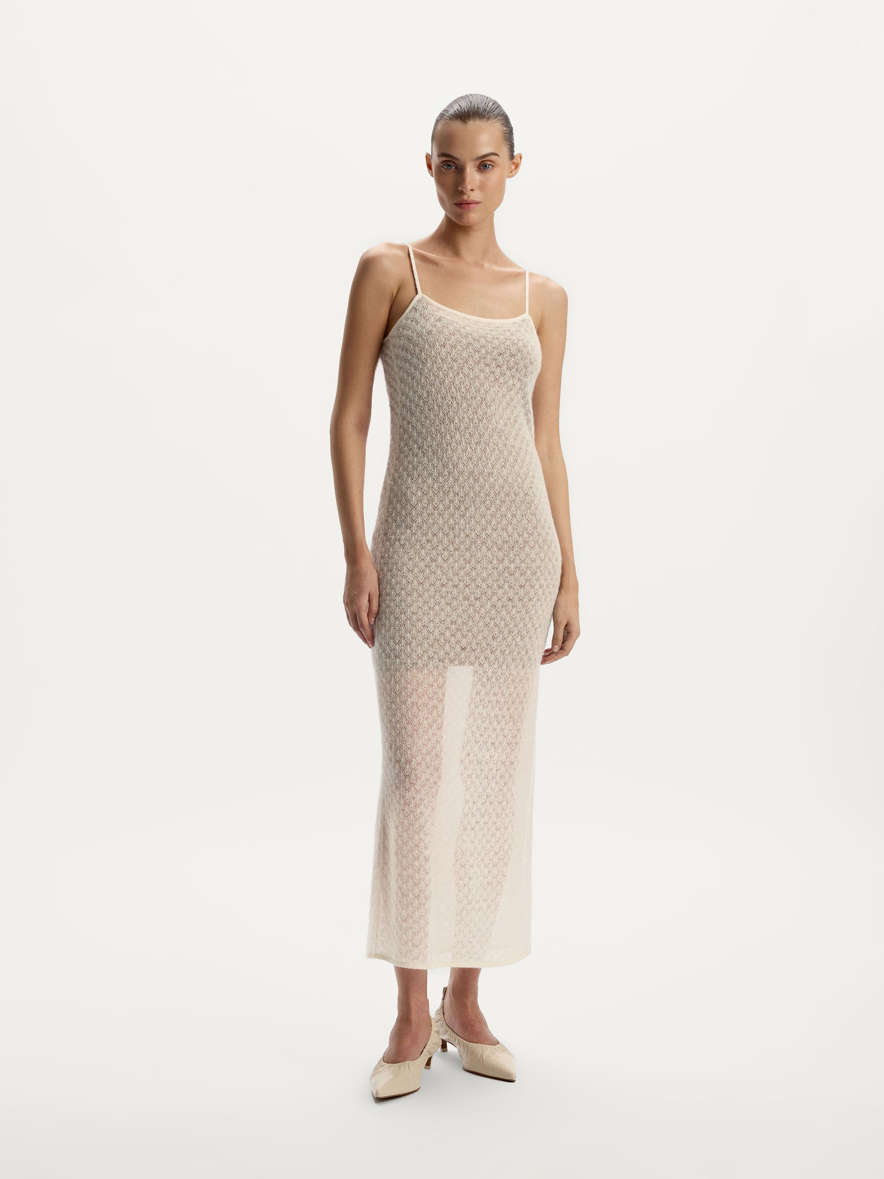 يُعتبر هذا الفستان إضافة منعشة حيوية إلى الفساتين الأخرى الكلاسيكية ويتميز بطبقتين قماشيتين رقيقتين للتمتع بقصة أنيقة، ما يجعله مثاليًا للأمسيات المميزة. يأتي بطبقة قماشية علوية من الموهير الناعم بنمط محبوك متداخل يلفت الأنظار، ويأتي بطبقة سفلية سهلة الارتداء للتنعم بالراحة.