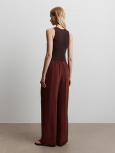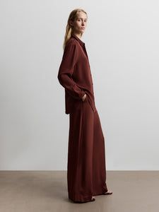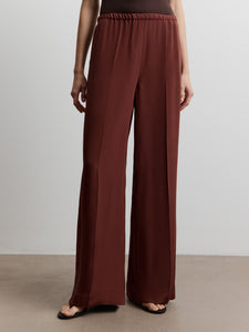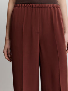 يُعتبر هذا البنطال خيارًا رسميًا لإطلالات العمل والمناسبات اليومية الأخرى، فهو مصنوع من حرير ميلبري الكثيف غير اللامع وقد صُمم بقصة مريحة مستقيمة عند الساقين ويأتي بحزام خصر مطاطي. يمكن تنسيقه مع القميص المطابق من المجموعة.