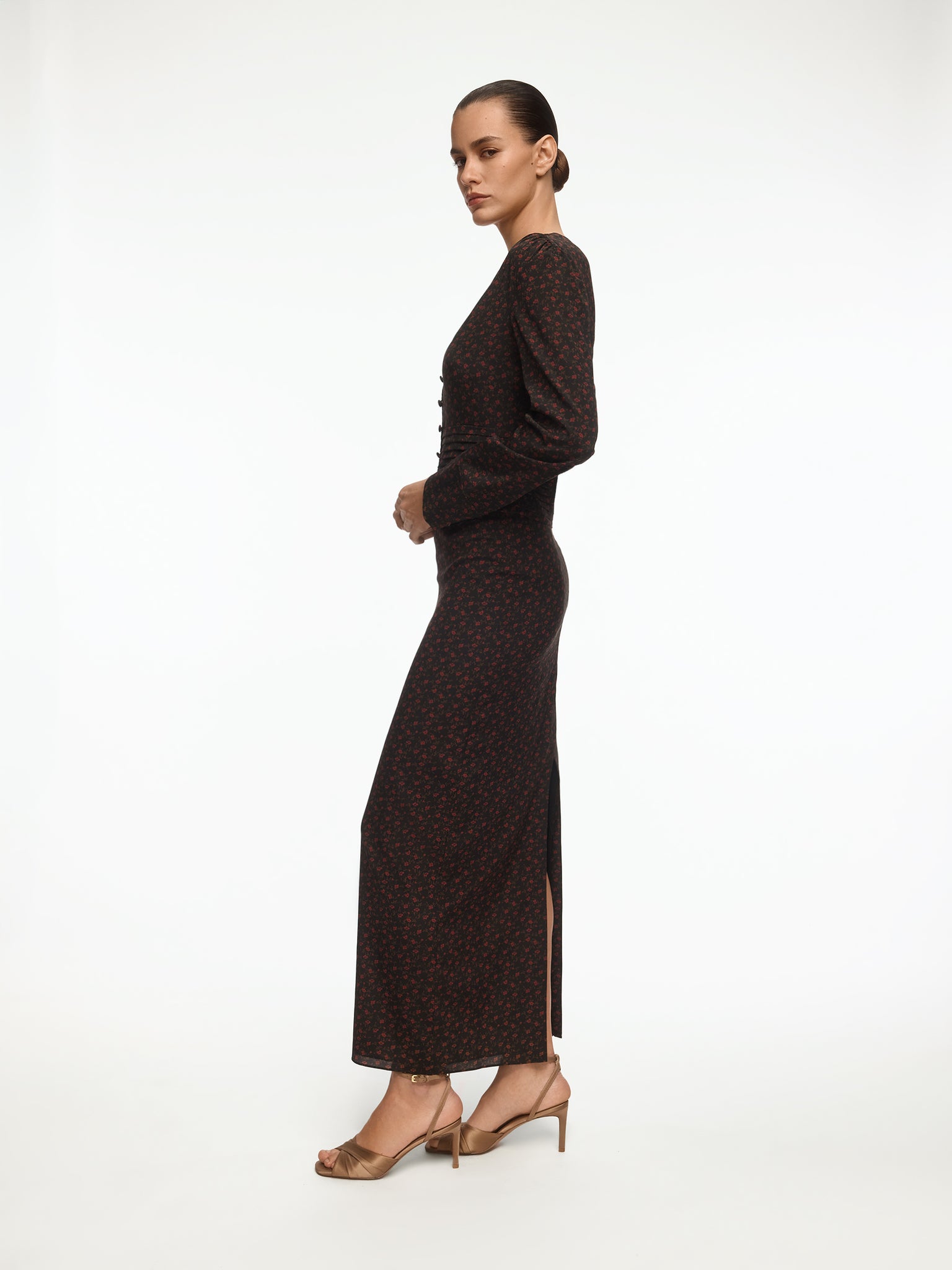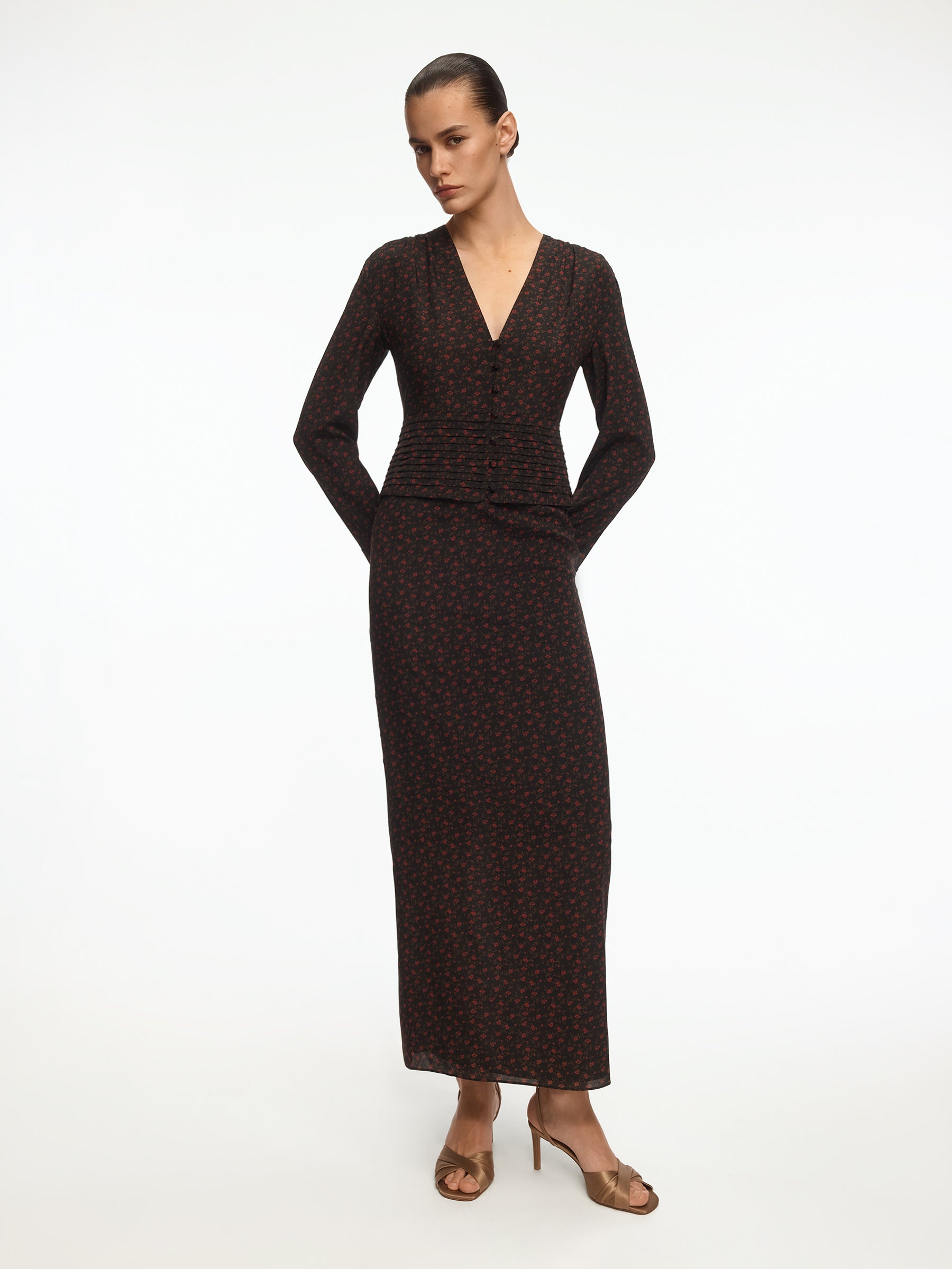 صُنعت هذه البلوزة من حرير ميلبري والشيوف وتأتي بقصة 16 موميه للتنعم بقوام خفيف الوزن وشبه شفاف ونمط كريب مموج. تزدان بطبعات مستوحاة من تصاميم القرن العشرين التي وجدها أعضاء فريقنا في دار برومير فيزيون فاشن للأقمشة. صُممت بقصة مريحة عند منطقة الصدر وياقة بنمط حرف V وتأتي بطيات محددة الشكل عند الخصر. يمكن تنسيقها مع البلوزة المطابقة لدى المجموعة.