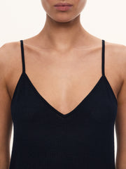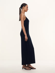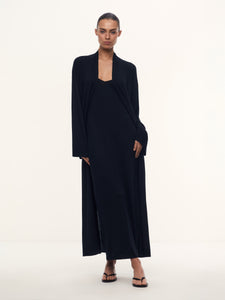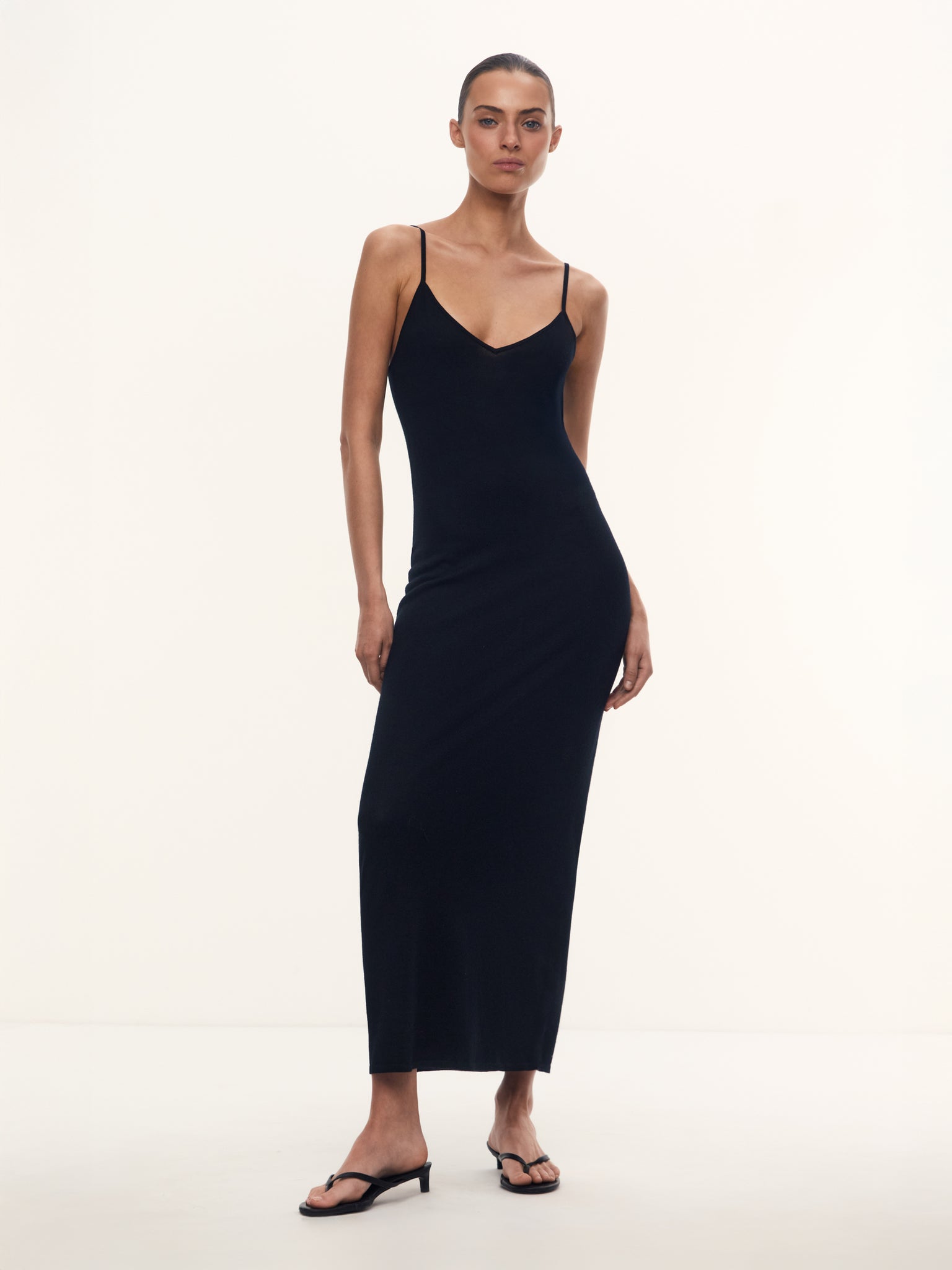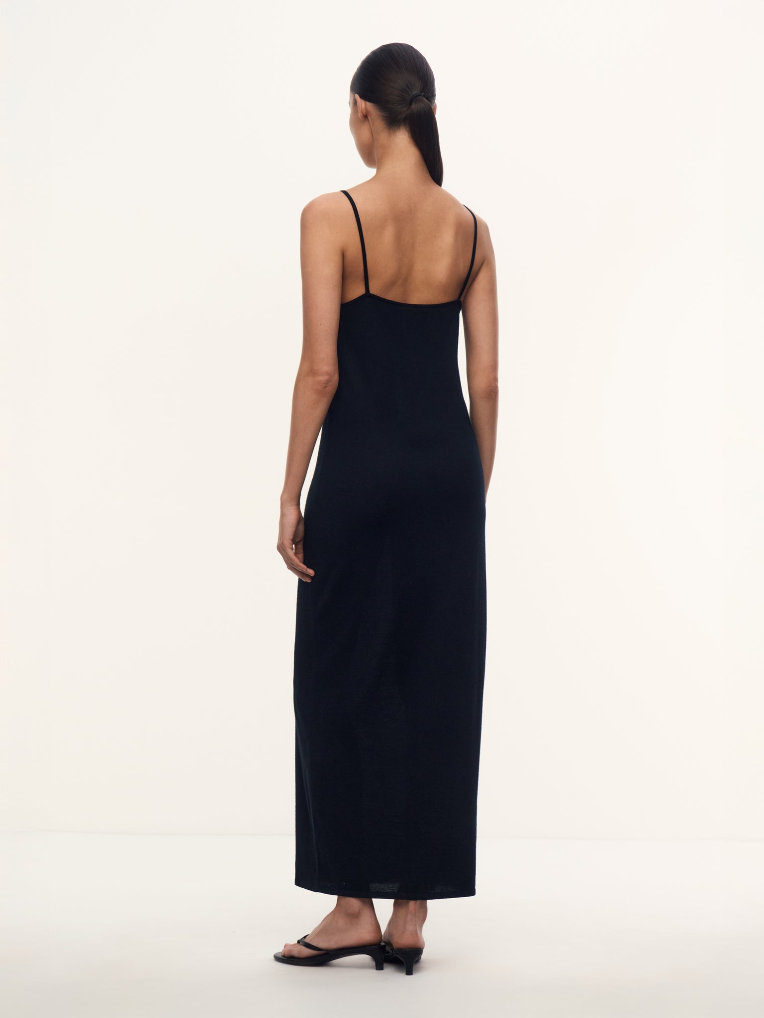 يأتي فستان الماكسي هذا بقصة مريحة أنيقة وهو محبوك من مزيج صوف المارينو والحرير الفاخر والانسيابي والناعم ليخطف الأنظار فيما تتحركين. صُمم بقصة أنيقة وياقة بنمط حرف V وحمالات كتف رقيقة وحاشية بطول يلامس الكاحل وتصميم مكشوف قليلاً من الخلف. يمكن تنسيقه مع الكارديغان المطابق من المجموعة.