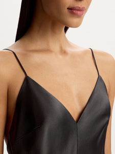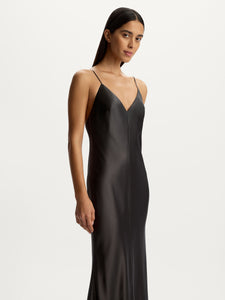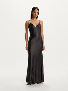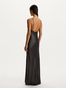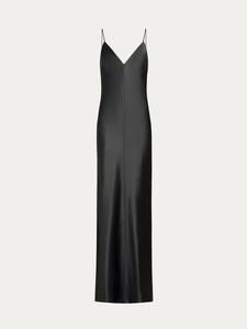 يُعتبر هذا الفستان قطعة مثالية للمناسبات المميزة وقد صُمم بنمط مائل وهو مصنوع من الساتان اللامع ويأتي بتصميم منسدل يعانق منحنيات الجسم عند كل خطوة. صُمم بقصة مريحة فضفاضة ويتميز بتصميم مكشوف من الخلف للتألق وخطف الأنظار.