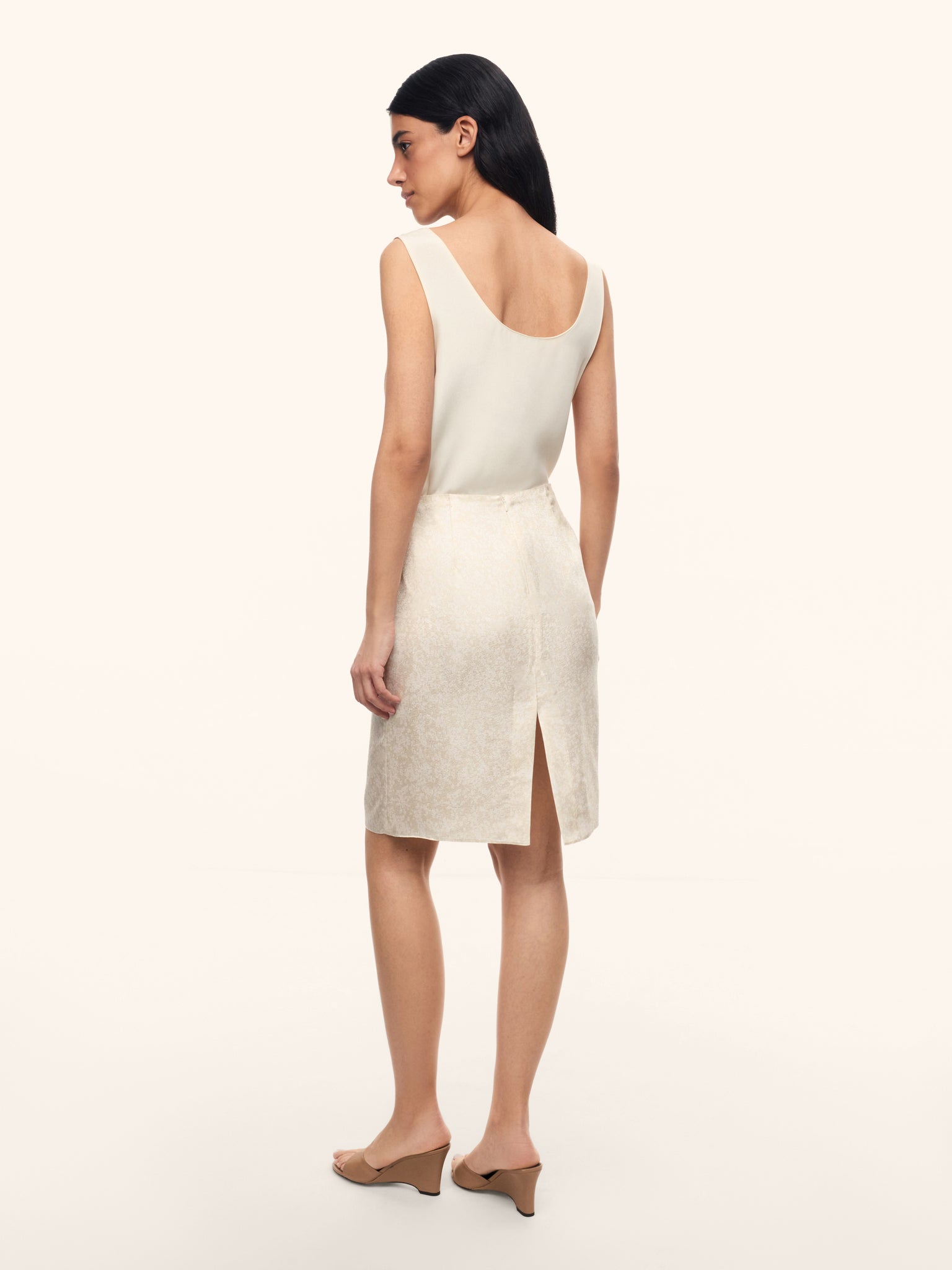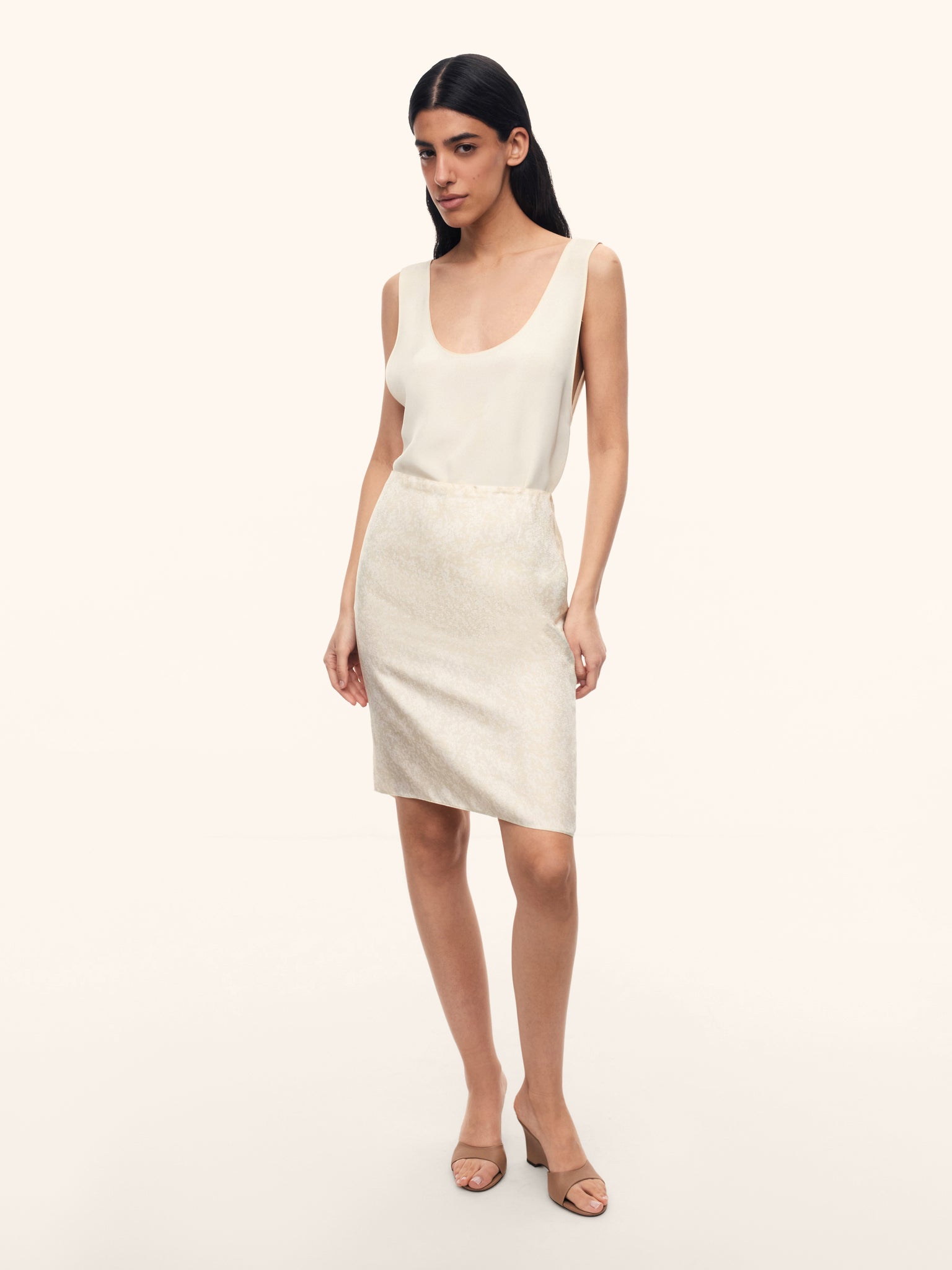 This skirt is cut from dense silk with a vintage-inspired floral motif, printed to mimic the look of jacquard. Sitting just below the waist. it gently skims the hips and features a back slit for ease of movement.
