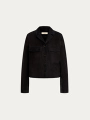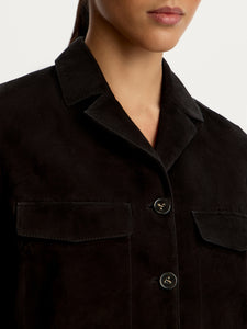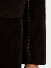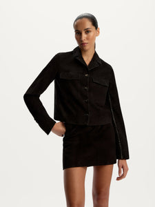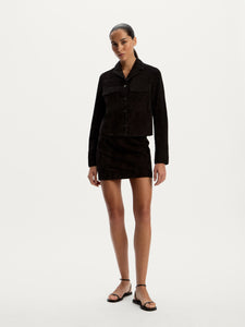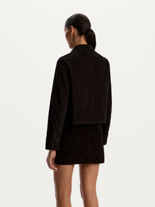 يُعتبر هذا الجاكيت نسخة محدثة مصقولة عن التصاميم الكلاسيكية مغلقة الأزرار وقد صُمم بقصة مريحة قصيرة وأكتاف منخفضة. صُنع من جلد السويد المرن ويأتي بلمسة مخملية ويتميز بجلد منسوج يدويًا عند الجانبين ودرزات الأكمام. يأتي ببطانة كاملة لتعزيز الراحة. يمكن تنسيقه مع التنورة المطابقة لدى 12STOREEZ لإطلالة متكاملة.