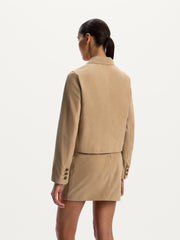 يُعتبر هذا الجاكيت نسخة محدثة مصقولة عن التصاميم الكلاسيكية مغلقة الأزرار وقد صُمم بقصة مريحة قصيرة وأكتاف منخفضة. صُنع من جلد السويد المرن ويأتي بلمسة مخملية ويتميز بجلد منسوج يدويًا عند الجانبين ودرزات الأكمام. يأتي ببطانة كاملة لتعزيز الراحة. يمكن تنسيقه مع التنورة المطابقة لدى 12STOREEZ لإطلالة متكاملة.