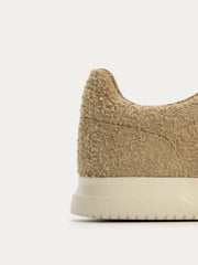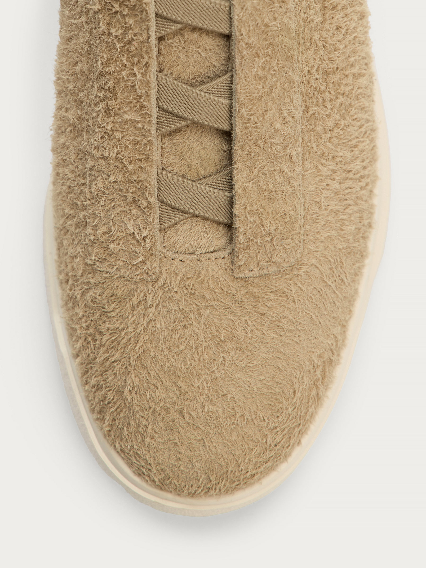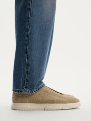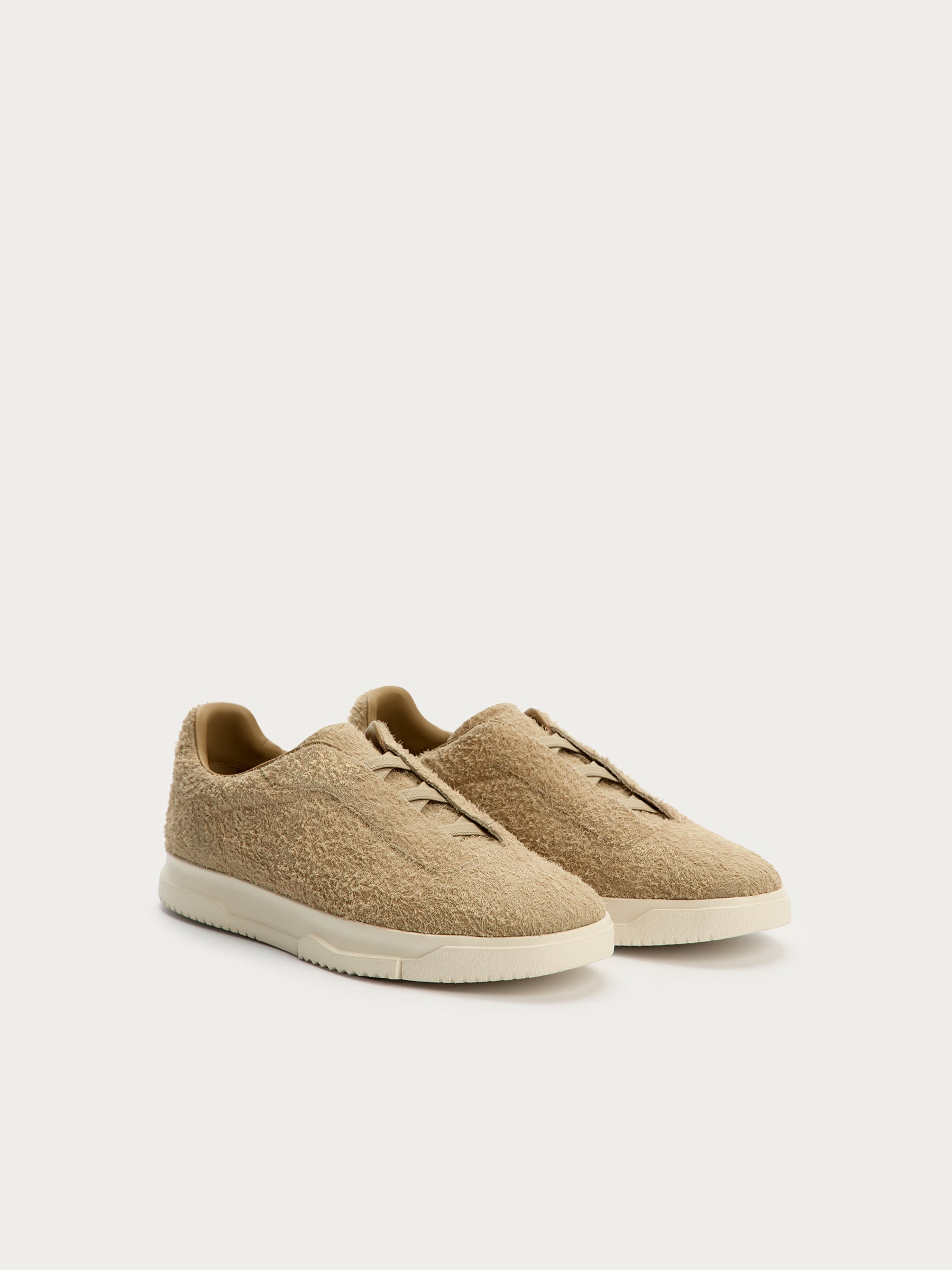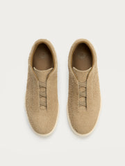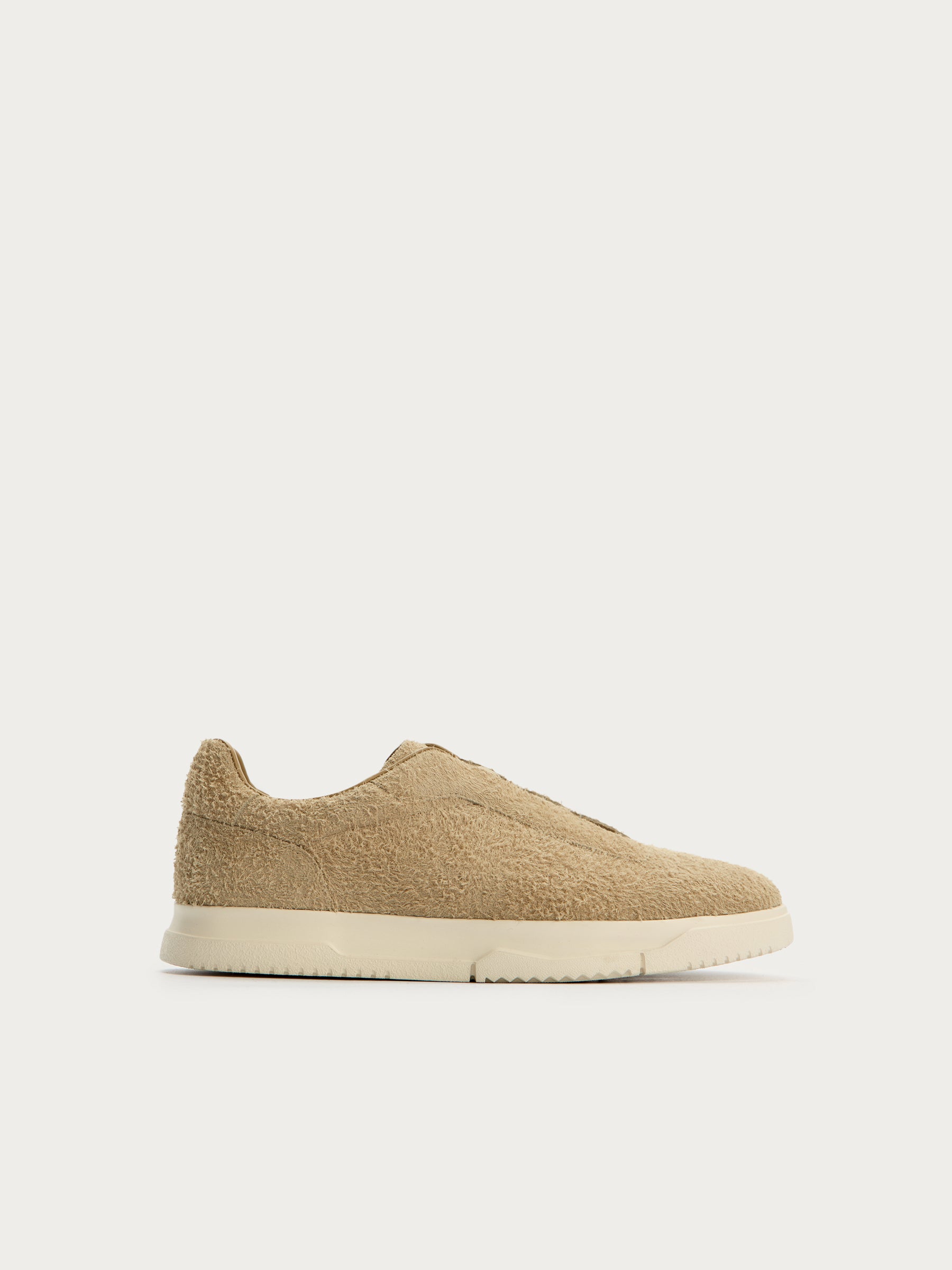 يتميز حذاء السنيكرز بطابع مريح للغاية وهو مصنوع من جلد السويد الثقيل المخملي ويتميز بقطع قماشية مطاطية عوضًا عن الأربطة. يأتي بحواف من الجلد الناعم وبطانة منسوجة من قماش جيد التهوية ونعل مبطن للتنعم بالراحة طيلة اليوم. يأتي بنعل مقوام للانزلاق لضمان المتانة والثبات.