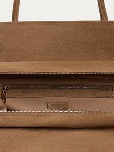 تدمج حقيبة توت هذه بشكل مثالي ما بين الطابع العصري والعملي وهي مصنوعة من جلد السويد بلون بني داكن وتتسع بشكل مثالي لمستلزماتك أثناء التنقل. تأتي بقصة محددة الشكل وحواف علوية محددة وقسم رئيسي وجيوب داخلية. تأتي بقاعدة معدنية للحماية من الخدوش وتتميز بمقابض من جلد السويد معززة برباط داخلي لتعزيز المتانة.