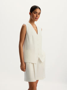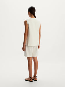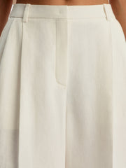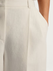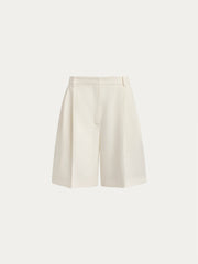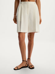 A tailored pair for the summer season, these Bermuda shorts are crafted from a suit blend of linen and poly-viscose, featuring a clean silhouette with front pleats and side pockets. The fabric combines the lightness of linen with the smooth feel of synthetic fibers, helping the shorts hold their shape and wrinkle less.