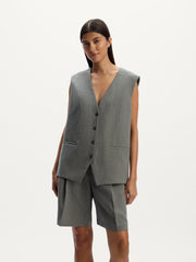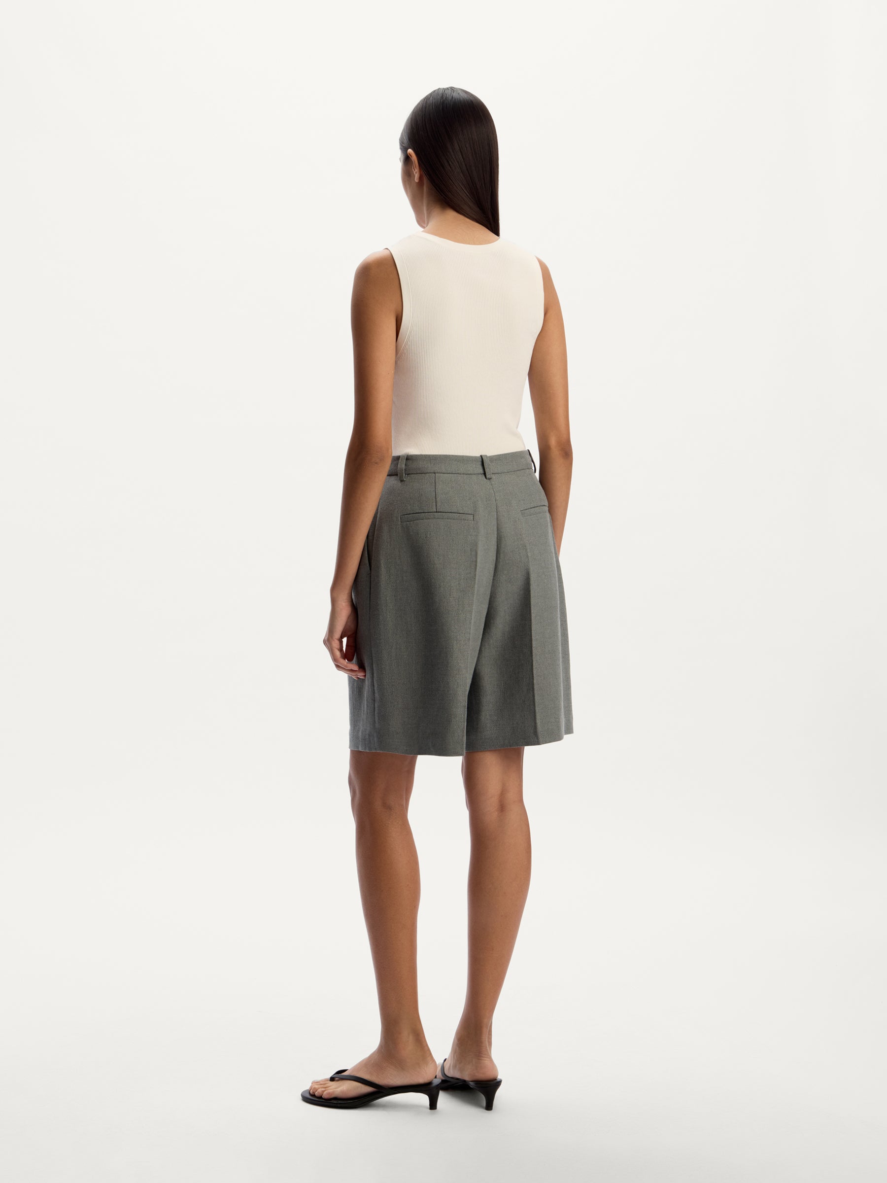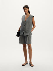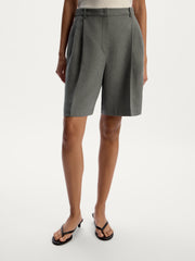 A tailored pair for the summer season, these Bermuda shorts are crafted from a suit blend of linen and poly-viscose, featuring a clean silhouette with front pleats and side pockets. The fabric combines the lightness of linen with the smooth feel of synthetic fibers, helping the shorts hold their shape and wrinkle less.