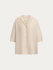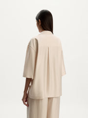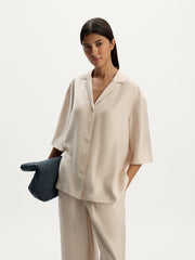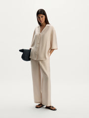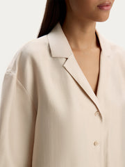 يأتي هذا القميص بأسلوب بيجاما مريح وهو مصنوع من فيسكوز شبه لامع جيد التهوية من تاكيسادا، وهو مصنع ياباني بخبرة تمتد لأكثر من 150 سنة في المجال. يأتي بقوام ناعم وخفيف الوزن للأيام الحارة ويمكن تنسيقه بمفرده أو مع البنطال المطابق من المجموعة.