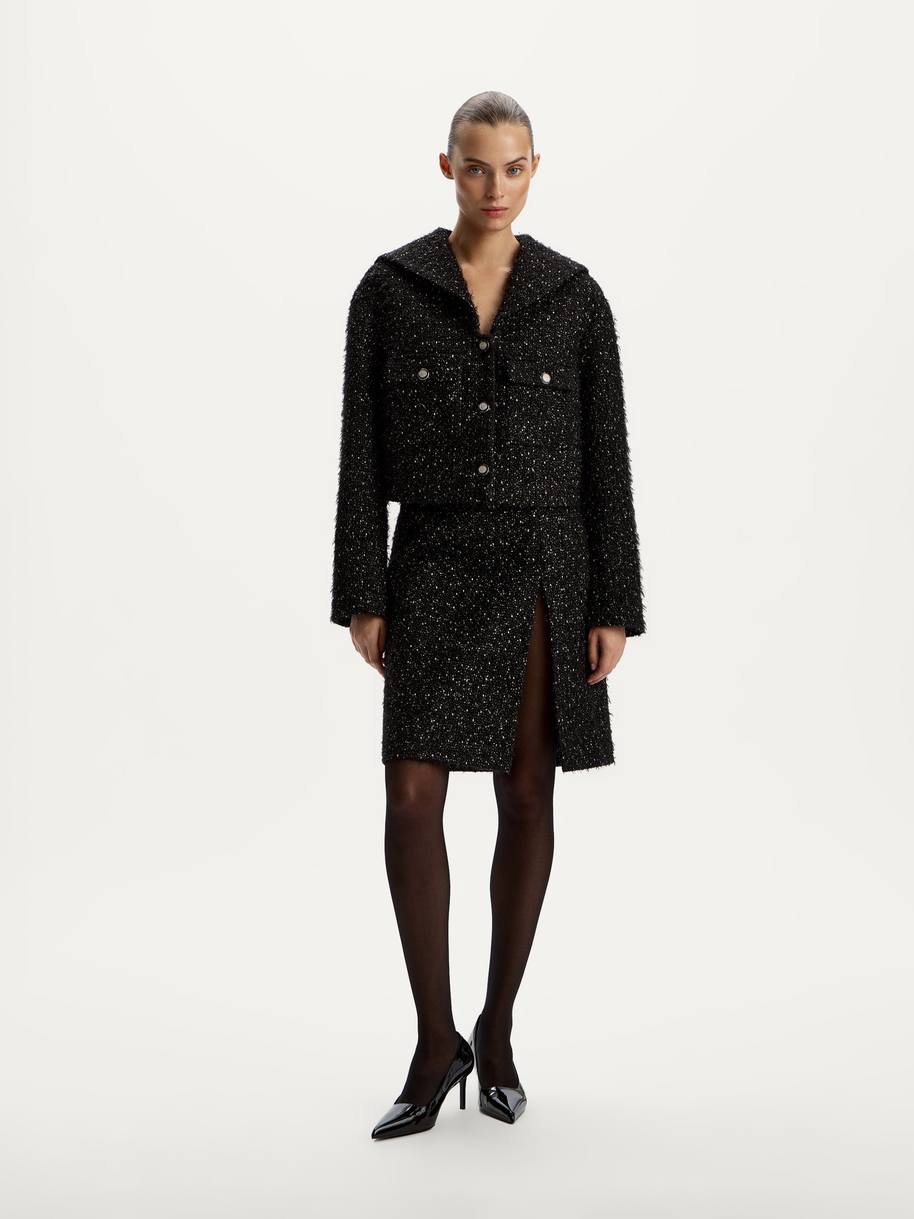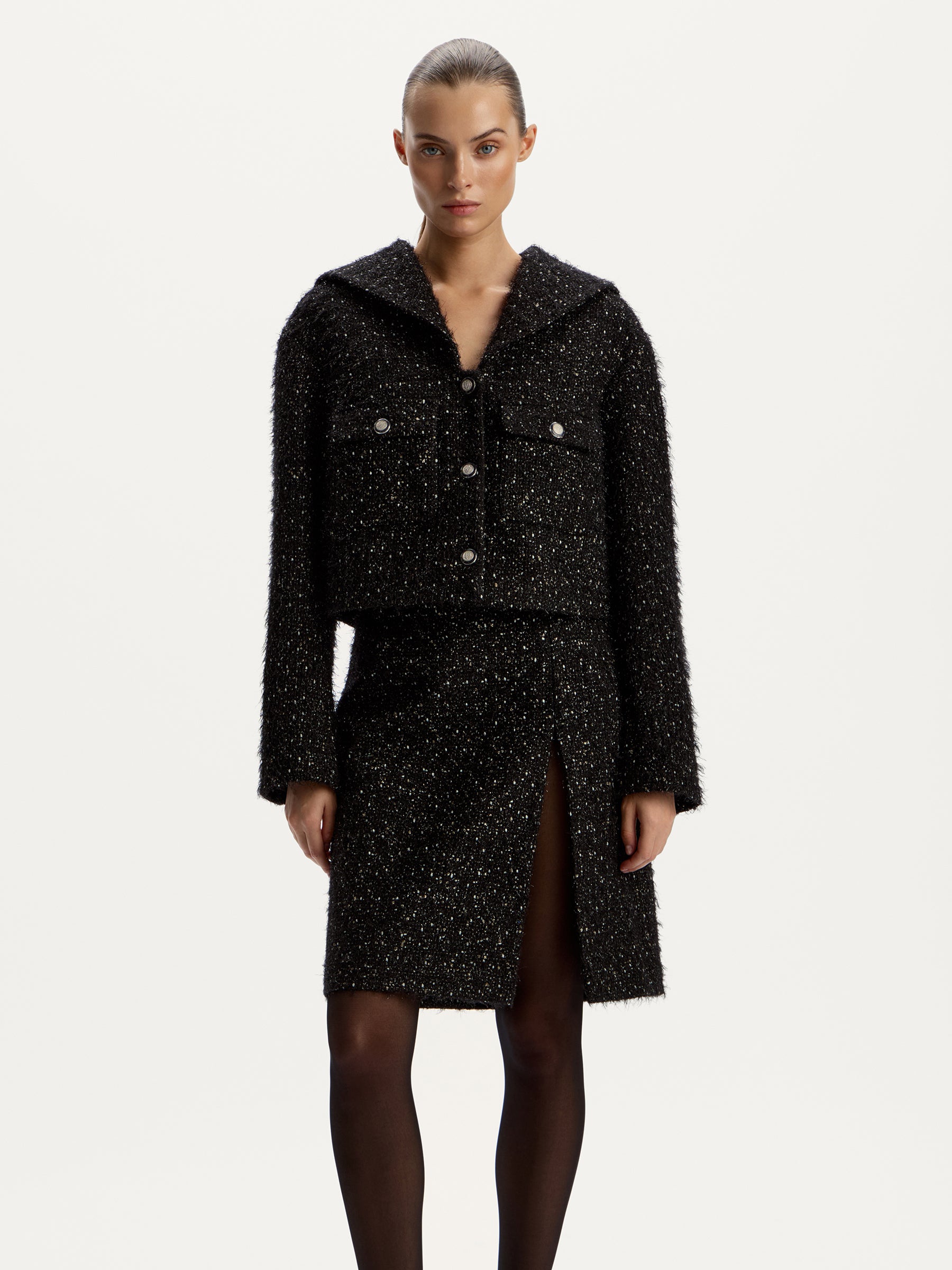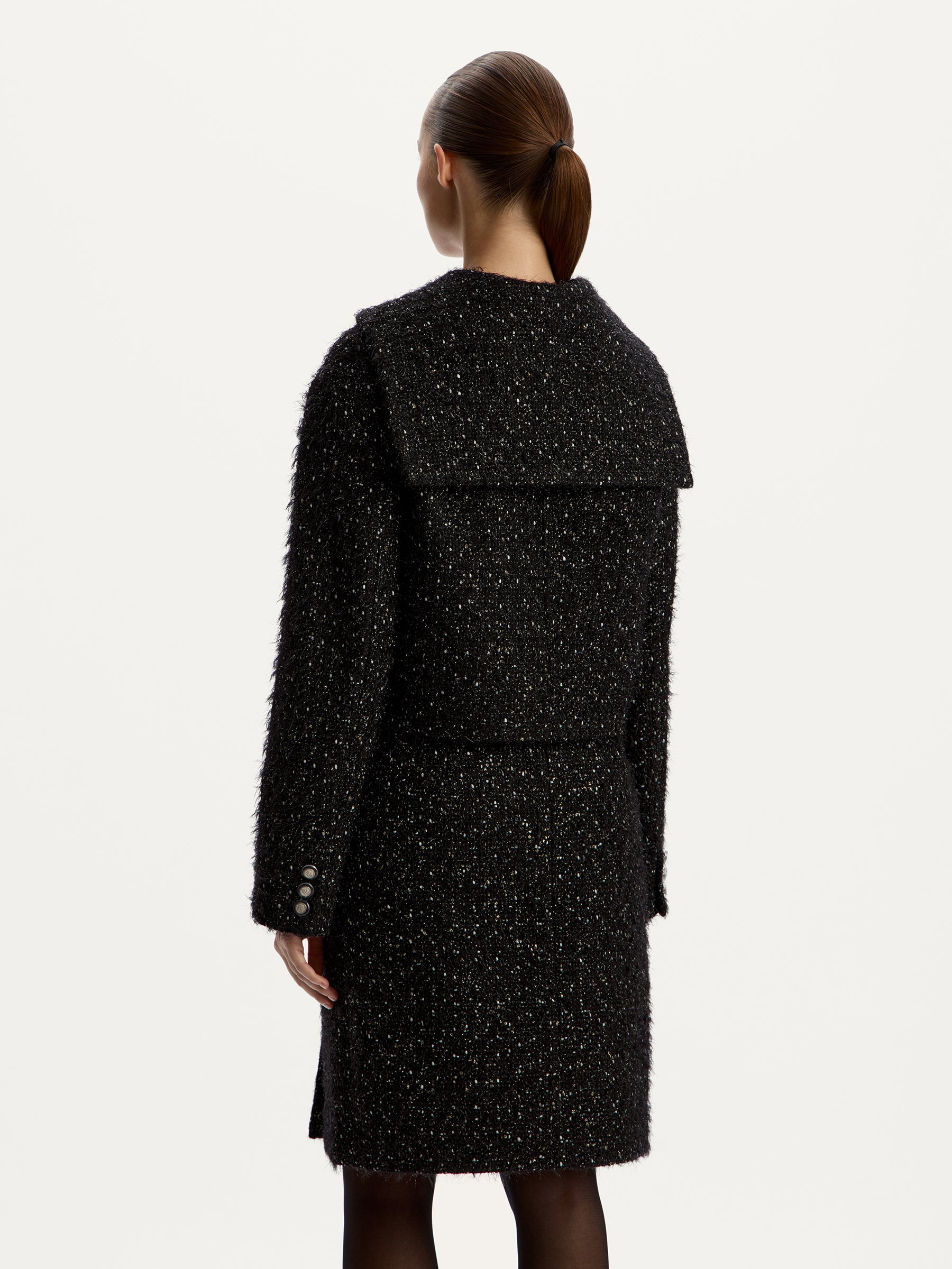 صُنع هذا البليزر من قماش التويد واللوريكس اللامع، ما يجعله مثاليًا للمناسبات المميزة. يتميز بياقة عريضة مستوحاة من الطابع الجمالي لحياة البحرية. يأتي بصوف معزز لتشعري بالراحة والدفء. يمكن تنسيقه مع بنطال رسمي وبنطال جينز وتنورة من المجموعة.