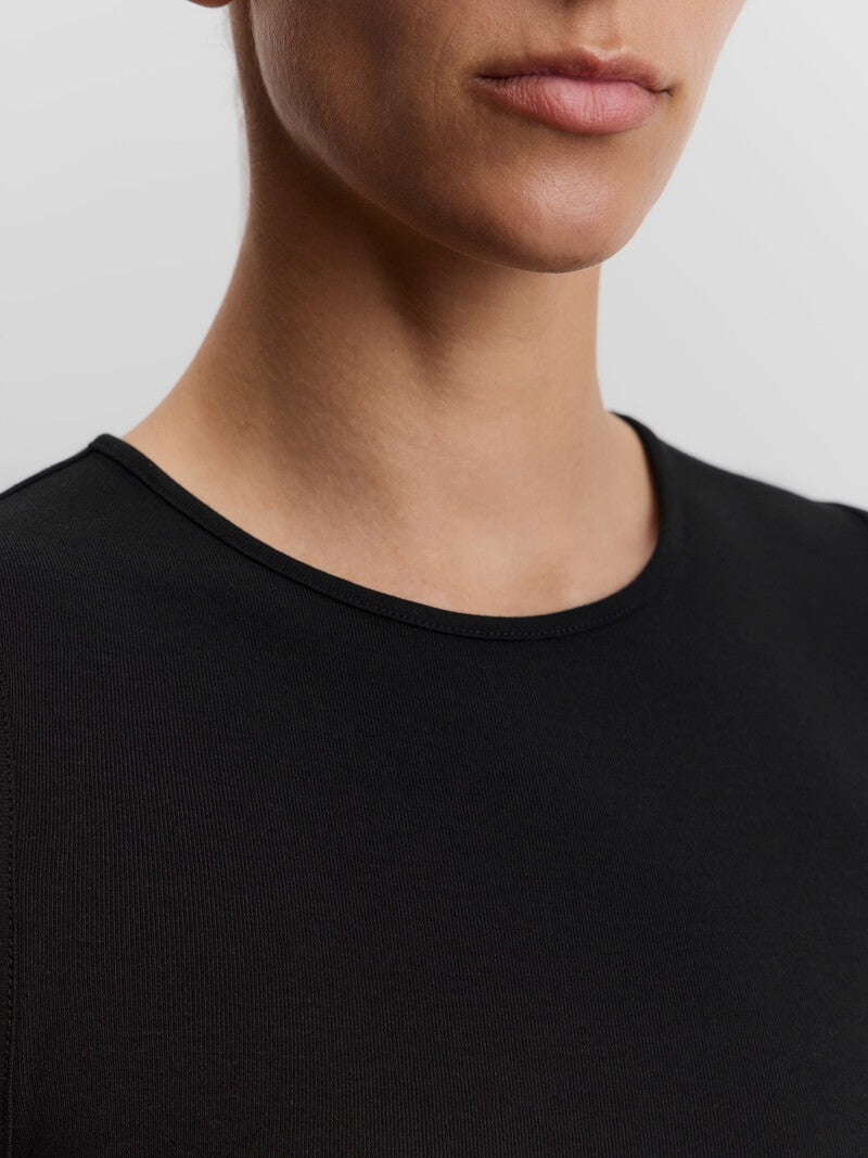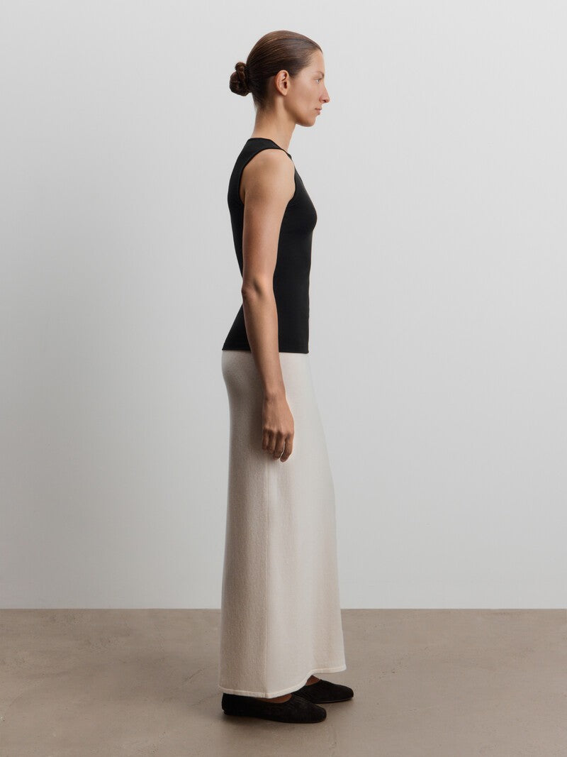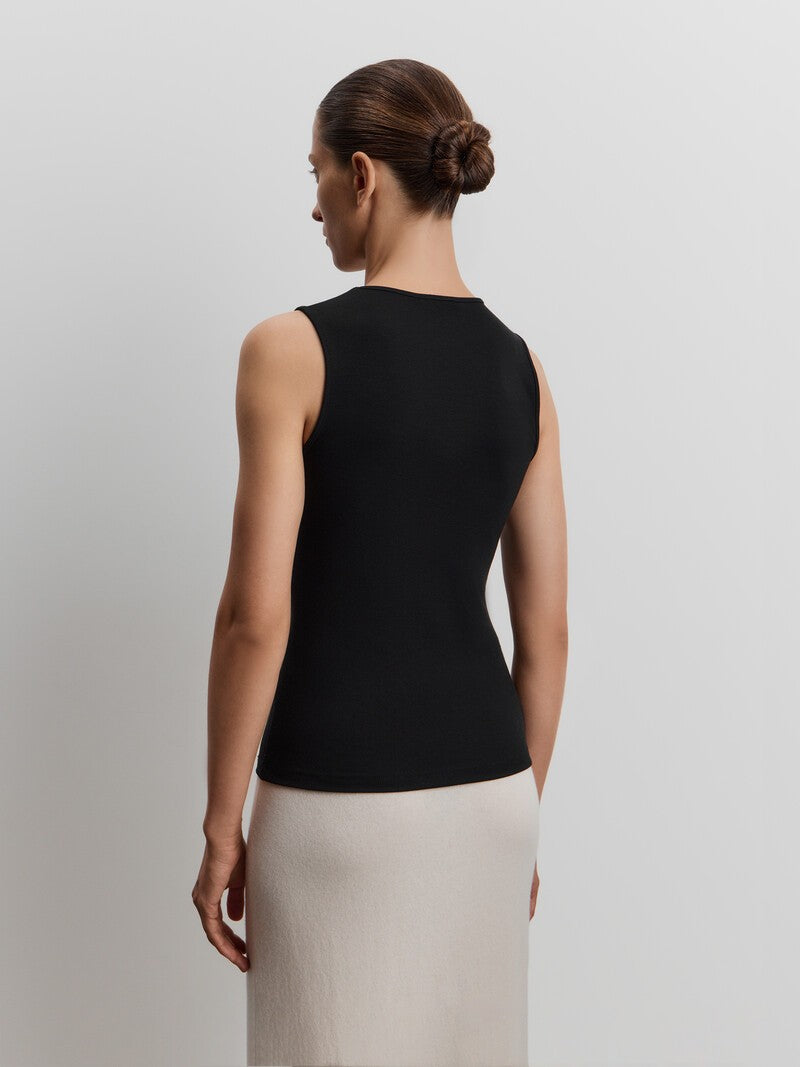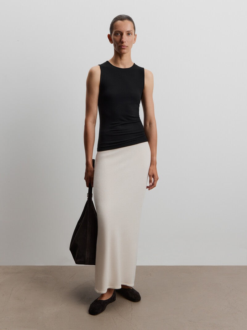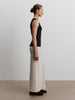 صُممت هذه البلوزة بدون أكمام بقصة دائرية ضيقة كلاسيكية وتأتي بحمالات كتف عريضة وتصميم طويل فلا تملي من ارتدائها. صُنعت من مزيج ناعم من الفيسكوز والصوف وتتميز بدرزات عمودية، ما يجعلها مثالية للتنسيق أسفل القطع.