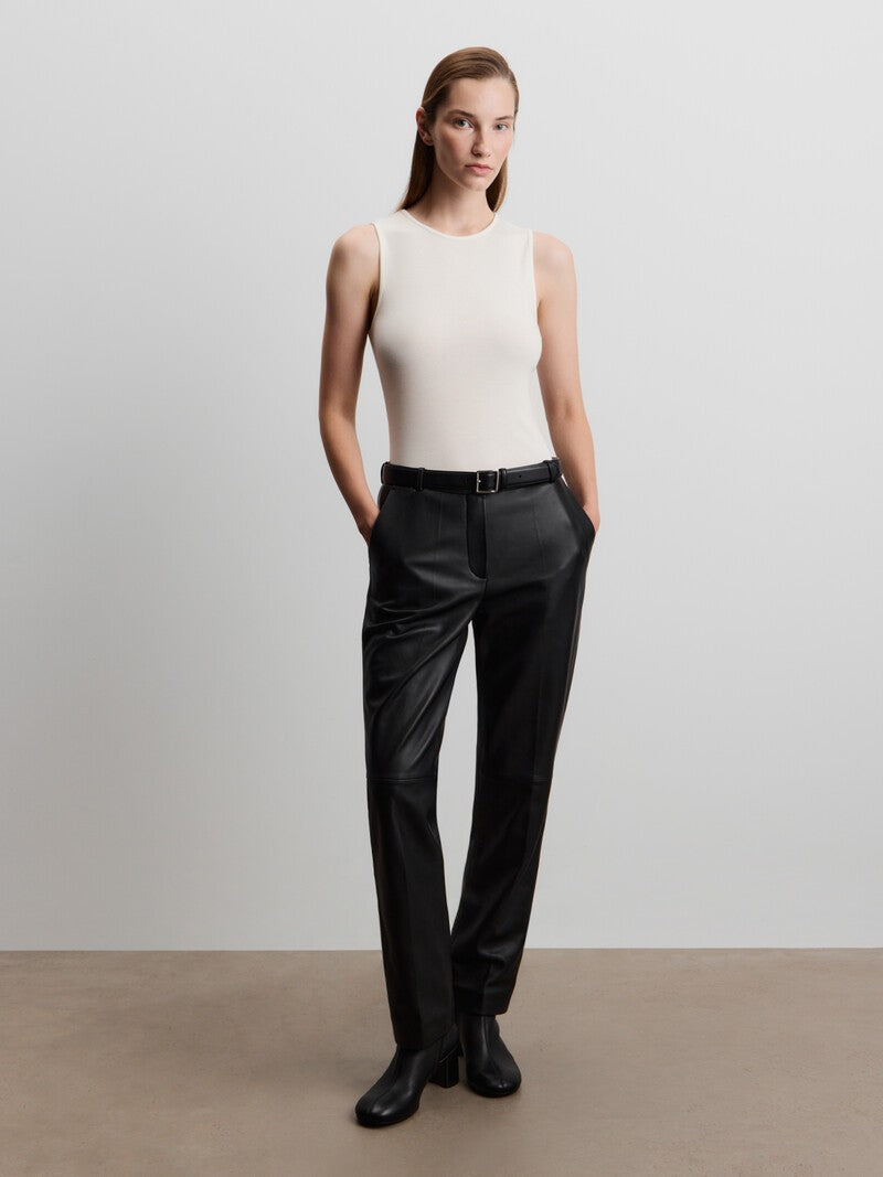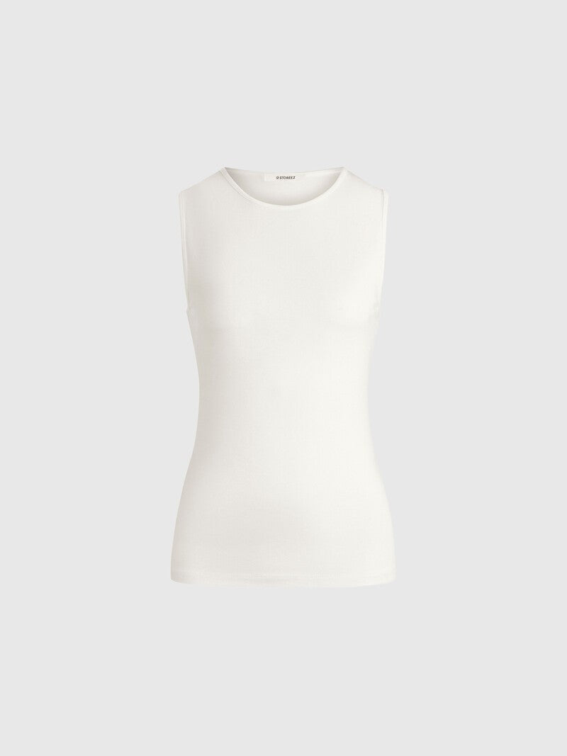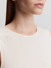 صُممت هذه البلوزة بدون أكمام بقصة دائرية ضيقة كلاسيكية وتأتي بحمالات كتف عريضة وتصميم طويل فلا تملي من ارتدائها. صُنعت من مزيج ناعم من الفيسكوز والصوف وتتميز بدرزات عمودية، ما يجعلها مثالية للتنسيق أسفل القطع.