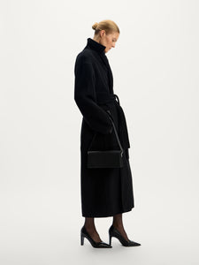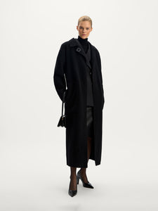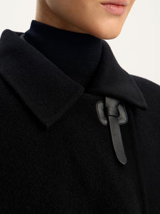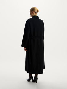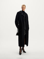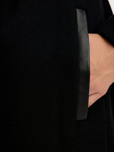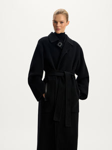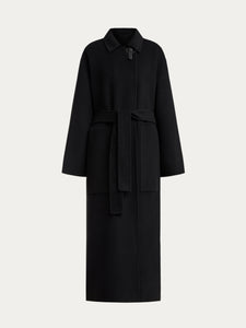 صُنع هذا المعطف من الكشمير وصوف المارينو الأسترالي وقد صُمم بقصة واسعة وكتفين منسدلين ويأتي بجيوب كبيرة مزينة بحواف جلدية. إنه محبوك بتقنية مزدوجة الجوانب ويتميز بقوام ناعم ودرزات مصقولة مكتملة من الجانبين بدون حاجة إلى البطانة.