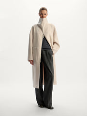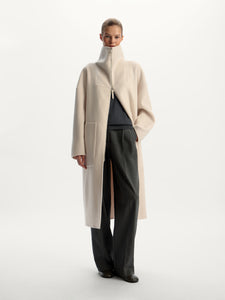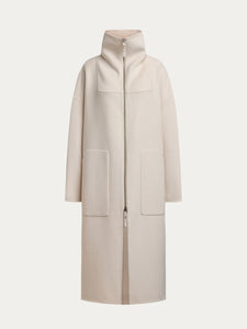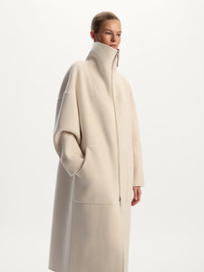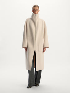 طبقة أنيقة مقاومة للطقس لأيام المدينة، مصنوعة من صوف الميرينو والكشمير بقصة كبيرة مع أكمام واسعة. تقنية الوجه المزدوج توفر نسيج ناعم وتطريزًا متقنًا على الجانبين دون الحاجة إلى بطانة.