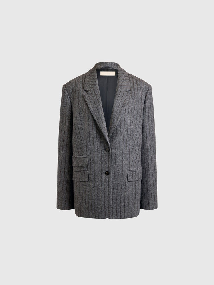 A new blazer in the collection, relaxed and inspired by menswear for an easy, cosy feel. Crafted from brushed pinstripe fabric in wool, viscose, and silk, it’s finished with a breathable lining for added warmth. Complete the set with the matching 12 STOREEZ trousers or skirt.