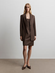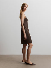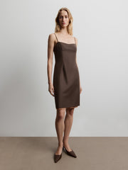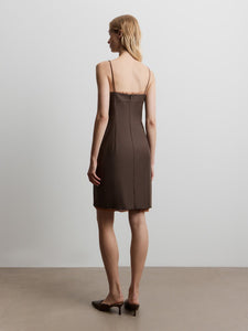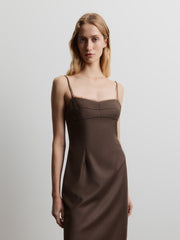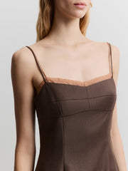 يُعتبر هذا الفستان خيارًا مثاليًا للأمسيات الأنيقة وهو مصنوع من الصوف الفاخر والحرير الشيفوني ويتميز بحواف من الدانتيل الناعم. يأتي بتصميم ضيق عند الصدر ليبرز منحنيات الجسم بكل روعة ويتميز بتفاصيل متباينة اللون لتعزيز الطابع الأنيق.
