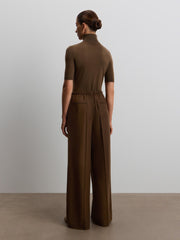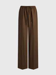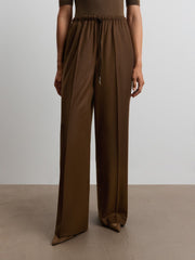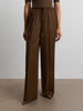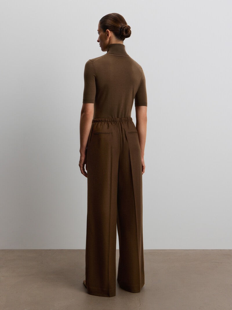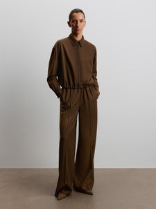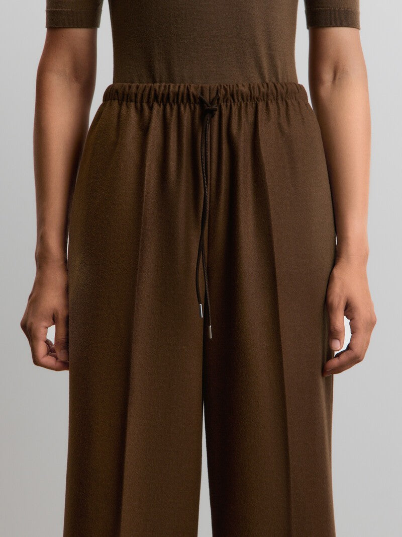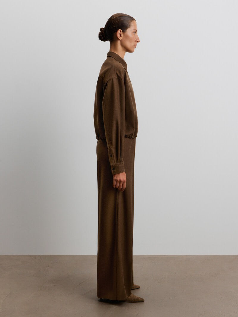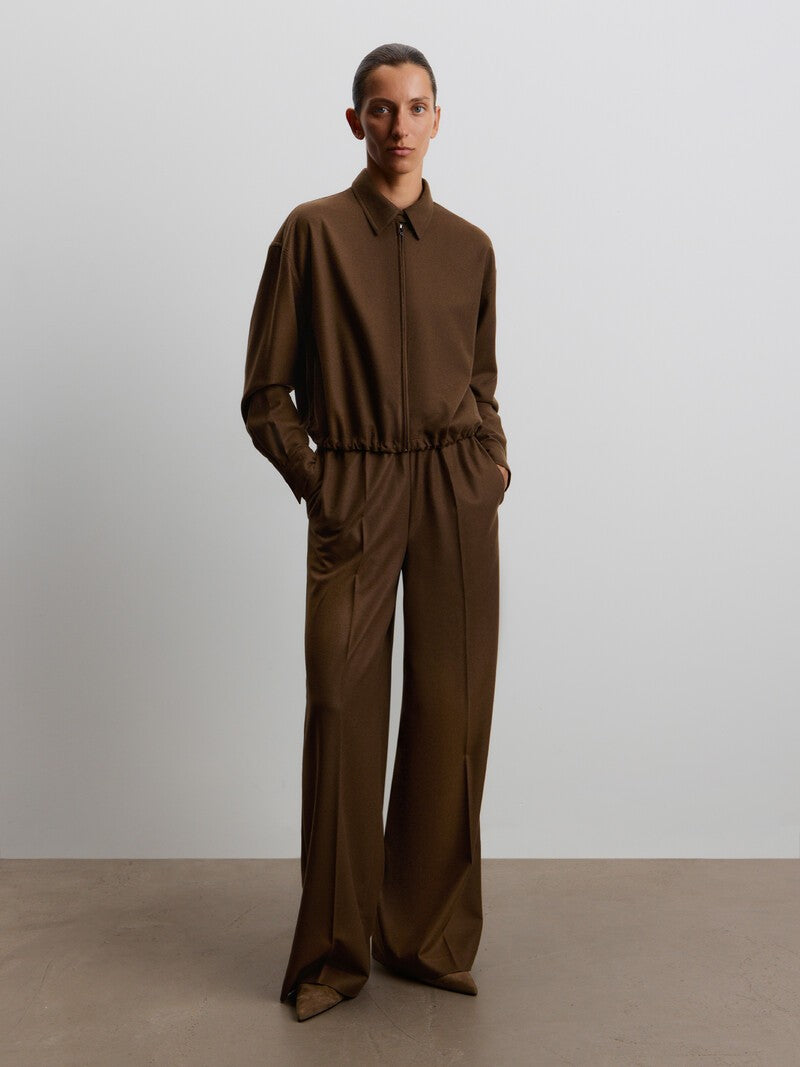 يدمج هذا البنطال ما بين الطابع المريح والدافئ، فهو مصنوع من الصوف الناعم بلمسة مصقولة حريرية شبيهة بالفلانيل. يأتي بخصر مطاطي ورباط شد من جلد السويد، كما يتميز بجيوب وكسرات حادة، لسهولة التنسيق لإطلالات العمل وعطلات نهاية الأسبوع. يمكن تنسيقه مع القميص المطابق من المجموعة.